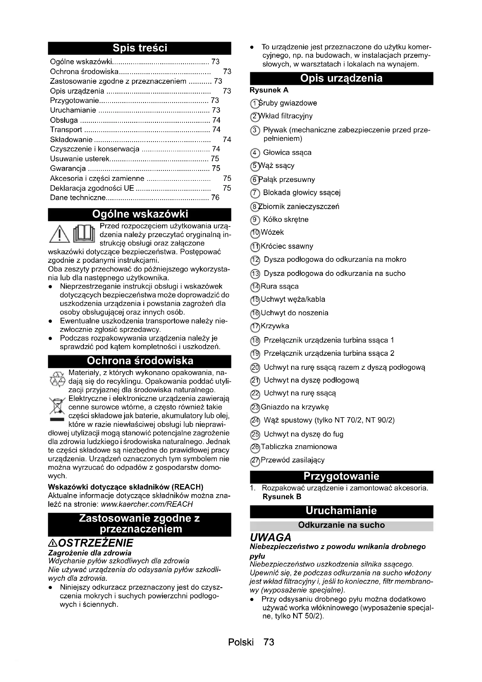 H05VV-F 2x1,0 H05VV-F 2x1,0 H05VV-F 2x1,0 Številka sestavnega dela (EU) 9.770-933.0 9.770-933.0 9.770-933.0 Dolžina kabla m 7,5 7,5 7,5Polski 73 Spis treści Ogólne wskazówki Przed rozpoczęciem użytkowania urzą- dzenia należy przeczytać oryginalną in- strukcję obsługi oraz załączone wskazówki dotyczące bezpieczeństwa. Postępować zgodnie z podanymi instrukcjami. Oba zeszyty przechować do późniejszego wykorzysta- nia lub dla następnego użytkownika. ● Nieprzestrzeganie instrukcji obsługi i wskazówek dotyczących bezpieczeństwa może doprowadzić do uszkodzenia urządzenia i powstania zagrożeń dla osoby obsługującej oraz innych osób. ● Ewentualne uszkodzenia transportowe należy nie- zwłocznie zgłosić sprzedawcy. ● Podczas rozpakowywania urządzenia należy je sprawdzić pod kątem kompletności i uszkodzeń. Ochrona środowiska Materiały, z których wykonano opakowania, na- dają się do recyklingu. Opakowania poddać utyli- zacji przyjaznej dla środowiska naturalnego. Elektryczne i elektroniczne urządzenia zawierają cenne surowce wtórne, a często również takie części składowe jak baterie, akumulatory lub olej, które w razie niewłaściwej obsługi lub nieprawi- dłowej utylizacji mogą stanowić potencjalne zagrożenie dla zdrowia ludzkiego i środowiska naturalnego. Jednak te części składowe są niezbędne do prawidłowej pracy urządzenia. Urządzeń oznaczonych tym symbolem nie można wyrzucać do odpadów z gospodarstw domo- wych. Wskazówki dotyczące składników (REACH) Aktualne informacje dotyczące składników można zna- leźć na stronie: www.kaercher.com/REACH Zastosowanie zgodne z przeznaczeniem 몇 OSTRZEŻENIE Zagrożenie dla zdrowia Wdychanie pyłów szkodliwych dla zdrowia Nie używać urządzenia do odsysania pyłów szkodli- wych dla zdrowia. ● Niniejszy odkurzacz przeznaczony jest do czysz- czenia mokrych i suchych powierzchni podłogo- wych i ściennych. ● To urządzenie jest przeznaczone do użytku komer- cyjnego, np. na budowach, w instalacjach przemy- słowych, w warsztatach i lokalach na wynajem. Opis urządzenia Rysunek A 1 Śruby gwiazdowe 2 Wkład filtracyjny 3 Pływak (mechaniczne zabezpieczenie przed prze- pełnieniem) 4 Głowica ssąca 5 Wąż ssący 6 Pałąk przesuwny 7 Blokada głowicy ssącej 8 Zbiornik zanieczyszczeń 9 Kółko skrętne 10 Wózek 11 Króciec ssawny 12 Dysza podłogowa do odkurzania na mokro 13 Dysza podłogowa do odkurzania na sucho 14 Rura ssąca 15 Uchwyt węża/kabla 16 Uchwyt do noszenia 17 Krzywka 18 Przełącznik urządzenia turbina ssąca 1 19 Przełącznik urządzenia turbina ssąca 2 20 Uchwyt na rurę ssącą razem z dyszą podłogową 21 Uchwyt na dyszę podłogową 22 Uchwyt na rurę ssącą 23 Gniazdo na krzywkę 24 Wąż spustowy (tylko NT 70/2, NT 90/2) 25 Uchwyt na dyszę do fug 26 Tabliczka znamionowa 27 Przewód zasilający Przygotowanie