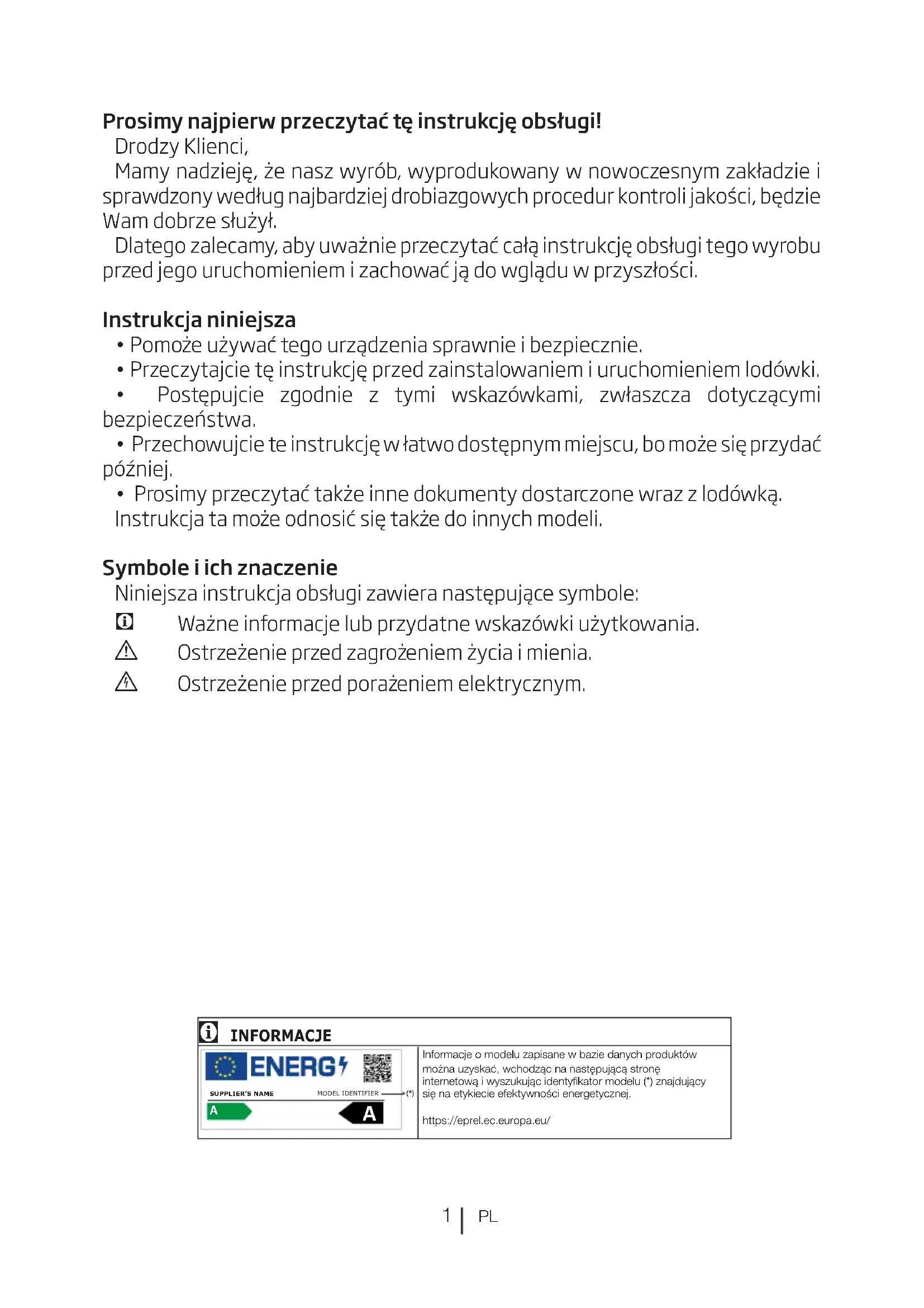 - Przeczytajcie tę instrukcję przed zainstalowaniem i uruchomieniem lodówki.