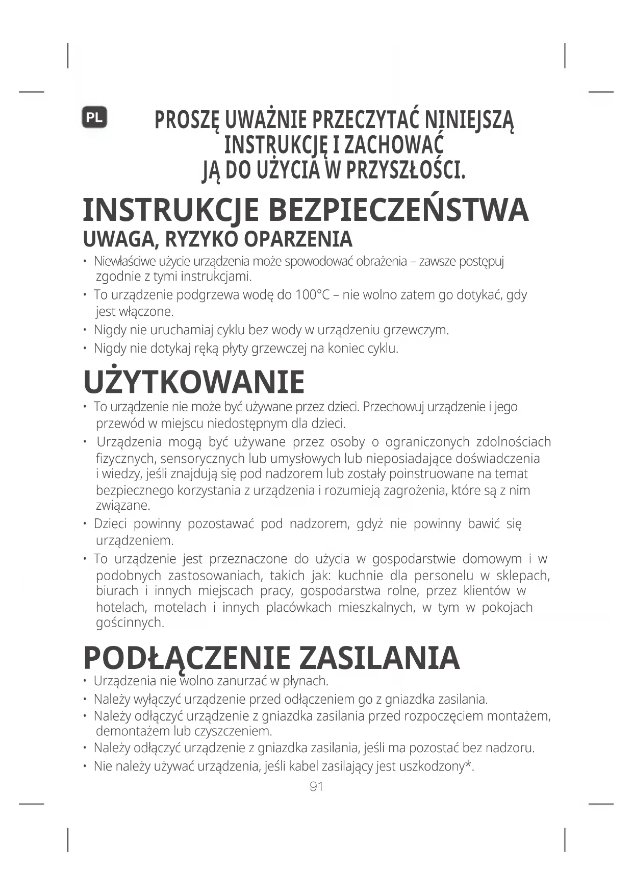 - To urządzenie podgrzewa wodę do 100°C – nie wolno zatem go dotykać, gdy jest włączone.