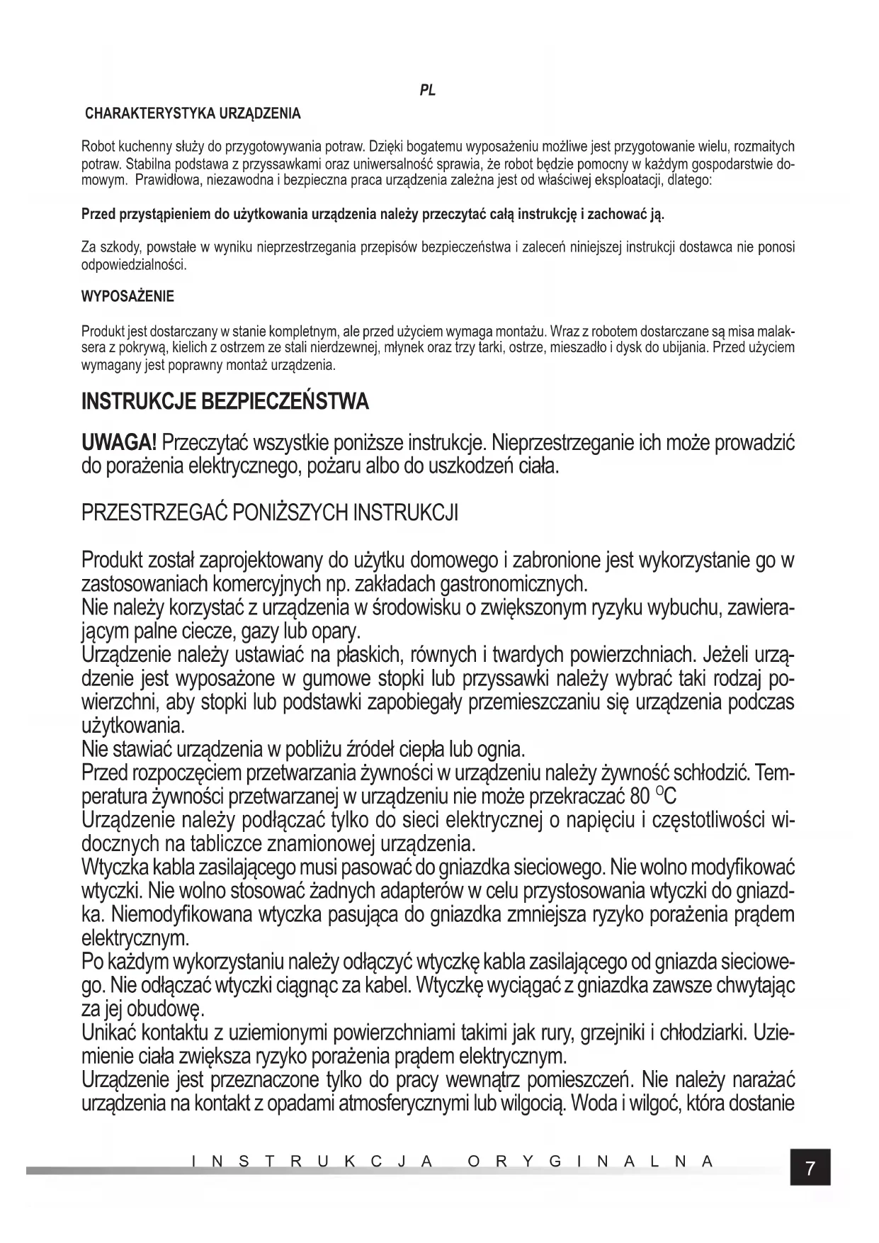 UWAGA! Podczas wszystkich czynności związanych z montażem i demontażem wyposażenia należy wyłączyć urządzenie i odłączyć wtyczkę kabla zasilającego od gniazdka sieciowego. Przygotowanie do pracy Produkt wyjąc z opakowania, usunąć wszystkie jego elementy, a następnie wszystkie elementy mające kontakt z żywnością umyć zgodnie ze wskazówkami punktu „Konserwacja produktu”.INSTRUKCJA ORYGINALNA