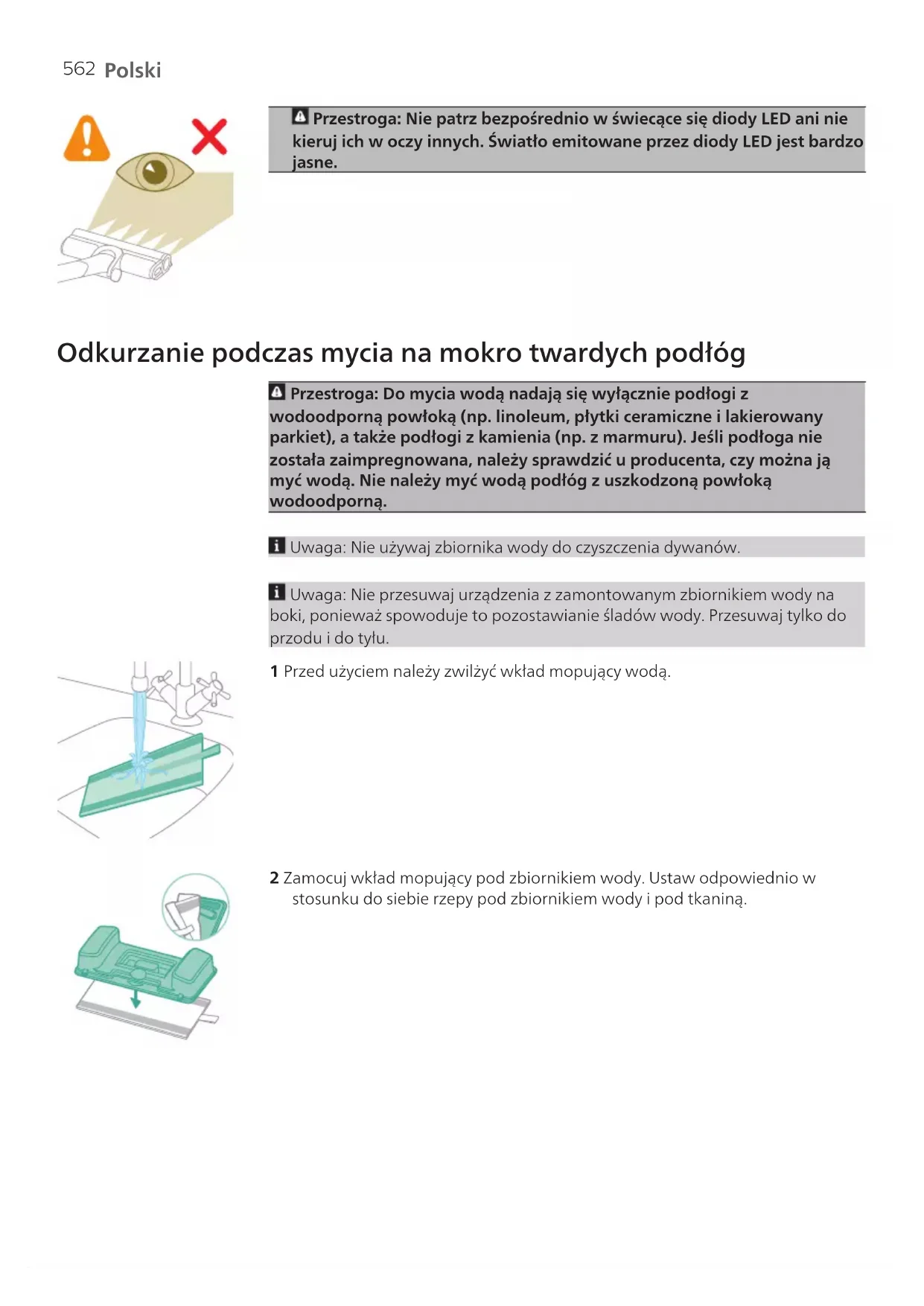 3 Urządzenie jest zaprojektowane tak, aby osiągnąć pełne naładowanie w ciągu 6 godzin. Możesz sprawdzać proces ładowani na ekranie. Gdy urządzenie jest wpełni naładowane, na ekranie pojawi się wartość 100%. Po kilku minutach wyświetlacz się wyłączy. Używanie urządzenia Montaż urządzenia 1 Zamocuj odkurzacz do rury. Zamocowanie powinno być potwierdzone słyszalnym kliknięciem. 2 Zamocuj rurę do ssawki. Zamocowanie powinno być potwierdzone słyszalnym kliknięciem.561 Polski Odkurzanie miękkich itwardych podłóg 1 Naciśnij wyłącznik, aby włączyć urządzenie. Uwaga: Aby wyłączyć urządzenie, ponownie naciśnij wyłącznik. 2 Używaj przycisków + i –, aby przełączać między trzema różnymi ustawieniami mocy. E – tryb Eco N – tryb normalny T – tryb Turbo 3 Odkurzaczem można czyścić zarówno twarde, jak i miękkie podłogi. Po włączeniu funkcji rozpoznawania rodzaju podłogi urządzenie rozpoznaje rodzaj podłogi i automatycznie optymalizuje swoją wydajność w ramach wybranych ustawień mocy. Sprawdź poniżej, jak dostosować ustawienia, aby wyłączyć tę funkcję. Ostrzeżenie: nie wciągaj odkurzaczem wody ani innych płynów.562 Polski Przestroga: Nie patrz bezpośrednio wświecące się diody LED ani nie kieruj ich woczy innych. Światło emitowane przez diody LED jest bardzo jasne. Odkurzanie podczas mycia na mokro twardych podłóg Przestroga: Do mycia wodą nadają się wyłącznie podłogi z wodoodporną powłoką (np. linoleum, płytki ceramiczne i lakierowany parkiet), a także podłogi z kamienia (np. z marmuru). Jeśli podłoga nie została zaimpregnowana, należy sprawdzić u producenta, czy można ją myć wodą. Nie należy myć wodą podłóg z uszkodzoną powłoką wodoodporną. Uwaga: Nie używaj zbiornika wody do czyszczenia dywanów. Uwaga: Nie przesuwaj urządzenia z zamontowanym zbiornikiem wody na boki, ponieważ spowoduje to pozostawianie śladów wody. Przesuwaj tylko do przodu ido tyłu. 1 Przed użyciem należy zwilżyć wkład mopujący wodą. 2 Zamocuj wkład mopujący pod zbiornikiem wody. Ustaw odpowiednio w stosunku do siebie rzepy pod zbiornikiem wody i pod tkaniną.563 Polski MAX 50 °C 3 Napełnij zbiornik wodą o temperaturze poniżej 50°C. 10 ml 4 (Opcjonalnie) Jeśli chcesz dodać płynnego środka do czyszczenia podłóg do zbiornika wody, użyj niskopieniącego lub niepieniącego się środka, który jest rozpuszczalny w wodzie. Zalecamy środek Philips do czyszczenia podłóg XV1792. Dodaj do wody tylko kilka kropel płynu myjącego. 5 Zamknij zbiornik wody w prawidłowy sposób. 6 Podłącz przygotowany zbiornik z wodą do ssawki i możesz zaczynać. Upewnij się, że kierunek zbiornika na wodę jest właściwy. 7 Naciśnij wyłącznik, aby włączyć urządzenie. Za pomocą modułu czyszczenia na mokro założonego na ssawkę można skutecznie czyścić twarde podłogi.564 Polski Uwaga: Moduł czyszczenia na mokro nie jest przystosowany do miękkich podłóg, np. dywanów. Uwaga: Nie używaj ssawki do czyszczenia na mokro bez założonego zbiornika wody. Przestroga: Modułu czyszczenia na mokro nie należy używać do zbierania rozlanej wody. Wskazówki iinne ważne informacje