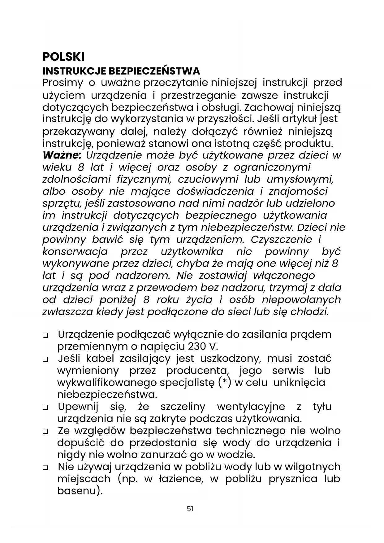 Prosimy o uważne przeczytanie niniejszej instrukcji przed użyciem urządzenia i przestrzeganie zawsze instrukcji dotyczących bezpieczeństwa i obsługi. Zachowaj niniejszą instrukcję do wykorzystania w przyszłości. Jeśli artykuł jest przekazywany dalej, należy dołączyć również niniejszą instrukcję, ponieważ stanowi ona istotną część produktu. Ważne: Urządzenie może być użytkowane przez dzieci w wieku 8 lat i więcej oraz osoby z ograniczonymi zdolnościami fizycznymi, czuciowymi lub umysłowymi, albo osoby nie mające doświadczenia i znajomości sprzętu, jeśli zastosowano nad nimi nadzór lub udzielono im instrukcji dotyczących bezpiecznego użytkowania urządzenia i związanych z tym niebezpieczeństw. Dzieci nie powinny bawić się tym urządzeniem. Czyszczenie i konserwacja przez użytkownika nie powinny być wykonywane przez dzieci, chyba że mają one więcej niż 8 lat i są pod nadzorem. Nie zostawiaj włączonego urządzenia wraz z przewodem bez nadzoru, trzymaj z dala od dzieci poniżej 8 roku życia i osób niepowołanych zwłaszcza kiedy jest podłączone do sieci lub się chłodzi. ❑ Urządzenie podłączać wyłącznie do zasilania prądem przemiennym o napięciu 230 V. ❑ Jeśli kabel zasilający jest uszkodzony, musi zostać wymieniony przez producenta, jego serwis lub wykwalifikowanego specjalistę (*) w celu uniknięcia niebezpieczeństwa. ❑ Upewnij się, że szczeliny wentylacyjne z tyłu urządzenia nie są zakryte podczas użytkowania. ❑ Ze względów bezpieczeństwa technicznego nie wolno dopuścić do przedostania się wody do urządzenia i nigdy nie wolno zanurzać go w wodzie. ❑ Nie używaj urządzenia w pobliżu wody lub w wilgotnych miejscach (np. w łazience, w pobliżu prysznica lub basenu).52