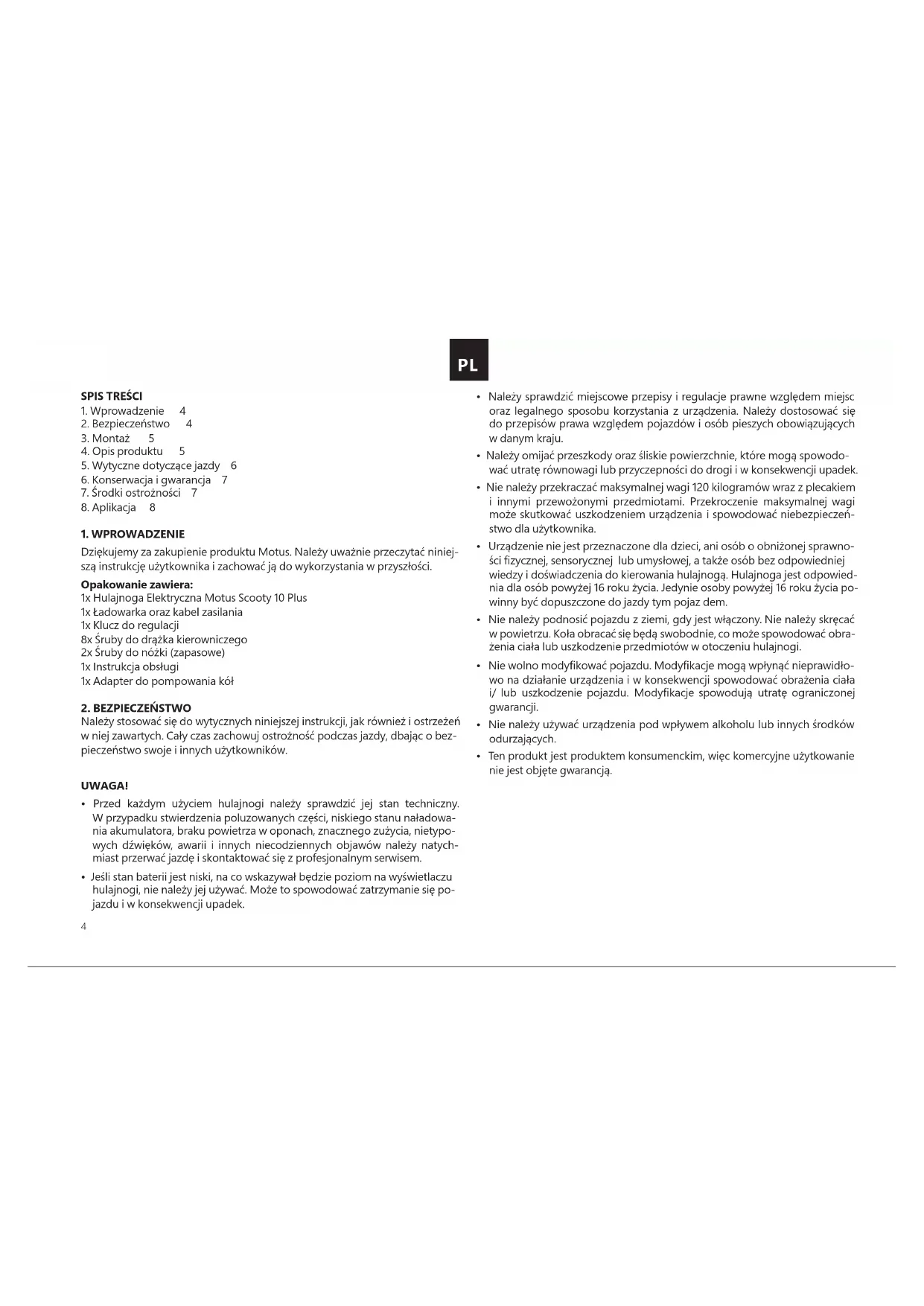 Dziękujemy za zakupienie produktu Motus. Należy uważnie przeczytać niniej- szą instrukcję użytkownika i zachować ją do wykorzystania w przyszłości. Opakowanie zawiera: 1x Hulajnoga Elektryczna Motus Scooty 10 Plus 1x Ładowarka oraz kabel zasilania 1x Klucz do regulacji 8x Śruby do drążka kierowniczego 2x Śruby do nóżki (zapasowe) 1x Instrukcja obsługi 1x Adapter do pompowania kół