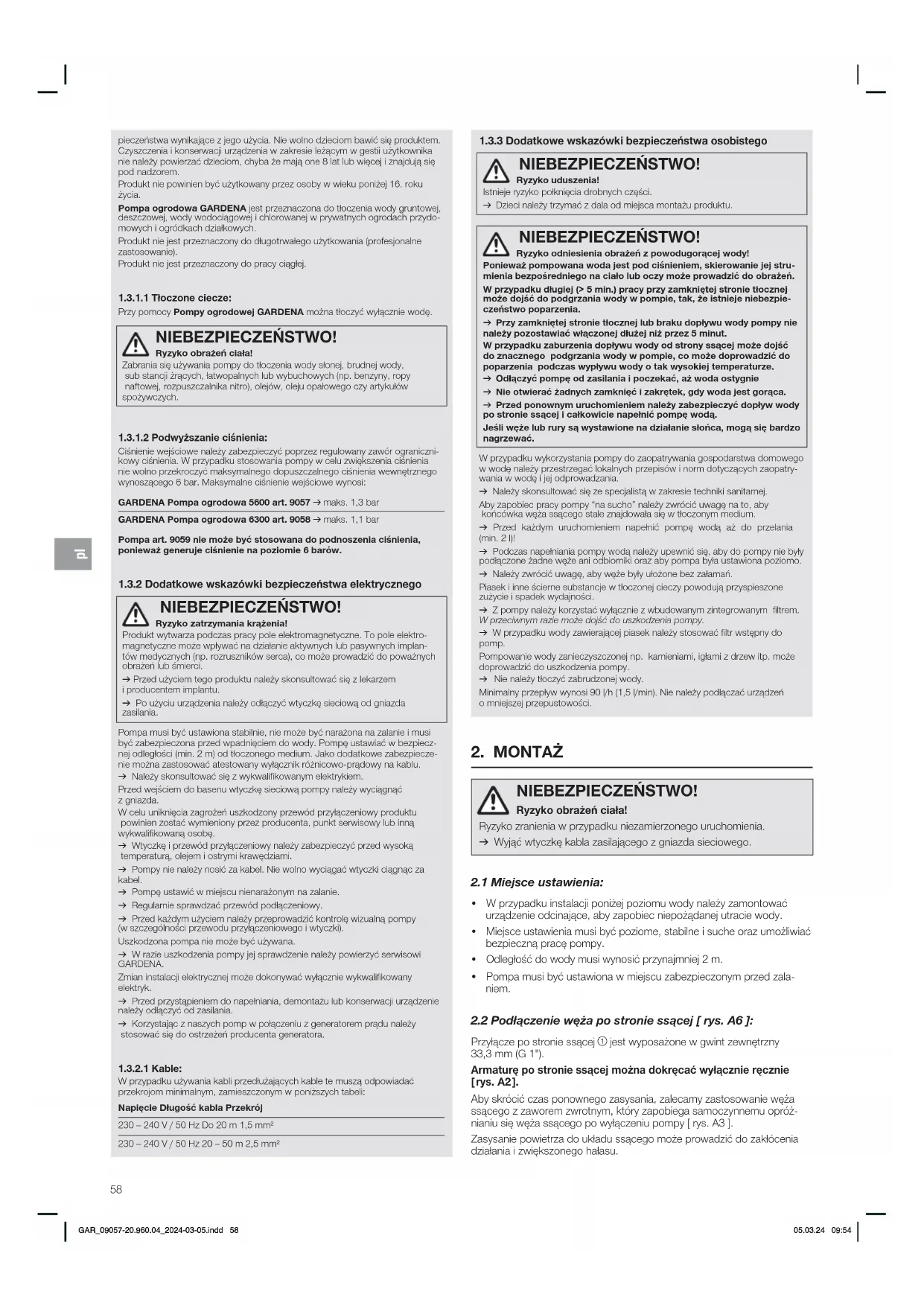 NIEBEZPIECZEŃSTWO! Ryzyko zatrzymania krążenia!Produkt wytwarza podczas pracy pole elektromagnetyczne. To pole elektro-magnetyczne może wpływać na działanie aktywnych lub pasywnych implan-tówmedycznych (np. rozruszników serca), co może prowadzić do poważnych obrażeń lub śmierci.v Przed użyciem tego produktu należy skonsultować się z lekarzem i producentem implantu.v Po użyciu urządzenia należy odłączyć wtyczkę sieciową od gniazda zasilania.Pompa musi być ustawiona stabilnie, nie może być narażona na zalanie i musi być zabezpieczona przed wpadnięciem do wody. Pompę ustawiać w bezpiecz-nejodległości (min. 2 m) od tłoczonego medium. Jako dodatkowe zabezpiecze-niemożna zastosować atestowany wyłącznik różnicowo-prądowy na kablu.v Należy skonsultować się z wykwalifikowanym elektrykiem.Przed wejściem do basenu wtyczkę sieciową pompy należy wyciągnąć z gniazda.W celu uniknięcia zagrożeń uszkodzony przewód przyłączeniowy produktu powinien zostać wymieniony przez producenta, punkt serwisowy lub inną wykwalifikowaną osobę.v Wtyczkę i przewód przyłączeniowy należy zabezpieczyć przed wysoką temperaturą, olejem i ostrymi krawędziami.v Pompy nie należy nosić za kabel. Nie wolno wyciągać wtyczki ciągnąc za kabel.v Pompę ustawić w miejscu nienarażonym na zalanie.v Regularnie sprawdzać przewód podłączeniowy.v Przed każdym użyciem należy przeprowadzić kontrolę wizualną pompy (w szczególności przewodu przyłączeniowego i wtyczki).Uszkodzona pompa nie może być używana.v W razie uszkodzenia pompy jej sprawdzenie należy powierzyć serwisowi GARDENA.Zmian instalacji elektrycznej może dokonywać wyłącznie wykwalifikowany elektryk.v Przed przystąpieniem do napełniania, demontażu lub konserwacji urządzenie należy odłączyć od zasilania.v Korzystając z naszych pomp w połączeniu z generatorem prądu należy stosować się do ostrzeżeń producenta generatora.1.3.2.1 Kable:W przypadku używania kabli przedłużających kable te muszą odpowiadać przekrojom minimalnym, zamieszczonym w poniższych tabeli:Napięcie Długość kabla Przekrój230 – 240 V / 50 Hz Do 20 m 1,5 mm²230 – 240 V / 50 Hz 20 – 50 m 2,5 mm²