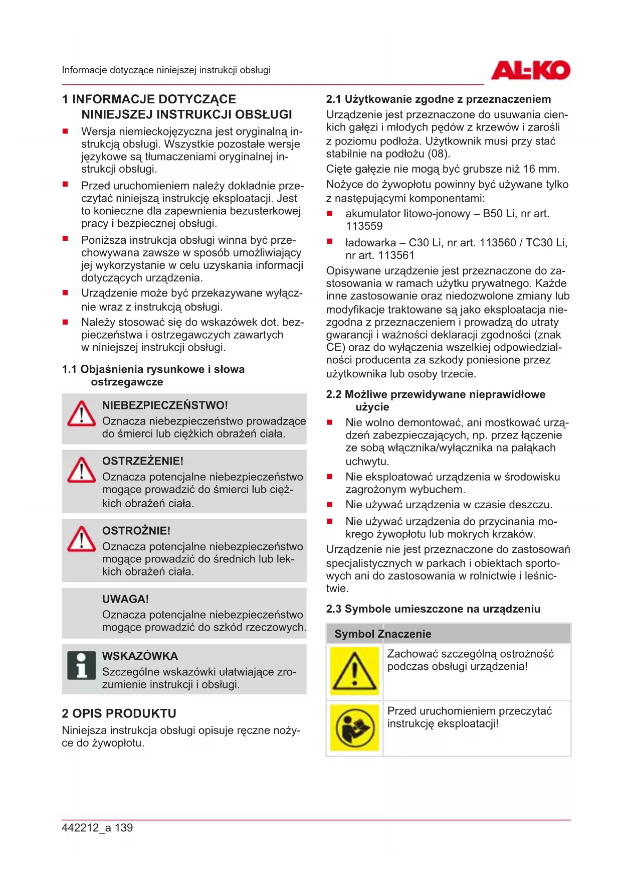 Wyszczerbienia wnożu tnącym. Skontaktuj się z serwisem AL-KO. Nieczyste cięcie gałęzi. Ga- łęzie często zakleszczają się wnożu tnącym. Nóż tnący jest tępy. Skontaktuj się z serwisem AL-KO. Luz ślizgowy noża tnącego jest zbyt duży. Skontaktuj się z serwisem AL-KO. Silnik pracuje, ale nóż tnący się nie porusza. Błąd urządzenia Skontaktuj się z serwisem AL-KO. Urządzenie wibruje wniety- powy sposób. Błąd urządzenia Skontaktuj się z serwisem AL-KO. Wyraźny spadek czasu pracy akumulatora. Upłynął czas eksploatacji akumulatora. Wymień akumulator. Używać tylko oryginalnych akcesoriów producenta urządzenia. Nie można naładować aku- mulatora. Styki akumulatora są zabru- dzone. Skontaktuj się z serwisem AL-KO. Uszkodzenie akumulatora lub ładowarki. Zamówić części zamienne. Skontaktuj się z serwisem AL-KO. Akumulator jest zbyt gorący. Zaczekać, aż akumulator ostygnie.442212_a 153 Gwarancja WSKAZÓWKA W przypadku zakłóceń, które nie zostały wymienione w tej tabeli, lub takich, których nie można usunąć we własnym zakresie, należy skontaktować się z naszym działem obsługi klienta. 17 GWARANCJA Ewentualne wady materiałowe lub produkcyjne wurządzeniu usuwamy przed upływem ustawowego okresu przedawnienia roszczeń ztytułu rękojmi za wady fizyczne, dokonując wedle naszego uznania naprawy lub wymiany produktu. Okres przedawnienia ustalany jest zgodnie zprawem obowiązującym wkraju, wktórym produkt został zakupiony. Gwarancja obowiązuje tylko wprzypadku: