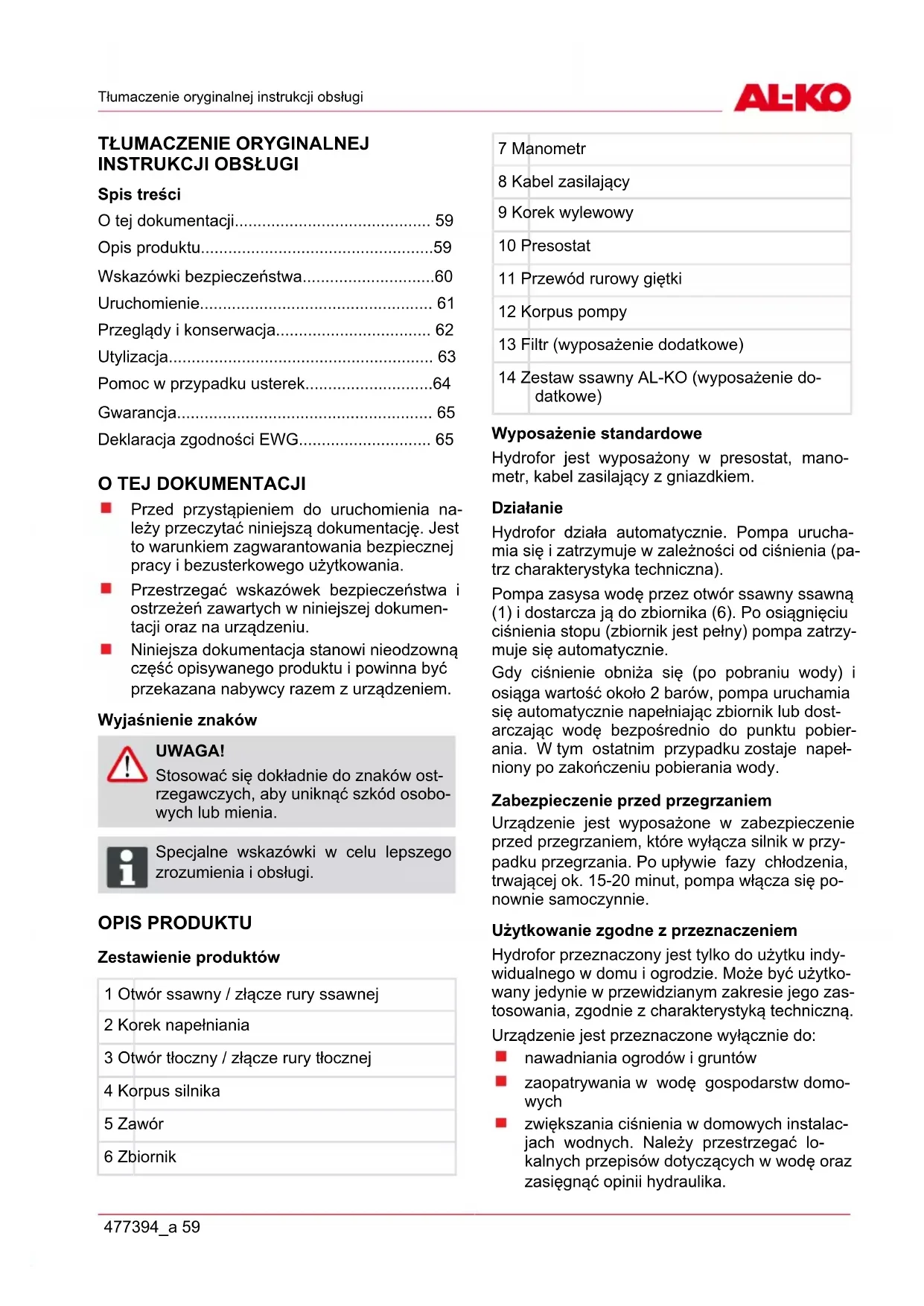 Przed przystąpieniem do uruchomienia na- leży przeczytać niniejszą dokumentację. Jest to warunkiem zagwarantowania bezpiecznej pracy i bezusterkowego użytkowania. Przestrzegać wskazówek bezpieczeństwa i ostrzeżeń zawartych w niniejszej dokumen- tacji oraz na urządzeniu. Niniejsza dokumentacja stanowi nieodzowną część opisywanego produktu i powinna być przekazana nabywcy razem z urządzeniem. Wyjaśnienie znaków UWAGA! Stosować się dokładnie do znaków ost- rzegawczych, aby uniknąć szkód osobo- wych lub mienia. ADVICE Specjalne wskazówki w celu lepszego zrozumienia i obsługi. OPIS PRODUKTU Zestawienie produktów 1 Otwór ssawny / złącze rury ssawnej 2 Korek napełniania 3 Otwór tłoczny / złącze rury tłocznej 4 Korpus silnika 5 Zawór 6 Zbiornik 7 Manometr 8 Kabel zasilający 9 Korek wylewowy 10 Presostat 11 Przewód rurowy giętki 12 Korpus pompy 13 Filtr (wyposażenie dodatkowe) 14 Zestaw ssawny AL-KO (wyposażenie do- datkowe) Wyposażenie standardowe Hydrofor jest wyposażony w presostat, mano- metr, kabel zasilający z gniazdkiem. Działanie Hydrofor działa automatycznie. Pompa urucha- mia się i zatrzymuje w zależności od ciśnienia (pa- trz charakterystyka techniczna). Pompa zasysa wodę przez otwór ssawny ssawną (1) i dostarcza ją do zbiornika (6). Po osiągnięciu ciśnienia stopu (zbiornik jest pełny) pompa zatrzy- muje się automatycznie. Gdy ciśnienie obniża się (po pobraniu wody) i osiąga wartość około 2 barów, pompa uruchamia się automatycznie napełniając zbiornik lub dost- arczając wodę bezpośrednio do punktu pobier- ania. W tym ostatnim przypadku zostaje napeł- niony po zakończeniu pobierania wody. Zabezpieczenie przed przegrzaniem Urządzenie jest wyposażone w zabezpieczenie przed przegrzaniem, które wyłącza silnik w przy- padku przegrzania. Po upływie fazy chłodzenia, trwającej ok. 15-20 minut, pompa włącza się po- nownie samoczynnie. Użytkowanie zgodne z przeznaczeniem Hydrofor przeznaczony jest tylko do użytku indy- widualnego w domu i ogrodzie. Może być użytko- wany jedynie w przewidzianym zakresie jego zas- tosowania, zgodnie z charakterystyką techniczną. Urządzenie jest przeznaczone wyłącznie do: nawadniania ogrodów i gruntów zaopatrywania w wodę gospodarstw domo- wych zwiększania ciśnienia w domowych instalac- jach wodnych. Należy przestrzegać lo- kalnych przepisów dotyczących w wodę oraz zasięgnąć opinii hydraulika.pl Opis produktu 60 477394_a Hydrofor przeznaczony jest wyłącznie do pom- powania następujących cieczy: woda czysta woda deszczowa Możliwe nieprawidłowe użycie Hydrofor nie może pracować w trybie ciągłym. Pompa nie nadaje się do pompowania: wody pitnej wody słonej żywności płynnej substancji korozyjnych, chemicznych cieczy kwaśnych, łatwo palnych, wybuchow- ych lub lotnych cieczy o temperaturze powyżej 35 °C wody zapiaszczonej lub cieczy ściernych