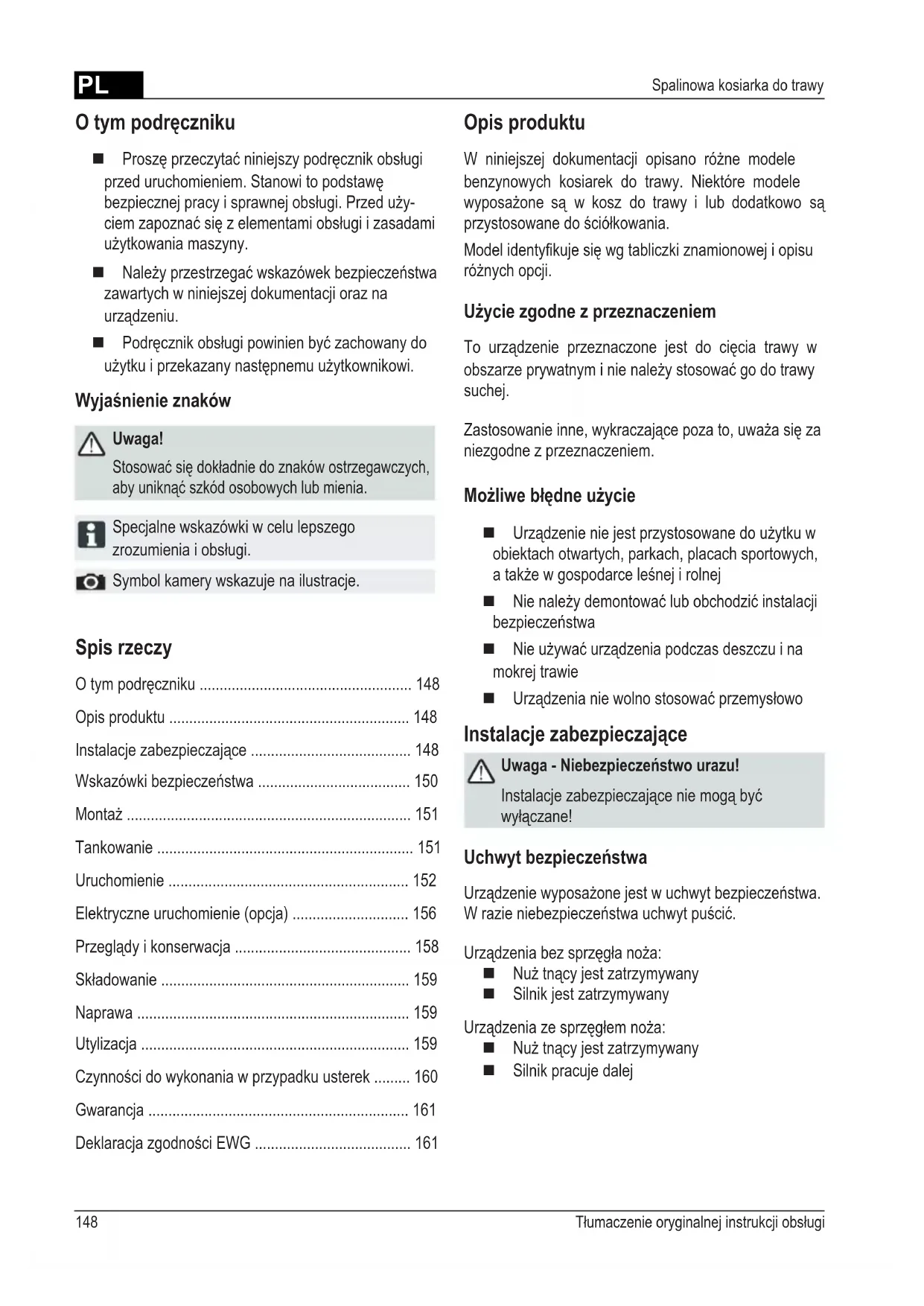 - Deklaracja zgodności EWG O tym podręczniku Proszę przeczytać niniejszy podręcznik obsługi przed uruchomieniem. Stanowi to podstawę bezpiecznej pracy i sprawnej obsługi. Przed uży- ciem zapoznać się z elementami obsługi i zasadami użytkowania maszyny. Należy przestrzegać wskazówek bezpieczeństwa zawartych w niniejszej dokumentacji oraz na urządzeniu. Podręcznik obsługi powinien być zachowany do użytku i przekazany następnemu użytkownikowi. Wyjaśnienie znaków Uwaga! Stosować się dokładnie do znaków ostrzegawczych, aby uniknąć szkód osobowych lub mienia. Specjalne wskazówki w celu lepszego zrozumienia i obsługi. Symbol kamery wskazuje na ilustracje. Opis produktu W niniejszej dokumentacji opisano różne modele benzynowych kosiarek do trawy. Niektóre modele wyposażone są w kosz do trawy i lub dodatkowo są przystosowane do ściółkowania. Model identykuje się wg tabliczki znamionowej i opisu różnych opcji. Użycie zgodne z przeznaczeniem To urządzenie przeznaczone jest do cięcia trawy w obszarze prywatnym i nie należy stosować go do trawy suchej. Zastosowanie inne, wykraczające poza to, uważa się za niezgodne z przeznaczeniem. Możliwe błędne użycie Urządzenie nie jest przystosowane do użytku w obiektach otwartych, parkach, placach sportowych, a także w gospodarce leśnej i rolnej Nie należy demontować lub obchodzić instalacji bezpieczeństwa Nie używać urządzenia podczas deszczu i na mokrej trawie Urządzenia nie wolno stosować przemysłowo Instalacje zabezpieczające Uwaga - Niebezpieczeństwo urazu! Instalacje zabezpieczające nie mogą być wyłączane! Uchwyt bezpieczeństwa Urządzenie wyposażone jest w uchwyt bezpieczeństwa. W razie niebezpieczeństwa uchwyt puścić. Urządzenia bez sprzęgła noża: Nuż tnący jest zatrzymywany Silnik jest zatrzymywany Urządzenia ze sprzęgłem noża: Nuż tnący jest zatrzymywany Silnik pracuje dalejPL 149470 591_c 1 Linka startowa 9 Ustawienie wysokości cięcia* 2 Uruchomienie, zatrzymanie* 10 Sprzęgło noża* 3 Napęd kół* 11 Przekładnia kombinowana* 4 Uchwyt bezpieczeństwa 12 Instrukcja obsługi 5 Ergonomiczne ustawianie wysokości* 13 Wkładka wyrzutu* 6 Wskaźnik stanu napełnienia* 14 Osłona zamykająca* 7 Osłona przeciwuderzeniowa* 15 Zestaw do ściółki* 8 Kosz do trawy* * w zależności od wyposażenia Symbole na urządzeniu Uwaga! Szczególna ostrożność przy manipulacji. Przed rozpoczęciem pracy przy mechanizmie tnącym zdjąć fajkę świecową! Przed uruchomieniem przeczytać instrukcję obsługi! Zwolnić hamulec silnika. Osoby trzecie nie mogą znajdować się w stree zagrożenia! Włączyć napęd kół. Ręce i nogi trzymać z dala od mechanizmu tnącego! p. 161