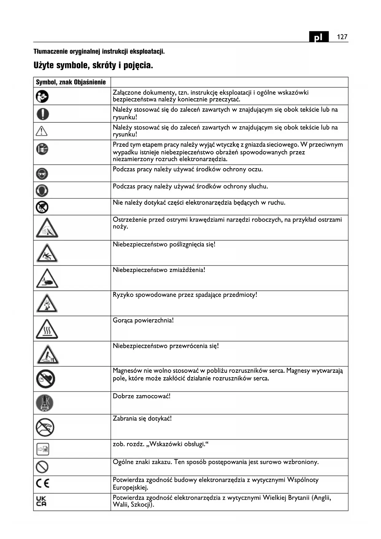 Tłumaczenie oryginalnej instrukcji eksploatacji. Użyte symbole, skróty i pojęcia. Symbol, znak Objaśnienie Załączone dokumenty, tzn. instrukcję eksploatacji i ogólne wskazówki bezpieczeństwa należy koniecznie przeczytać. Należy stosować się do zaleceń zawartych w znajdującym się obok tekście lub na rysunku! Należy stosować się do zaleceń zawartych w znajdującym się obok tekście lub na rysunku! Przed tym etapem pracy należy wyjąć wtyczkę z gniazda sieciowego. W przeciwnym wypadku istnieje niebezpieczeństwo obrażeń spowodowanych przez niezamierzony rozruch elektronarzędzia. Podczas pracy należy używać środków ochrony oczu. Podczas pracy należy używać środków ochrony słuchu. Nie należy dotykać części elektronarzędzia będących w ruchu. Ostrzeżenie przed ostrymi krawędziami narzędzi roboczych, na przykład ostrzami noży. Niebezpieczeństwo poślizgnięcia się! Niebezpieczeństwo zmiażdżenia! Ryzyko spowodowane przez spadające przedmioty! Gorąca powierzchnia! Niebezpieczeństwo przewrócenia się! Magnesów nie wolno stosować w pobliżu rozruszników serca. Magnesy wytwarzają pole, które może zakłócić działanie rozruszników serca. Dobrze zamocować! Zabrania się dotykać! zob. rozdz. „Wskazówki obsługi.“ Ogólne znaki zakazu. Ten sposób postępowania jest surowo wzbroniony. Potwierdza zgodność budowy elektronarzędzia z wytycznymi Wspólnoty Europejskiej. Potwierdza zgodność elektronarzędzia z wytycznymi Wielkiej Brytanii (Anglii, Walii, Szkocji).128