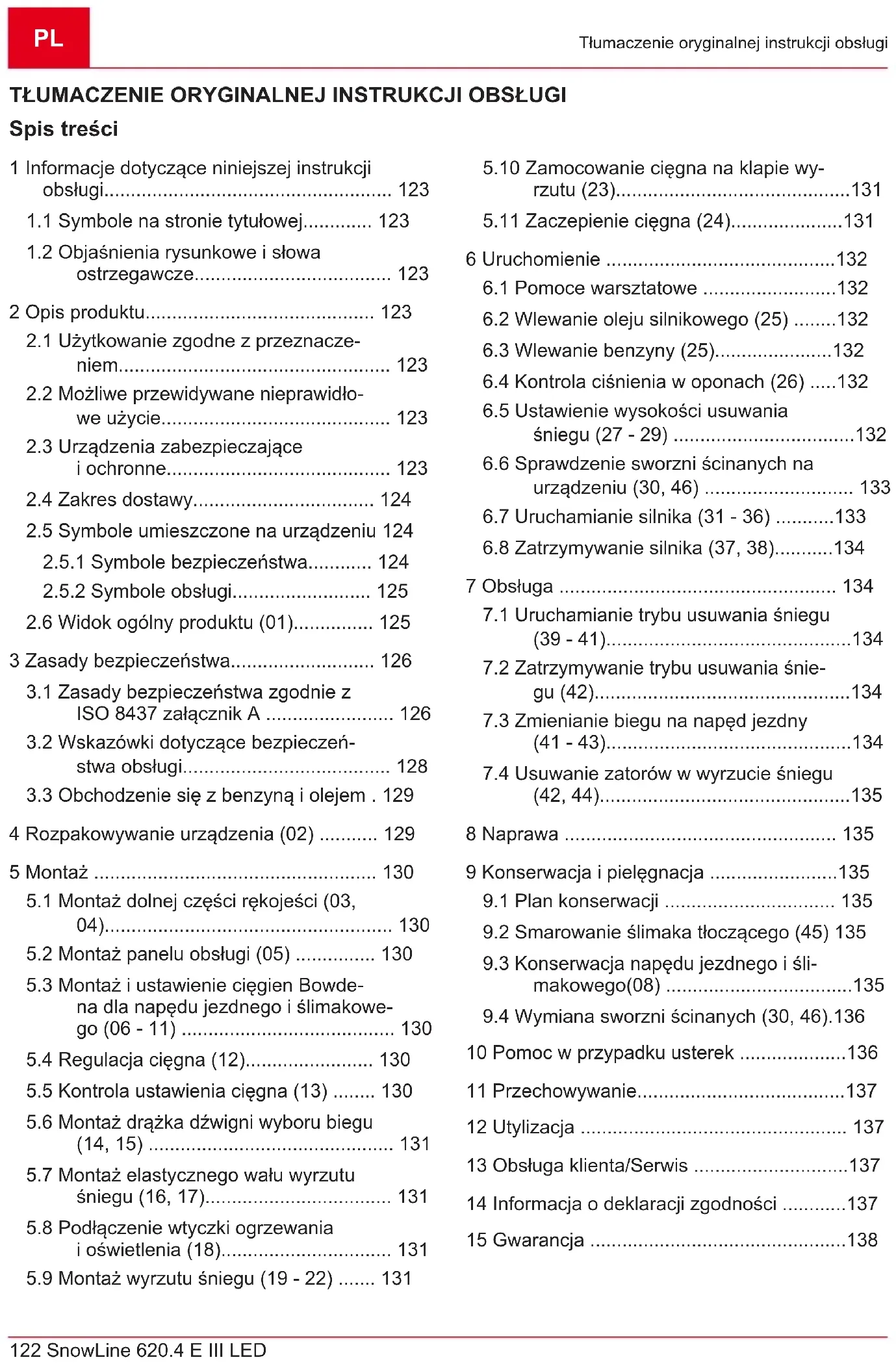 Wszelkie pytania dotyczące gwarancji, naprawy lub części zamiennych należy kierować do naj- bliższego punktu serwisowego AL-KO. Można go znaleźć w następującej witrynie internetowej: www.alko-garden.com/service-contacts Więcej informacji na tema części wymiennych jest dostępnych pod adresem: www.alko-garden.com/spareparts 14 INFORMACJA ODEKLARACJI ZGODNOŚCI Niniejszym oświadczamy na własną odpowie- dzialność, że produkt we wprowadzonej przez nas na rynek wersji spełnia wymagania zharmo- nizowanych dyrektyw UE, standardy bezpieczeń- stwa UE oraz standardy obowiązujące dla dane- go produktu. Deklaracja zgodności jest częścią instrukcji obsługi ijest dołączona do maszyny.PL 138 SnowLine 620.4 E III LED Gwarancja 15 GWARANCJA Ewentualne wady materiałowe lub produkcyjne wurządzeniu usuwamy przed upływem ustawowego okresu przedawnienia roszczeń ztytułu rękojmi za wady fizyczne, dokonując wedle naszego uznania naprawy lub wymiany produktu. Okres przedawnienia ustalany jest zgodnie zprawem obowiązującym wkraju, wktórym produkt został zakupiony. Gwarancja obowiązuje tylko wprzypadku: