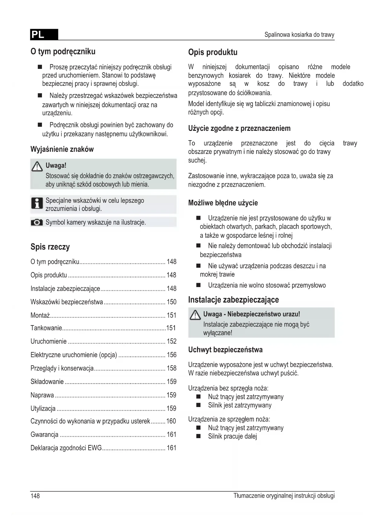 - DeklaracjazgodnościEWG O tym podręczniku Proszęprzeczytaćniniejszypodręcznikobsługi przeduruchomieniem.Stanowitopodstawę bezpiecznejpracyisprawnejobsługi. Należyprzestrzegaćwskazówekbezpieczeństwa zawartych w niniejszej dokumentacji oraz na urządzeniu. Podręcznikobsługipowinienbyćzachowanydo użytkuiprzekazanynastępnemuużytkownikowi. Wyjaśnienie znaków Uwaga! Stosowaćsiędokładniedoznakówostrzegawczych, abyuniknąćszkódosobowychlubmienia. Specjalne wskazówki w celu lepszego zrozumieniaiobsługi. Symbol kamery wskazuje na ilustracje. Opis produktu W niniejszej dokumentacji opisano różne modele benzynowych kosiarek do trawy. Niektóre modele wyposażone są w kosz do trawy i lub dodatkowo są przystosowanedościółkowania. Modelidentykujesięwgtabliczkiznamionowejiopisu różnychopcji. Użycie zgodne z przeznaczeniem To urządzenie przeznaczone jest do cięcia trawy w obszarzeprywatnyminienależystosowaćgodotrawy suchej. Zastosowanieinne,wykraczającepozato,uważasięza niezgodne z przeznaczeniem. Możliwe błędne użycie Urządzenieniejestprzystosowanedoużytkuw obiektach otwartych, parkach, placach sportowych, atakżewgospodarceleśnejirolnej Nienależydemontowaćlubobchodzićinstalacji bezpieczeństwa Nieużywaćurządzeniapodczasdeszczuina mokrej trawie Urządzenianiewolnostosowaćprzemysłowo Instalacje zabezpieczające Uwaga - Niebezpieczeństwo urazu! Instalacjezabezpieczająceniemogąbyć wyłączane! Uchwyt bezpieczeństwa Urządzeniewyposażonejestwuchwytbezpieczeństwa. Wrazieniebezpieczeństwauchwytpuścić. Urządzeniabezsprzęgłanoża: Nużtnącyjestzatrzymywany Silnik jest zatrzymywany Urządzeniazesprzęgłemnoża: Nużtnącyjestzatrzymywany Silnik pracuje dalejPL 149470 592_c 1 Linka startowa 9 Ustawieniewysokościcięcia* 2 Uruchomienie, zatrzymanie* 10 Sprzęgłonoża* 3 Napędkół* 11 Przekładniakombinowana* 4 Uchwytbezpieczeństwa 12 Instrukcjaobsługi 5 Ergonomiczneustawianiewysokości* 13 Wkładkawyrzutu* 6 Wskaźnikstanunapełnienia* 14 Osłonazamykająca* 7 Osłonaprzeciwuderzeniowa* 15 Zestawdościółki* 8 Kosz do trawy* * w zależności od wyposażenia Symbole na urządzeniu Uwaga! Szczególnaostrożnośćprzymanipulacji. Przedrozpoczęciempracyprzy mechanizmietnącymzdjąćfajkęświecową! Przeduruchomieniemprzeczytaćinstrukcjęobsługi! Zwolnićhamulecsilnika. Osobytrzecieniemogąznajdowaćsięwstree zagrożenia! Włączyćnapędkół. Ręceinogitrzymaćzdalaodmechanizmutnącego! p. 161