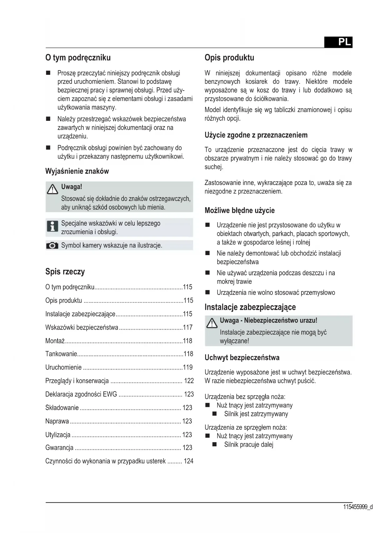 - Czynności do wykonania w przypadku usterek O tym podręczniku Proszę przeczytać niniejszy podręcznik obsługi przed uruchomieniem. Stanowi to podstawę bezpiecznej pracy i sprawnej obsługi. Przed uży- ciem zapoznać się z elementami obsługi i zasadami użytkowania maszyny. Należy przestrzegać wskazówek bezpieczeństwa zawartych w niniejszej dokumentacji oraz na urządzeniu. Podręcznik obsługi powinien być zachowany do użytku i przekazany następnemu użytkownikowi. Wyjaśnienie znaków Uwaga! Stosować się dokładnie do znaków ostrzegawczych, aby uniknąć szkód osobowych lub mienia. Specjalne wskazówki w celu lepszego zrozumienia i obsługi. Symbol kamery wskazuje na ilustracje. Opis produktu W niniejszej dokumentacji opisano różne modele benzynowych kosiarek do trawy. Niektóre modele wyposażone są w kosz do trawy i lub dodatkowo są przystosowane do ściółkowania. Model identyfi kuje się wg tabliczki znamionowej i opisu różnych opcji. Użycie zgodne z przeznaczeniem To urządzenie przeznaczone jest do cięcia trawy w obszarze prywatnym i nie należy stosować go do trawy suchej. Zastosowanie inne, wykraczające poza to, uważa się za niezgodne z przeznaczeniem. Możliwe błędne użycie Urządzenie nie jest przystosowane do użytku w obiektach otwartych, parkach, placach sportowych, a także w gospodarce leśnej i rolnej Nie należy demontować lub obchodzić instalacji bezpieczeństwa Nie używać urządzenia podczas deszczu i na mokrej trawie Urządzenia nie wolno stosować przemysłowo Instalacje zabezpieczające Uwaga - Niebezpieczeństwo urazu! Instalacje zabezpieczające nie mogą być wyłączane! Uchwyt bezpieczeństwa Urządzenie wyposażone jest w uchwyt bezpieczeństwa. W razie niebezpieczeństwa uchwyt puścić. Urządzenia bez sprzęgła noża: Nuż tnący jest zatrzymywany Silnik jest zatrzymywany Urządzenia ze sprzęgłem noża: Nuż tnący jest zatrzymywany Silnik pracuje dalejPL Tłumaczenie oryginalnej instrukcji obsługi Spalinowa kosiarka do trawy1 Linka startowa 10 Przekładnia kombinowana*2 Napęd kół* 11 Instrukcja obsługi3 Uchwyt bezpieczeństwa 12 Wkładka wyrzutu* 4 Ergonomiczne ustawianie wysokości* 13 Osłona zamykająca* 5 Wskaźnik stanu napełnienia* 14 Zestaw do ściółki* 6Osłona przeciwuderzeniowa 15 Zapłon elektryczny start* 7 Kosz do trawy 16 Skrócona instrukcja obsługi8 Ustawienie wysokości cięcia 17 Zdalne sterowanie gazem* 9 Sprzęgło noża* * w zależności od wyposażenia Symbole na urządzeniuUwaga!Szczególna ostrożność przy manipulacji.Przed rozpoczęciem pracy przy mechanizmie tnącym zdjąć fajkę świecową! Przed uruchomieniem przeczytać instrukcję obsługi! STARTZapłon elektryczny start:Przed pracami konserwacyjnymi i na-prawczymi wyciągnąć kluczyk ze stacyjki! Osoby trzecie nie mogą znajdować się w strefi e zagrożenia!Skrócona instrukcja obsługiZwolnić hamulec silnika. Ręce i nogi trzymać z dala od mechanizmu tnącego! Skrócona instrukcja obsługiWłączyć napęd kół. Utrzymywać odpowiedni odstęp od stref zagrożenia. Skrócona instrukcja obsługiZdalne sterowanie gazem start / stop. p. 124