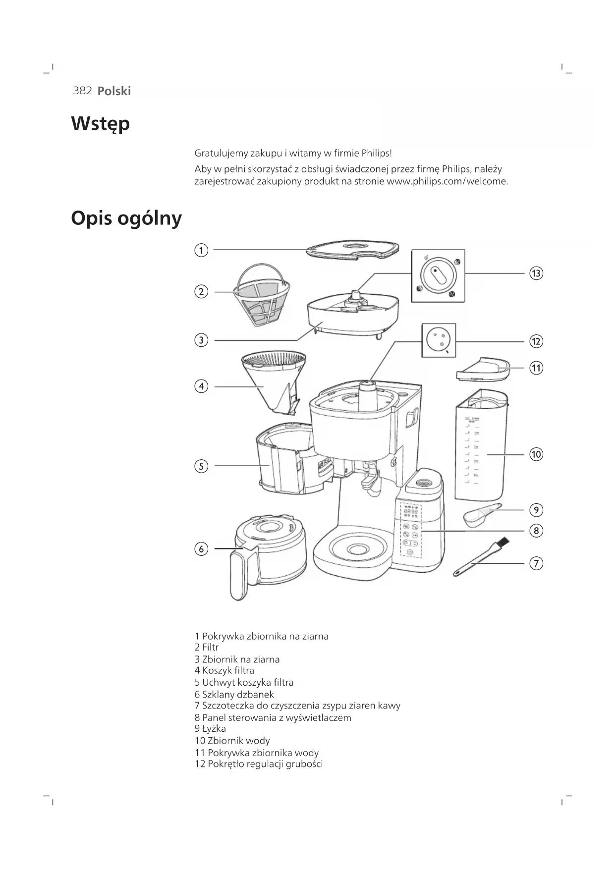 1 Pokrywka zbiornika na ziarna 2 Filtr 3 Zbiornik na ziarna 4 Koszyk filtra 5 Uchwyt koszyka filtra 6 Szklany dzbanek 7 Szczoteczka do czyszczenia zsypu ziaren kawy 8 Panel sterowania z wyświetlaczem 9 Łyżka 10 Zbiornik wody 11 Pokrywka zbiornika wody 12 Pokrętło regulacji grubości383 Polski 13 Pokrętło wyboru zbiornika Panel sterowania Przycisk zasilania Przycisk zegara i przycisk strzałki do ustawiania czasu Przycisk uruchomienia/wstrzymania Przycisk czyszczenia Przycisk wstępnego mielenia i mocy kawy Przycisk wyboru filiżanki Wyświetlana ikona Liczba filiżanek Tryb utrzymywania ciepła Kawa mielona Moc kawy Usuwanie kamienia Alarm czyszczenia ręcznego384 Polski Wskazanie niskiego poziomu wody Zegar Wyświetlacz czasu Dwie pierwsze cyfry oznaczają godziny, a dwie ostatnie cyfry oznaczają minuty. Obróć pokrętło do pozycji odblokowanej, aby wyjąć zbiornik na ziarna z urządzenia. Tym pokrętłem wybiera się grubość kawy — większy rozmiar oznacza grubsze ziarna. Tryb dzbanka W trybie dzbanka jest funkcja blokady kapania. Uwaga: proces parzenia nie zostanie przerwany po wyjęciu dzbanka. Jeśli nie umieścisz dzbanka ponownie w urządzeniu w ciągu 20 sekund, koszyk filtra się przeleje. Tryb filiżanki Przekręć ręcznie pokrętło z trybu filiżanki do trybu dzbanka, aby otworzyć blokadę kapania i zapobiec kapaniu po zakończeniu cyklu parzenia Uwaga: zimny kubek ceramiczny będzie zabierał kawie ciepło i sam się podgrzewał, podgrzej najpierw kubek gorącą wodą. Ważne Ostrzeżenie