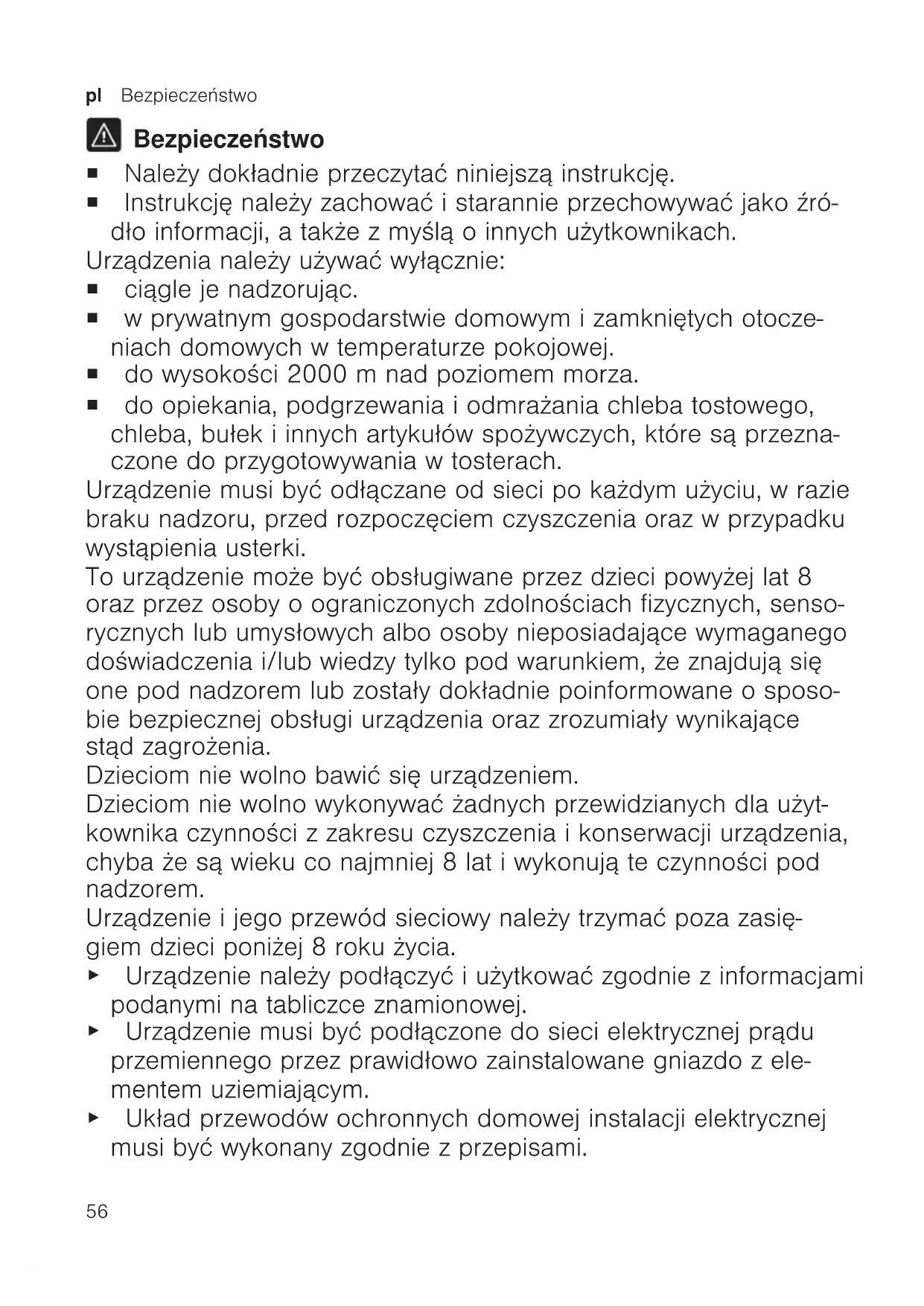 Bezpieczeństwo ¡ Należy dokładnie przeczytać niniejszą instrukcję. ¡ Instrukcję należy zachować i starannie przechowywać jako źró- dło informacji, a także z myślą o innych użytkownikach. Urządzenia należy używać wyłącznie: ¡ ciągle je nadzorując. ¡ w prywatnym gospodarstwie domowym i zamkniętych otocze- niach domowych w temperaturze pokojowej. ¡ do wysokości 2000m nad poziomem morza. ¡ do opiekania, podgrzewania i odmrażania chleba tostowego, chleba, bułek i innych artykułów spożywczych, które są przezna- czone do przygotowywania w tosterach. Urządzenie musi być odłączane od sieci po każdym użyciu, w razie braku nadzoru, przed rozpoczęciem czyszczenia oraz w przypadku wystąpienia usterki. To urządzenie może być obsługiwane przez dzieci powyżej lat 8 oraz przez osoby oograniczonych zdolnościach fizycznych, senso- rycznych lub umysłowych albo osoby nieposiadające wymaganego doświadczenia i/lub wiedzy tylko pod warunkiem, że znajdują się one pod nadzorem lub zostały dokładnie poinformowane o sposo- bie bezpiecznej obsługi urządzenia oraz zrozumiały wynikające stąd zagrożenia. Dzieciom nie wolno bawić się urządzeniem. Dzieciom nie wolno wykonywać żadnych przewidzianych dla użyt- kownika czynności z zakresu czyszczenia i konserwacji urządzenia, chyba że są wieku co najmniej 8 lat i wykonują te czynności pod nadzorem. Urządzenie i jego przewód sieciowy należy trzymać poza zasię- giem dzieci poniżej 8 roku życia. ▶ Urządzenie należy podłączyć iużytkować zgodnie zinformacjami podanymi natabliczce znamionowej. ▶ Urządzenie musi być podłączone do sieci elektrycznej prądu przemiennego przez prawidłowo zainstalowane gniazdo z ele- mentem uziemiającym. ▶ Układ przewodów ochronnych domowej instalacji elektrycznej musi być wykonany zgodnie zprzepisami.Bezpieczeństwo pl