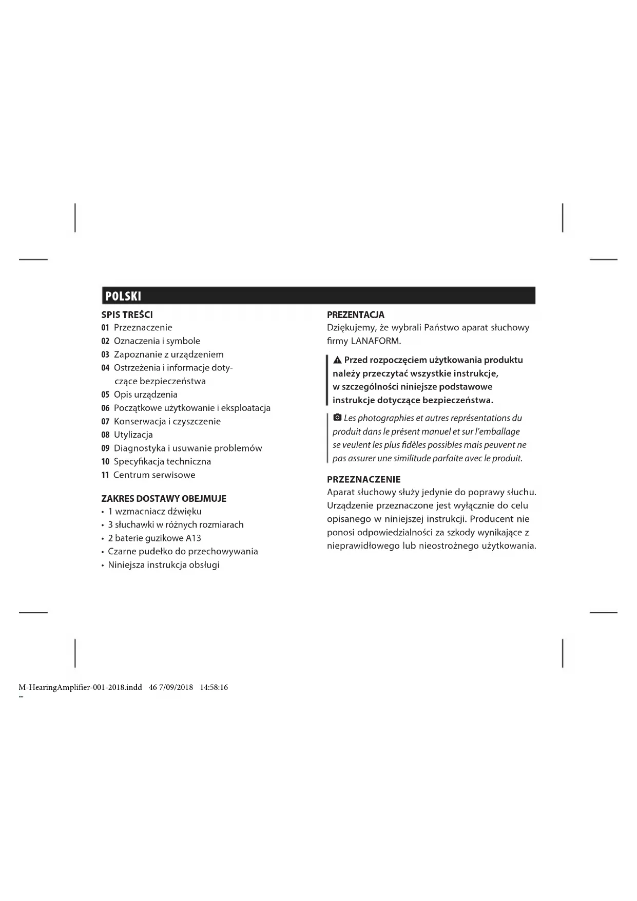 Les photographies et autres représentations du produit dans le présent manuel et sur l’emballage se veulent les plus dèles possibles mais peuvent ne pas assurer une similitude parfaite avec le produit. PRZEZNACZENIE Aparat słuchowy służy jedynie do poprawy słuchu. Urządzenie przeznaczone jest wyłącznie do celu opisanego w niniejszej instrukcji. Producent nie ponosi odpowiedzialności za szkody wynikające z nieprawidłowego lub nieostrożnego użytkowania. E-IM-HearingAmplifier-001-2018.indd 47 7/09/2018 14:58:16wych innych osób w związku z ryzykiem pogorszenia słuchu i zakażenia. Posiadanego aparatu słuchowego NIE należy przeka- zywać do użytku innym osobom. Używanie aparatu słuchowego przeznaczonego do użytku przez inną osobę może spowodować uszkodzenie słuchu. Aparat słuchowy NIE jest przeznaczony do użytku przez dzieci poniżej 36 miesięcy. Diagnoza problemów ze słuchem u dzieci stwarza szczególne problemy. Dzieciom należy zapewnić apa- rat słuchowy wyłącznie po kontroli laryngologicznej. Aparat słuchowy, wyposażenie dodatkowe i bate- rie należy przechowywać poza zasięgiem dzieci, ponieważ występuje ryzyko obrażeń i zadławienia. Niniejsze urządzenie NIE jest przeznaczone dla ludzi (w tym dzieci) o ograniczonych zdolnościach zycz- nych, sensorycznych lub umysłowych, bądź niepo- siadających doświadczenia i/lub wiedzy bez nadzoru osoby odpowiedzialnej za ich bezpieczeństwo lub instruktażu w sprawie eksploatacji tego urządzenia częciem użytkowania aparatu słuchowego należy skonsultować się z lekarzem. Urządzenia NIE powinni używać pacjenci cierpiący na zapalenie lub infekcję ucha. Aparatu słuchowego NIE należy używać, jeżeli cierpią Państwo na zapalenie ucha środkowego lub kanału słuchowego. Jeżeli podczas noszenia aparatu słuchowego źle się Państwo czują lub odczuwają Państwo ból, należy bezzwłocznie przerwać korzystanie z niego i skon- taktować się z lekarzem. Jeżeli podczas noszenia aparatu słuchowego wystąpi stan zapalny ucha, podrażnienie skóry lub więk- sze gromadzenie woskowiny, należy bezzwłocznie przerwać korzystanie z niego i skontaktować się z lekarzem. W poniższych przypadkach należy przerwać użytko- wanie aparatu słuchowego i uzyskać pomoc lekarską: