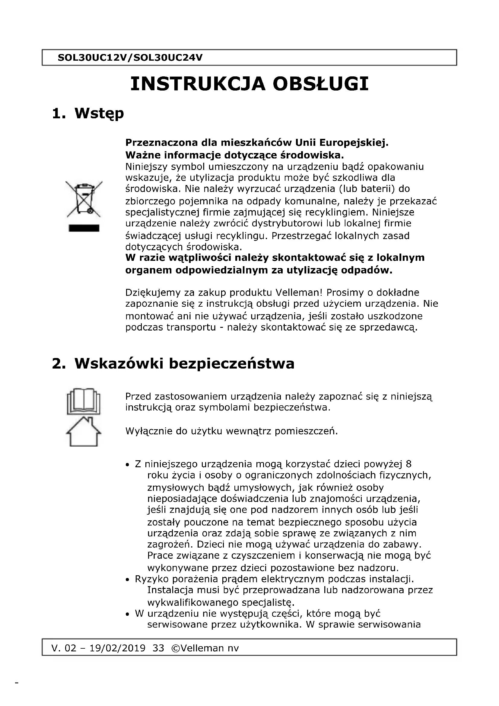Właścicielem praw autorskich do niniejszej instrukcji jest firma Velleman nv. Wszelkie prawa są zastrzeżone na całym świecie. Żadna część niniejszej instrukcji nie może być kopiowana, powielana, tłumaczona ani przenoszona na jakikolwiek nośnik elektroniczny (lub w inny sposób) bez wcześniejszej pisemnej zgody właściciela praw autorskich.SOL30UC12V/SOL30UC24V