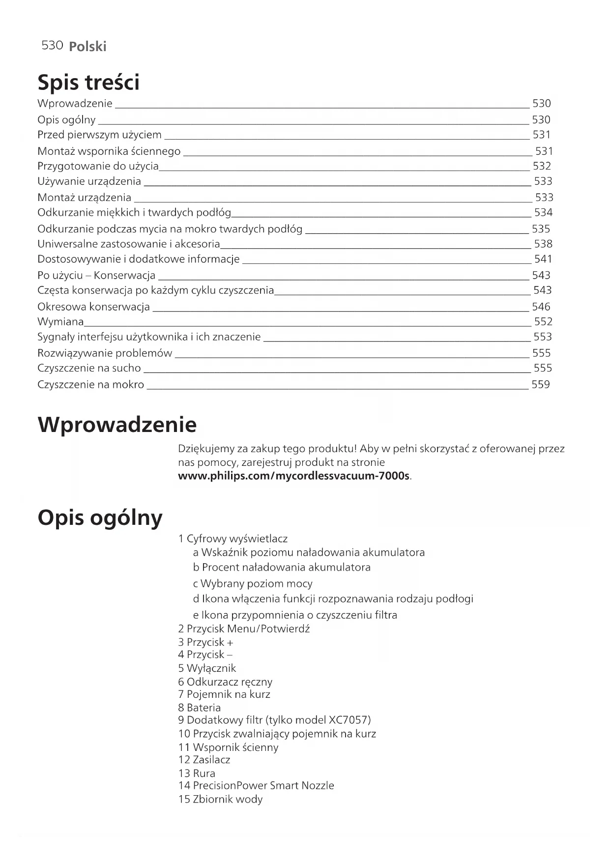 Polski Spis treści Wprowadzenie ____________________________________________________________________________ 530 Opis ogólny _______________________________________________________________________________ 530 Przed pierwszym użyciem ___________________________________________________________________ 531 Montaż wspornika ściennego ________________________________________________________________ 531 Przygotowanie do użycia____________________________________________________________________ 532 Używanie urządzenia _______________________________________________________________________ 533 Montaż urządzenia _________________________________________________________________________ 533 Odkurzanie miękkich itwardych podłóg_______________________________________________________ 534 Odkurzanie podczas mycia na mokro twardych podłóg _________________________________________ 535 Uniwersalne zastosowanie i akcesoria_________________________________________________________ 538 Dostosowywanie i dodatkowe informacje _____________________________________________________ 541 Po użyciu – Konserwacja ____________________________________________________________________ 543 Częsta konserwacja po każdym cyklu czyszczenia_______________________________________________ 543 Okresowa konserwacja _____________________________________________________________________ 546 Wymiana__________________________________________________________________________________ 552 Sygnały interfejsu użytkownika i ich znaczenie _________________________________________________ 553 Rozwiązywanie problemów _________________________________________________________________ 555 Czyszczenie na sucho _______________________________________________________________________ 555 Czyszczenie na mokro ______________________________________________________________________ 559 Wprowadzenie Dziękujemy za zakup tego produktu! Aby wpełni skorzystać zoferowanej przez nas pomocy, zarejestruj produkt na stronie www.philips.com/mycordlessvacuum-7000s. Opis ogólny 1 Cyfrowy wyświetlacz a Wskaźnik poziomu naładowania akumulatora b Procent naładowania akumulatora c Wybrany poziom mocy d Ikona włączenia funkcji rozpoznawania rodzaju podłogi e Ikona przypomnienia o czyszczeniu filtra 2 Przycisk Menu/Potwierdź 3 Przycisk + 4 Przycisk – 5 Wyłącznik 6 Odkurzacz ręczny 7 Pojemnik na kurz 8 Bateria 9 Dodatkowy filtr (tylko model XC7057) 10 Przycisk zwalniający pojemnik na kurz 11 Wspornik ścienny 12 Zasilacz 13 Rura 14 PrecisionPower Smart Nozzle 15 Zbiornik wody531 Polski 16 Wkład mopujący zmikrofibry 17 Mini TurboBrush (tylko modele XC7055, XC7057) 18 Narzędzie uniwersalne 19 Miękka szczotka (tylko model XC7057) 20 Narzędzie do tapicerki (tylko model XC7055, XC7057) 21 Szczelinówka Przed pierwszym użyciem Montaż wspornika ściennego 1 Odwróć wspornik ścienny i odblokuj szarą dźwignię. Włóż port ładowania, upewniając się, że metalowa część jest widoczna i skierowana do góry z przodu wspornika ściennego. 2 Starannie ułóż kabel, wsuwając go do wyznaczonego rowka. 3 Zamknij szarą dźwignię. Upewnij się, że szara dźwignia słyszalnie zablokowała się na swoim miejscu. 110 ± 2 cm 4 Zamocuj wspornik ścienny w preferowanym miejscu na ścianie, upewniając się, że otwory na śruby montażowe znajdują się około 110 cm od podłogi. Przestroga: Zachowaj ostrożność podczas wiercenia otworów wścianie wcelu zamocowania wspornika ściennego, aby uniknąć porażenia prądem.532 Polski Uwaga: Dopilnuj, by umiejscowienie wspornika ściennego umożliwiało zawieszenie całego urządzenia na ścianie bez kontaktu ssawki z podłogą. 5 Po ustaleniu optymalnej pozycji i wysokości do przechowywania i ładowania urządzenia, mocno dokręć śruby, aby zamocować wspornik ścienny na miejscu. Przygotowanie do użycia Urządzenie jest wyposażone wakumulator litowo-jonowy. Pełne naładowanie całkowicie rozładowanego akumulatora zajmuje około 6 godzin. 1 Podłącz akumulator do głównego korpusu urządzenia tak, aby słyszalne było kliknięcie. MAX 40⁰C MIN 5⁰C 2 Naładuj urządzenie, umieszczają je na wsporniku ściennym. Ostrzeżenie: Przechowuj iładuj urządzenie wtemperaturze powyżej 5°C iponiżej 40°C.533 Polski Uwaga: Można również umieścić odkurzacz na równej i stabilnej powierzchni i bezpośrednio podłączyć przewód ładowania do urządzenia.