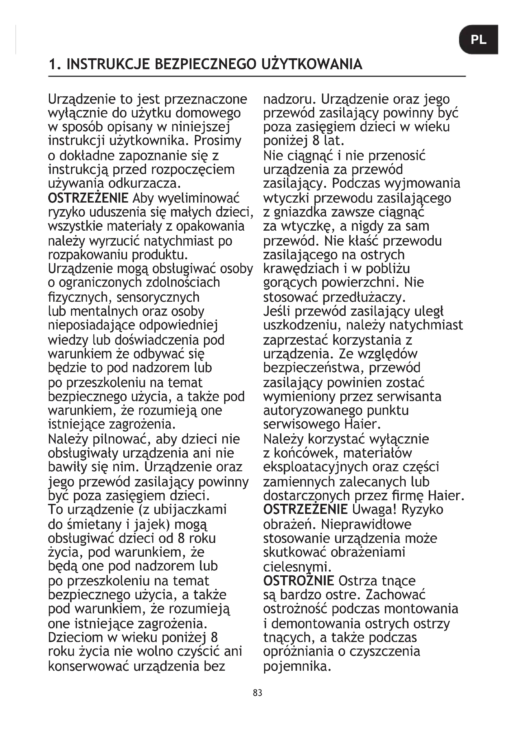 λειτουργία. Αφήστε τη μονάδα να κρυώσει εντελώς πριν τη χρησιμοποιήσετε ξανά.83 Urządzenie to jest przeznaczone wyłącznie do użytku domowego w sposób opisany w niniejszej instrukcji użytkownika. Prosimy o dokładne zapoznanie się z instrukcją przed rozpoczęciem używania odkurzacza. OSTRZEŻENIE Aby wyeliminować ryzyko uduszenia się małych dzieci, wszystkie materiały z opakowania należy wyrzucić natychmiast po rozpakowaniu produktu. Urządzenie mogą obsługiwać osoby o ograniczonych zdolnościach zycznych, sensorycznych lub mentalnych oraz osoby nieposiadające odpowiedniej wiedzy lub doświadczenia pod warunkiem że odbywać się będzie to pod nadzorem lub po przeszkoleniu na temat bezpiecznego użycia, a także pod warunkiem, że rozumieją one istniejące zagrożenia. Należy pilnować, aby dzieci nie obsługiwały urządzenia ani nie bawiły się nim. Urządzenie oraz jego przewód zasilający powinny być poza zasięgiem dzieci. To urządzenie (z ubijaczkami do śmietany i jajek) mogą obsługiwać dzieci od 8 roku życia, pod warunkiem, że będą one pod nadzorem lub po przeszkoleniu na temat bezpiecznego użycia, a także pod warunkiem, że rozumieją one istniejące zagrożenia. Dzieciom w wieku poniżej 8 roku życia nie wolno czyścić ani konserwować urządzenia bez nadzoru. Urządzenie oraz jego przewód zasilający powinny być poza zasięgiem dzieci w wieku poniżej 8 lat. Nie ciągnąć i nie przenosić urządzenia za przewód zasilający. Podczas wyjmowania wtyczki przewodu zasilającego z gniazdka zawsze ciągnąć za wtyczkę, a nigdy za sam przewód. Nie kłaść przewodu zasilającego na ostrych krawędziach i w pobliżu gorących powierzchni. Nie stosować przedłużaczy. Jeśli przewód zasilający uległ uszkodzeniu, należy natychmiast zaprzestać korzystania z urządzenia. Ze względów bezpieczeństwa, przewód zasilający powinien zostać wymieniony przez serwisanta autoryzowanego punktu serwisowego Haier. Należy korzystać wyłącznie z końcówek, materiałów eksploatacyjnych oraz części zamiennych zalecanych lub dostarczonych przez rmę Haier. OSTRZEŻENIE Uwaga! Ryzyko obrażeń. Nieprawidłowe stosowanie urządzenia może skutkować obrażeniami cielesnymi. OSTROŻNIE Ostrza tnące są bardzo ostre. Zachować ostrożność podczas montowania i demontowania ostrych ostrzy tnących, a także podczas opróżniania o czyszczenia pojemnika.
