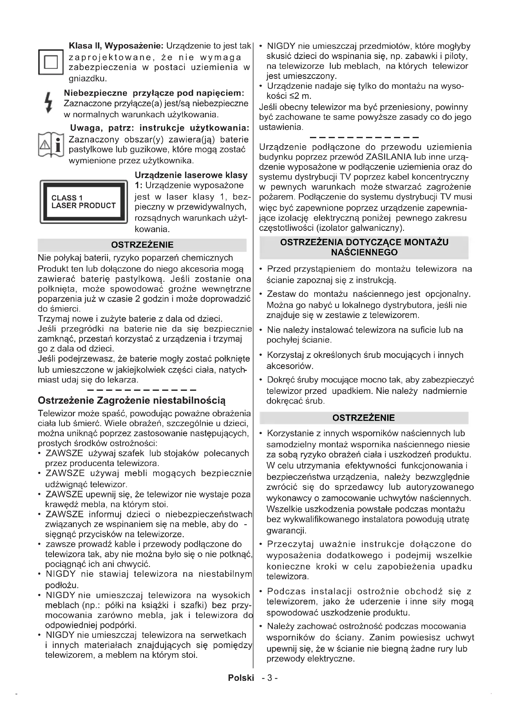 Uwaga, patrz: instrukcje użytkowania: Zaznaczony obszar(y) zawiera(ją) baterie pastylkowe lub guzikowe, które mogą zostać wymienione przez użytkownika. CLASS 1 LASER PRODUCT Urządzenie laserowe klasy 1: Urządzenie wyposażone jest w laser klasy 1, bez- pieczny w przewidywalnych, rozsądnych warunkach użyt- kowania. OSTRZEŻENIE Nie połykaj baterii, ryzyko poparzeń chemicznych Produkt ten lub dołączone do niego akcesoria mogą zawierać baterię pastylkową. Jeśli zostanie ona połknięta, może spowodować groźne wewnętrzne poparzenia już w czasie 2 godzin i może doprowadzić do śmierci. Trzymaj nowe i zużyte baterie z dala od dzieci. Jeśli przegródki na baterie nie da się bezpiecznie zamknąć, przestań korzystać z urządzenia i trzymaj go z dala od dzieci. Jeśli podejrzewasz, że baterie mogły zostać połknięte lub umieszczone w jakiejkolwiek części ciała, natych