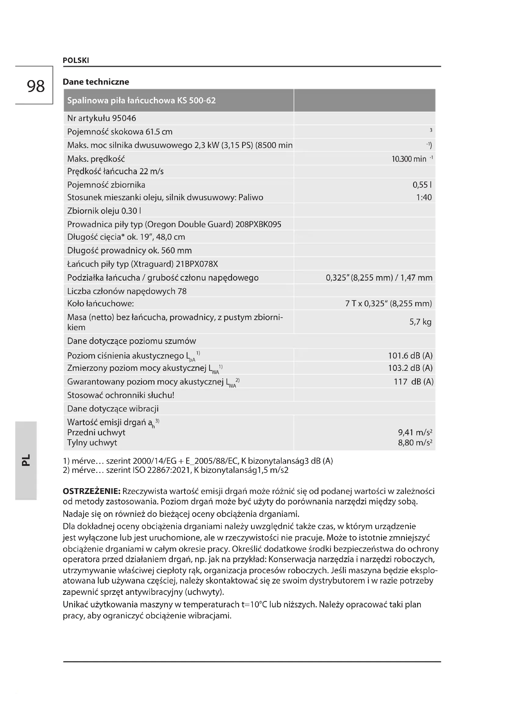rati fordulatszámot szakműhellyel98 Dane techniczne Spalinowa piła łańcuchowa KS 500-62 Nr artykułu 95046 Pojemność skokowa 61.5 cm