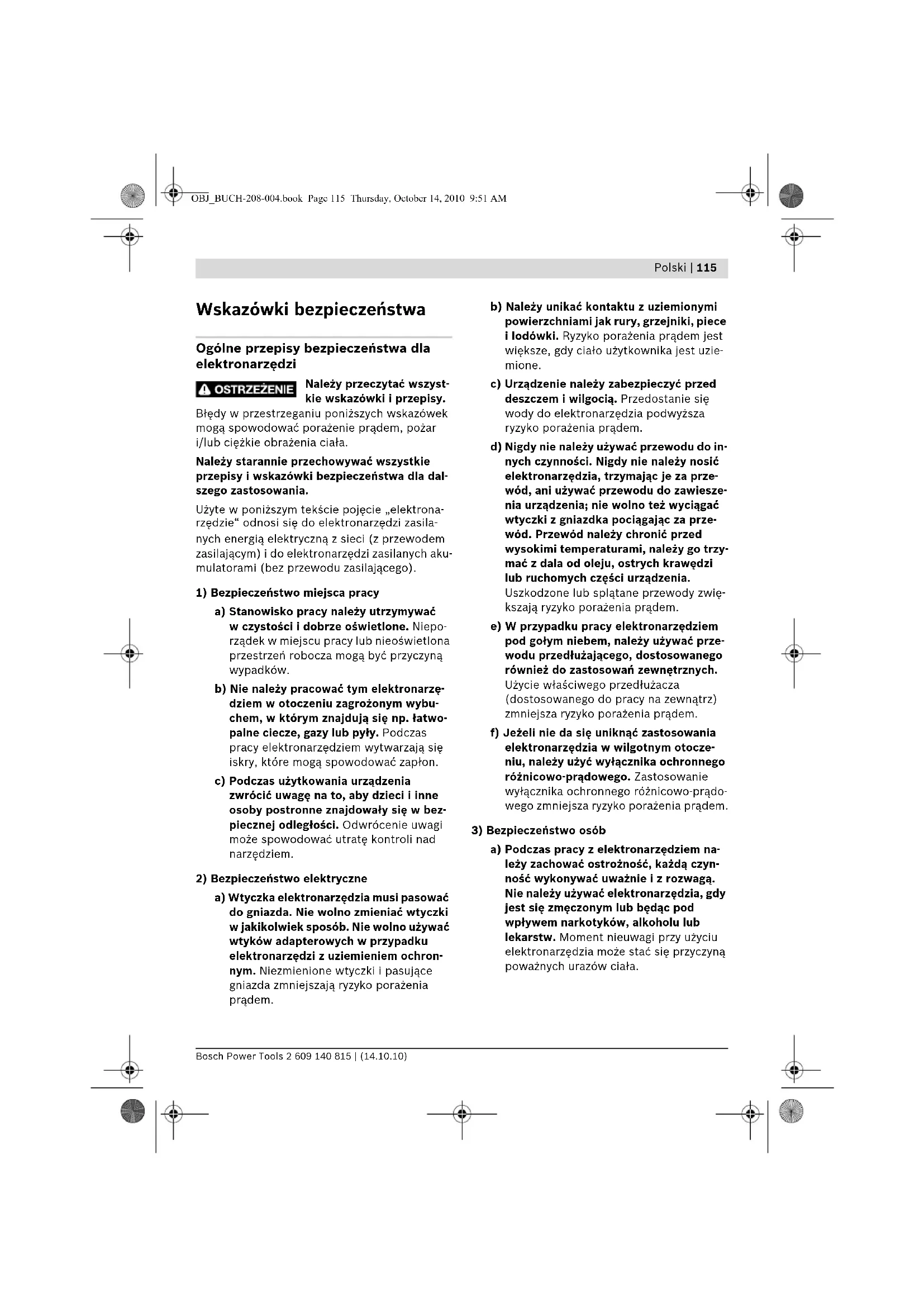 narzędzi a) Nie należy przeciążać urządzenia. Do pracy używać należy elektronarzędzia, które są do tego przewidziane. Odpo- wiednio dobranym elektronarzędziem pracuje się w danym zakresie wydajności lepiej i bezpieczniej. b) Nie należy używać elektronarzędzia, którego włącznik/wyłącznik jest uszko- dzony. Elektronarzędzie, którego nie można włączyć lub wyłączyć jest niebez- pieczne i musi zostać naprawione. c) Przed regulacją urządzenia, wymianą osprzętu lub po zaprzestaniu pracy na- rzędziem, należy wyciągnąć wtyczkę z gniazda i/lub usunąć akumulator. Ten środek ostrożności zapobiega nieza- mierzonemu włączeniu się elektro- narzędzia. d) Nieużywane elektronarzędzia należy przechowywać w miejscu niedostępnym dla dzieci. Nie należy udostępniać narzę- dzia osobom, które go nie znają lub nie przeczytały niniejszych przepisów. Używane przez niedoświadczone osoby elektronarzędzia są niebezpieczne. e) Konieczna jest należyta konserwacja elektronarzędzia. Należy kontrolować, czy ruchome części urządzenia działają bez zarzutu i nie są zablokowane, czy części nie są pęknięte lub uszkodzone w taki sposób, który miałby wpływ na prawidłowe działanie elektronarzędzia. Uszkodzone części należy przed użyciem urządzenia oddać do naprawy. Wiele wypadków spowodowanych jest przez niewłaściwą konserwację elektro- narzędzi. f) Należy stale dbać o ostrość i czystość narzędzi tnących. O wiele rzadziej docho- dzi do zakleszczenia się narzędzia tnącego, jeżeli jest ono starannie utrzyma- ne. Zadbane narzędzia łatwiej się też pro- wadzi. OBJ_BUCH-208-004.book Page 116 Thursday, October 14, 2010 9:51 AMPolski | 117 Bosch Power Tools 2 609 140 815 | (14.10.10) g) Elektronarzędzia, osprzęt, narzędzia pomocnicze itd. należy używać zgodnie z niniejszymi zaleceniami. Uwzględnić należy przy tym warunki i rodzaj wykony- wanej pracy. Niezgodne z przeznacze- niem użycie elektronarzędzia może dopro- wadzić do niebezpiecznych sytuacji.