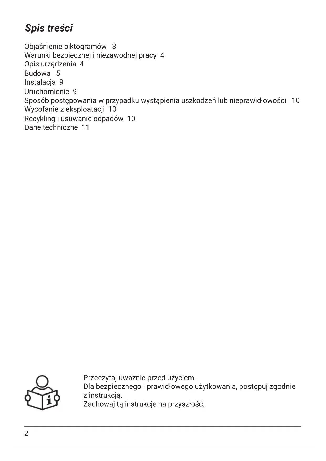 RO2 Przeczytaj uważnie przed użyciem. Dla bezpiecznego i prawidłowego użytkowania, postępuj zgodnie z instrukcją. Zachowaj tą instrukcje na przyszłość. Spis treści Objaśnienie piktogramów 3 Warunki bezpiecznej i niezawodnej pracy 4 Opis urządzenia 4 Budowa 5 Instalacja 9 Uruchomienie 9 Sposób postępowania w przypadku wystąpienia uszkodzeń lub nieprawidłowości 10 Wycofanie z eksploatacji 10 Recykling i usuwanie odpadów 10 Dane techniczne 113 PL;DE;EN;ES;FR;NL;HR;HU;RO-061_f.1973 Prosimy o dokładne przestrzeganie wskazówek bezpieczeństwa w celu wykluczenia ryzyka utraty zdrowia oraz powstania szkód materialnych. Niebezpieczeństwo Ten znak ostrzega przed niebezpieczeństwem zranienia. Uwaga Ten znak ostrzega przed stratami materialnymi i zanieczyszczeniem środowiska. Wskazówka Tekst oznaczony słowem Wskazówka zawiera dodatkowe informacje. Wskazanie, że instrukcja obsługi powinna być brana pod uwagę podczas obsługi urządzenia lub sterowania w pobliżu miejsca, w którym umieszczony jest symbol. Obowiązujące przepisy