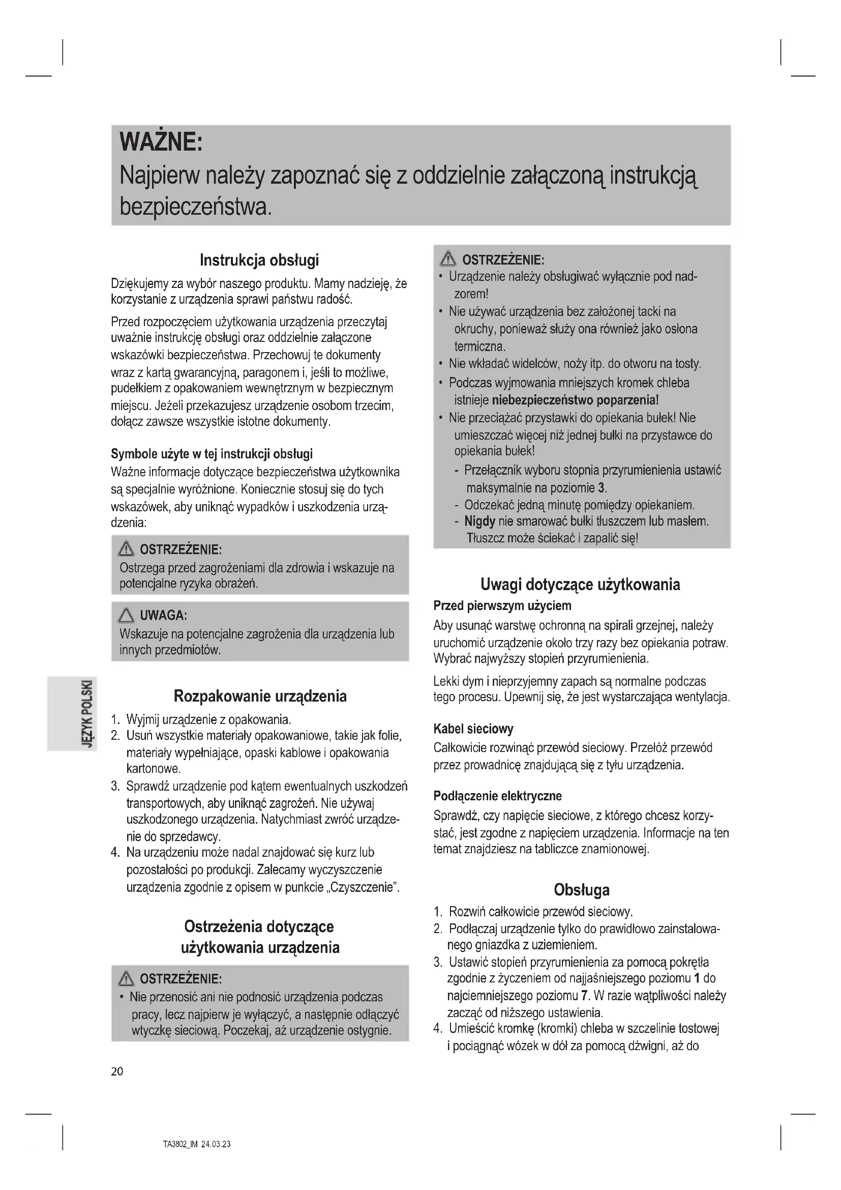 Rozwiązywanie problemów Problem Możliwa przyczyna Środek zaradczy Urządzenie nie działa. Urządzenie nie jest zasilane. Sprawdzić gniazdo sieciowe za pomocą innego urządzenia. Włożyć prawidłowo wtyczkę sieciową. Sprawdzić bezpiecznik domowy. Urządzenie jest uszkodzone. Skontaktuj się z naszym serwisem lub specjalistą. Chleb staje się zbyt ciemny. Poziom opiekania jest zbyt wysoki. Wybierz niższy poziom opiekania. Chleb jest zbyt jasny. Poziom opiekania został ustawiony zbyt nisko. Wybierz wyższy poziom opiekania. Suwak tostów nie prze- suwa się już do góry. Kromka chleba zablokowała się w prowadnicy. OSTRZEŻENIE: Wyciągnąć wtyczkę sieciową z gniazdka! Odczekać, aż urządzenie ostygnie! Uwolnij kromkę chleba za pomocą izo- lowanego przedmiotu, np. drewnianego patyczka. Jeśli to konieczne, odwróć toster tak, aby kromka chleba wypadła. Dane techniczne Model:.........................................................................TA 3802 Zasilanie: ............................................ 220 – 240 V~, 50 / 60 Hz Pobór mocy: ..................................................... 1200 – 1400 W Stopień ochrony: .................................................................... Waga netto: ............................................................ok. 1,33 kg Zastrzegamy sobie prawo wprowadzania zmian technicz- nych i projektowych w trakcie ciągłego rozwoju produktu. To urządzenie zostało przetestowane zgodnie z wszystkimi obowiązującymi, aktualnymi dyrektywami CE i zbudowane zgodnie z najnowszymi przepisami bezpieczeństwa. Ogólne warunki gwarancji Producent / Dystrybutor udziela 24 miesięcy gwarancji na zakupione urządzenie. Okres gwarancji liczony jest od daty zakupu urządzenia. W tym okresie uszkodzone urządzenie będzie bezpłatnie wymienione na wolne od wad. W przypadku, gdy wymiana będzie niemożliwa do zrealizowania, Nabywca otrzyma zwrot ceny zakupu urządzenia. Za uszkodzone urządzenie uważa się takie, które nie spełnia funkcji określonych w instrukcji obsługi, a przyczyną takiego stanu jest wewnętrzna wada fabryczna lub materiałowa. Gwarancją nie są objęte uszkodzenia mechaniczne, chemiczne, termiczne, powstałe w wyniku działania sił zewnętrznych (np. przepięcie w sieci energetycznej czy wyładowania atmosferyczne), jak również wady powstałe w wyniku obsługi niezgodnej z instrukcją obsługi urządzenia. Nabywcy przysługuje prawo do wymiany urządzenia na wolne od wad lub, jeśli wymiana jest niemożliwa, zwrotu go- tówki tylko po dostarczeniu do punktu zakupu kompletnego urządzenia z oryginalnymi akcesoriami, instrukcją obsługi i w oryginalnym opakowaniu wraz z dowodem zakupu i pra- widłowo wypełnioną kartą gwarancyjną (pieczątka sklepu, data sprzedaży urządzenia). Gwarancja oraz zawarte w niej warunki obowiązują na terenie Rzeczpospolitej Polskiej. Niniejsza gwarancja nie wyłącza, nie ogranicza ani nie zawiesza uprawnień Nabywcy wynikających z przepisów Ustawy z dnia 27 lipca 2002 r. o szczególnych warunkach sprzedaży konsumenckiej oraz o zmianie kodeksu cywil- nego (Dz. U. z 2002 r. Nr 141, poz. 1176). Dystrybutor: CTC Clatronic Sp. z o.o Ul. Brzeska 1 45-960 Opole Usuwanie Znaczenie symbolu „Pojemnik na śmieci” Proszę oszczędzać nasze środowisko, sprzęt elektryczny nie należy do śmieci domowych. Proszę korzystać z punktów zbiorczych, prze- widzianych do zdawania sprzętu elektrycznego, i tam proszę oddawać sprzęt elektryczny, którego już nie będą Państwo używać. Tym sposobem pomagają Państwo unikać potencjalnych następstw niewłaściwego usuwania odpadów, mających wpływ na środowisko i zdrowie ludzi.TA3802_IM 24.03.23