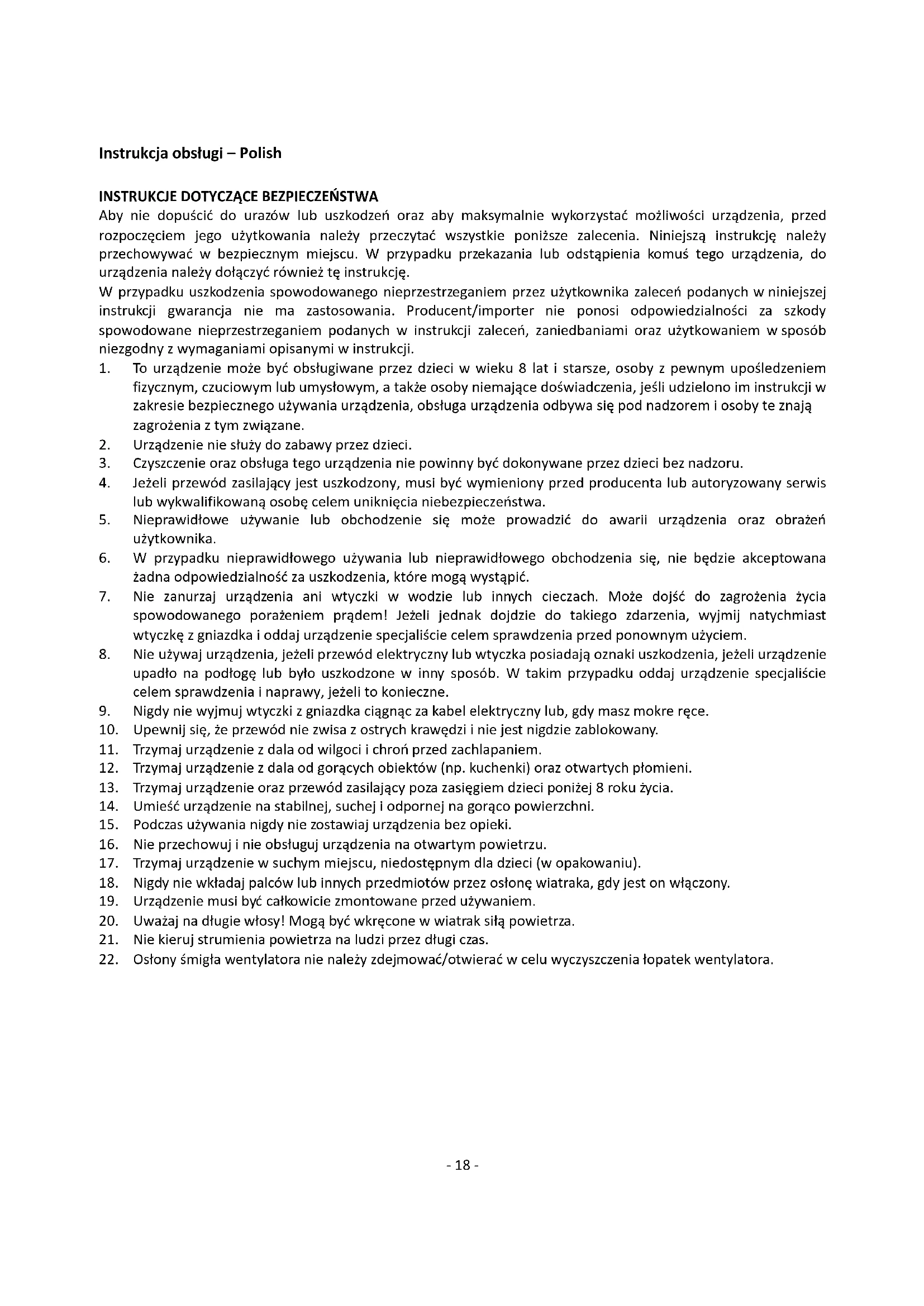 18. Nigdy nie wkładaj palców lub innych przedmiotów przez osłonę wiatraka, gdy jest on włączony.