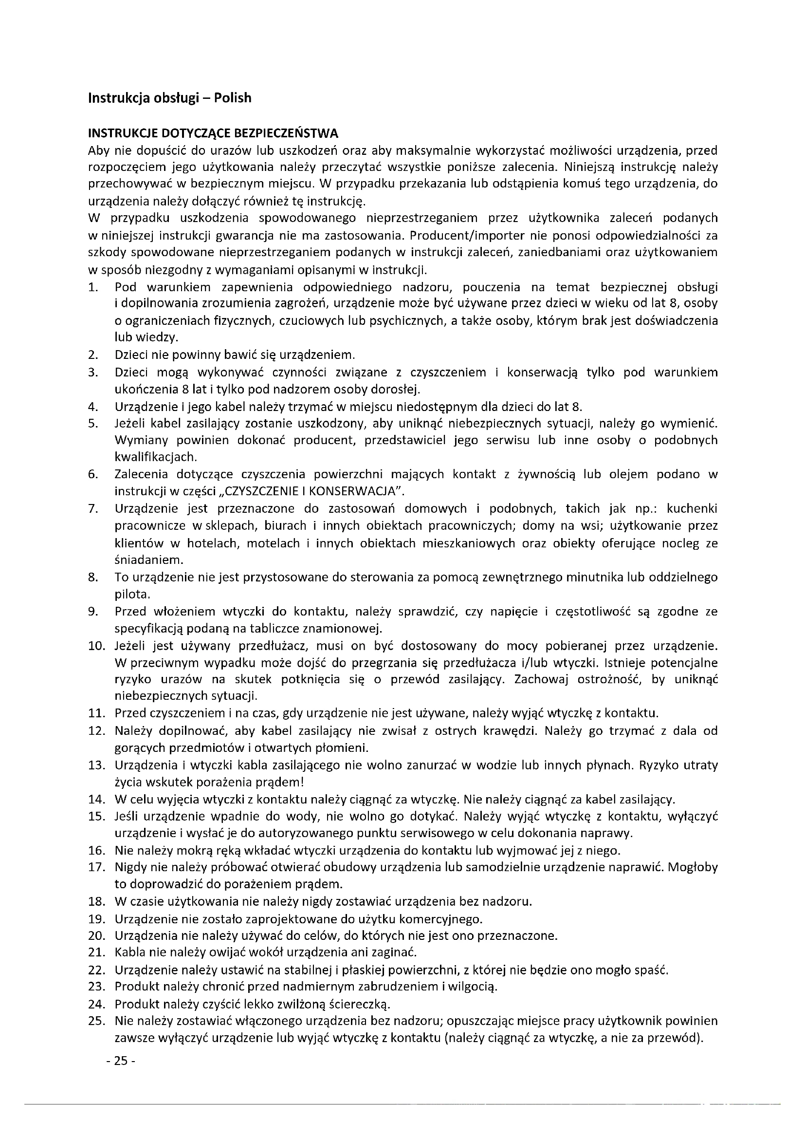 25. Nie należy zostawiać włączonego urządzenia bez nadzoru; opuszczając miejsce pracy użytkownik powinien