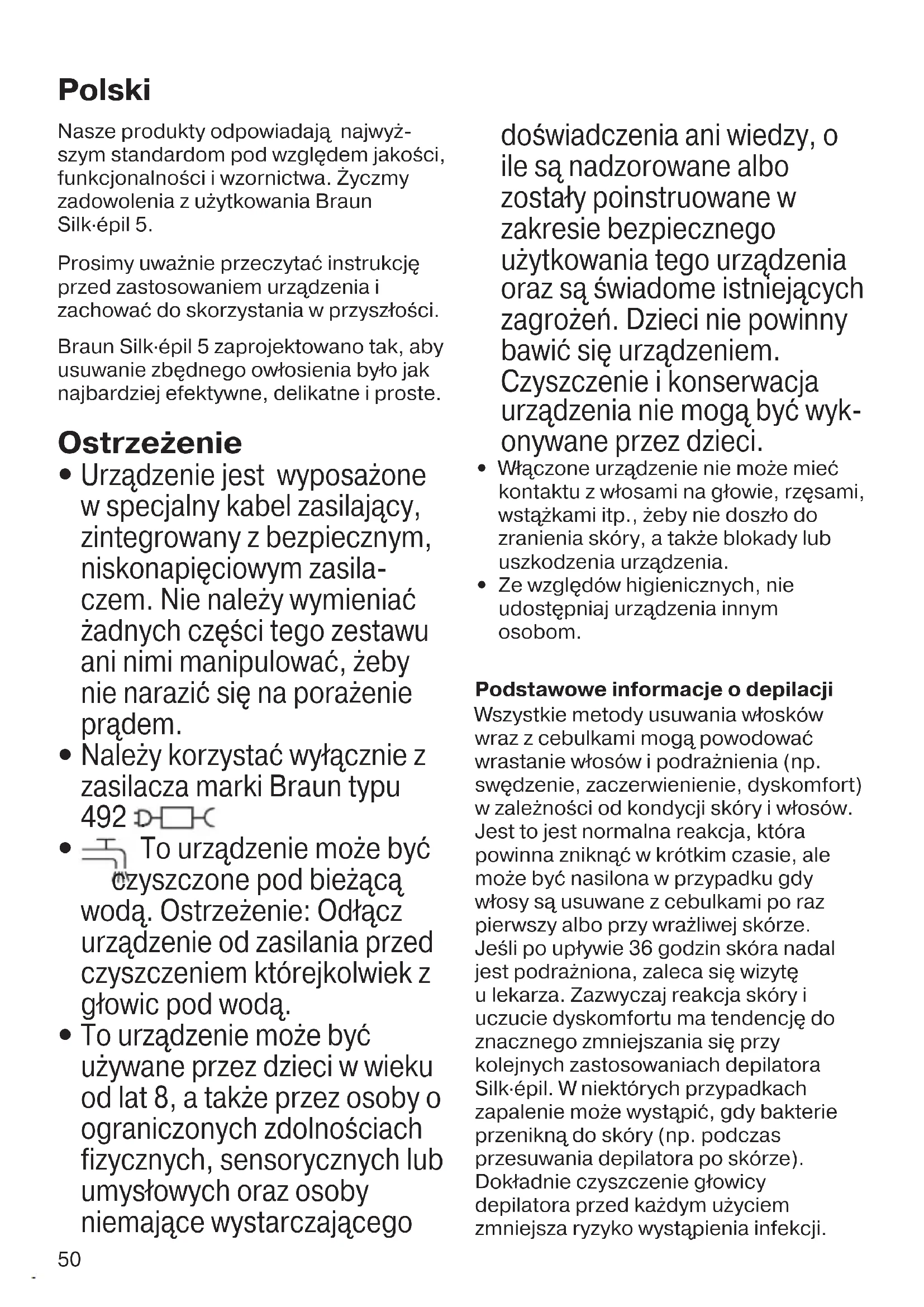 - Ze względów higienicznych, nie udostępniaj urządzenia innym osobom. Podstawowe informacje o depilacji Wszystkie metody usuwania włosków wraz z cebulkami mogą powodować wrastanie włosów i podrażnienia (np. swędzenie, zaczerwienienie, dyskomfort) w zależności od kondycji skóry i włosów. Jest to jest normalna reakcja, która powinna zniknąć w krótkim czasie, ale może być nasilona w przypadku gdy włosy są usuwane z cebulkami po raz pierwszy albo przy wrażliwej skórze. Jeśli po upływie 36 godzin skóra nadal jest podrażniona, zaleca się wizytę u lekarza. Zazwyczaj reakcja skóry i uczucie dyskomfortu ma tendencję do znacznego zmniejszania się przy kolejnych zastosowaniach depilatora Silk·épil. W niektórych przypadkach zapalenie może wystąpić, gdy bakterie przenikną do skóry (np. podczas przesuwania depilatora po skórze). Dokładnie czyszczenie głowicy depilatora przed każdym użyciem zmniejsza ryzyko wystąpienia infekcji. Polski 90340813_SE5_Power_MN.indd 5090340813_SE5_Power_MN.indd 50 02.06.22 10:4902.06.22 10:4951 W przypadku jakichkolwiek wątpliwości dotyczących zastosowania tego urządzenia skonsultuj się z lekarzem. W następujących przypadkach depilator może być stosowany tylko po wcześniej- szej konsultacji lekarskiej: – egzema, rany, stany zapalne spowodowane zapaleniem skóry, np. zapalenie mieszków włosowych (ropiejące mieszki włosowe) lub żylaki, – znamiona lub pieprzyki – zmniejszona odporność skóry , np. przy cukrzycy lub w czasie ciąży, choroba Raynauda, hemofilia, grzybica lub rak odporności. Wskazówki Jeśli nigdy wcześniej nie korzystałeś/-aś z depilatora albo od ostatniej publikacji upłynął dłuższy czas, może się zdarzyć, że skóra będzie potrzebowała trochę czasu, żeby się przyzwyczaić. Dyskomfort odczuwalny na początku zauważalnie się zmniejsza przy kolejnym użyciu, ponieważ skóra przyzwyczaja się do depilacji. Depilacja jest łatwiejsza i bardziej komfortowa, gdy włosy mają optymalną długość: 2-5 mm. Jeśli są dłuższe, zaleca się, aby najpierw je zgolić (zobacz sekcja B), a po tygodniu usunąć odrasta- jące włoski depilatorem. Pierwszą depilację zaleca się przepro- wadzić wieczorem, aby przez noc mogły zniknąć wszelkie możliwe zaczerwienienia. Dla odprężenia skóry radzimy zastosować krem nawilżający po depilacji. Odrastające delikatne włoski czasami nie mogą się przedostać na powierzchnię skóry. Regularne masowanie gąbką (np. po wzięciu prysznica) lub stosowanie złuszczającego peelingu pomaga zapobiec wrastaniu włosów, ponieważ łagodny masaż usuwa naskórek, a wtedy delikatne włoski mogą wyrosnąć na powierzchnię. Opis 1a Wałki masujące o wysokiej częstotliwości 1b Nasadka zapewniająca maksymalny kontakt ze skórą* 2 Głowica depilująca z pęsetami 3 Lampka 4 Włącznik/wyłącznik 5 Przycisk zwalniający głowicę 6 Specjalny kabel zasilający 7 Głowica goląca z nasadką i trymerem*
