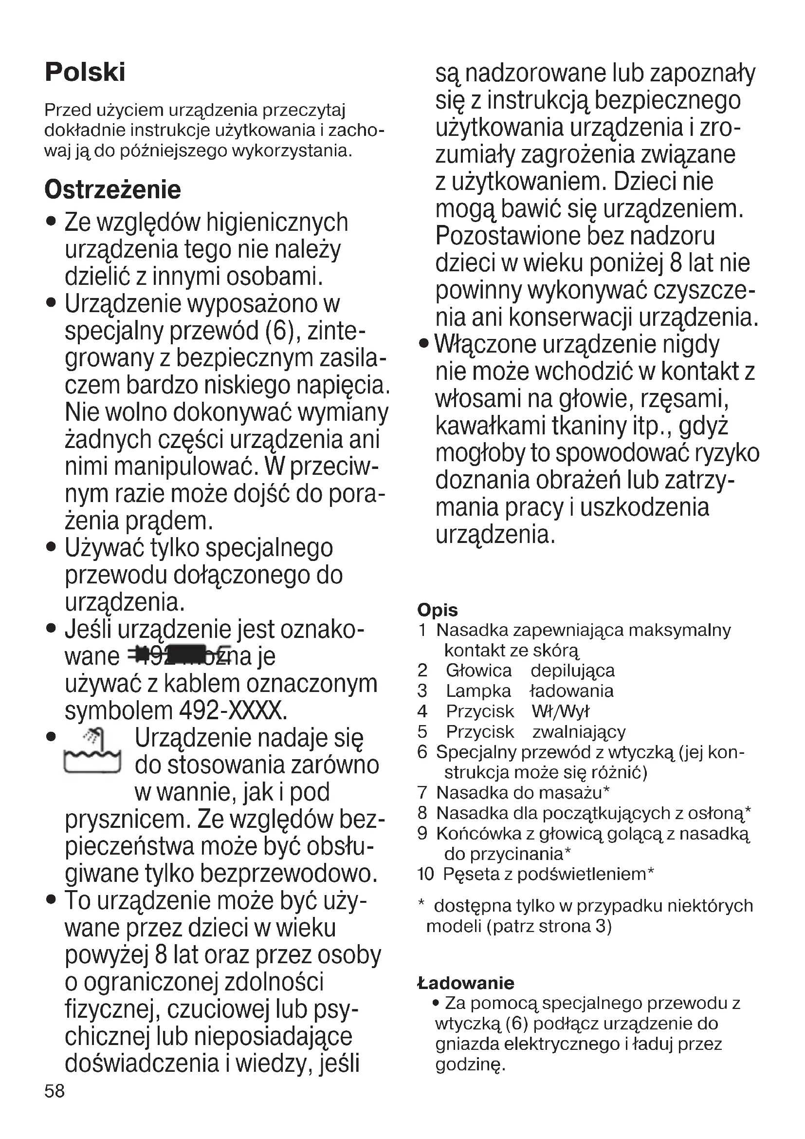 Włączone urządzenie nigdy nie może wchodzić w kontakt z włosami na głowie, rzęsami, kawałkami tkaniny itp., gdyż mogłoby to spowodować ryzyko doznania obrażeń lub zatrzy- mania pracy i uszkodzenia urządzenia. Opis 1 Nasadka zapewniająca maksymalny kontakt ze skórą 2 Głowica depilująca 3 Lampka ładowania 4 Przycisk Wł/Wył 5 Przycisk zwalniający 6 Specjalny przewód z wtyczką (jej kon- strukcja może się różnić) 7 Nasadka do masażu* 8 Nasadka dla początkujących z osłoną* 9 Końcówka z głowicą golącą z nasadką do przycinania* 0 Pęseta z podświetleniem*