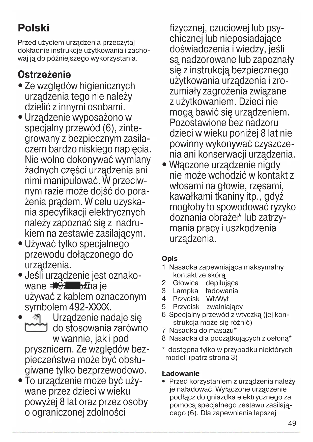 Włączone urządzenie nigdy nie może wchodzić w kontakt z włosami na głowie, rzęsami, kawałkami tkaniny itp., gdyż mogłoby to spowodować ryzyko doznania obrażeń lub zatrzy- mania pracy i uszkodzenia urządzenia. Opis 1 Nasadka zapewniająca maksymalny kontakt ze skórą 2 Głowica depilująca 3 Lampka ładowania 4 Przycisk Wł/Wył 5 Przycisk zwalniający 6 Specjalny przewód z wtyczką (jej kon- strukcja może się różnić) 7 Nasadka do masażu* 8 Nasadka dla początkujących z osłoną*