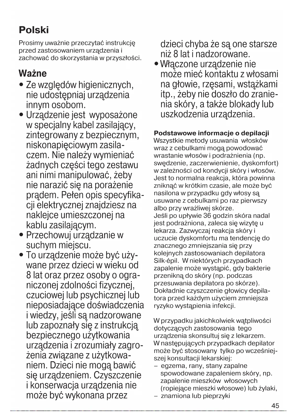 Włączone urządzenie nie może mieć kontaktu z włosami na głowie, rzęsami, wstążkami itp., żeby nie doszło do zranie- nia skóry, a także blokady lub uszkodzenia urządzenia. Podstawowe informacje o depilacji Wszystkie metody usuwania włosków wraz z cebulkami mogą powodować wrastanie włosów i podrażnienia (np. swędzenie, zaczerwienienie, dyskomfort) w zależności od kondycji skóry i włosów. Jest to normalna reakcja, która powinna zniknąć w krótkim czasie, ale może być nasilona w przypadku gdy włosy są usuwane z cebulkami po raz pierwszy albo przy wrażliwej skórze. Jeśli po upływie 36 godzin skóra nadal jest podrażniona, zaleca się wizytę u lekarza. Zazwyczaj reakcja skóry i uczucie dyskomfortu ma tendencję do znacznego zmniejszania się przy kolejnych zastosowaniach depilatora Silk·épil. W niektórych przypadkach zapalenie może wystąpić, gdy bakterie przenikną do skóry (np. podczas przesuwania depilatora po skórze). Dokładnie czyszczenie głowicy depila- tora przed każdym użyciem zmniejsza ryzyko wystąpienia infekcji. W przypadku jakichkolwiek wątpliwości dotyczących zastosowania tego urządzenia skonsultuj się z lekarzem. W następujących przypadkach depilator może być stosowany tylko po wcześniej- szej konsultacji lekarskiej: – egzema, rany, stany zapalne spowodowane zapaleniem skóry, np. zapalenie mieszków włosowych (ropiejące mieszki włosowe) lub żylaki, – znamiona lub pieprzyki Polski 91618385_SE_3273_3274_GROCERY_S6-60.indd 4591618385_SE_3273_3274_GROCERY_S6-60.indd 45 22.08.17 08:3022.08.17 08:30 CSS APPROVED Effective Date 25Aug2017 GMT - Printed 22Nov2017 Page 45 of 6046 – zmniejszona odporność skóry np. przy cukrzycy lub w czasie ciąży, choroba Raynauda – hemofilia lub brak odporności Depilacja jest łatwiejsza i bardziej komfortowa, gdy włosy mają optymalną długość: 2-5 mm. Jeśli są dłuższe, zaleca się, aby najpierw je zgolić (zobacz sekcja B), a po tygodniu usunąć odrasta- jące włoski depilatorem. Odrastające delikatne włoski czasami nie mogą się przedostać na powierzchnię skóry. Regularne masowanie gąbką (np. po wzięciu prysznica) lub stosowanie złuszczającego peelingu pomaga zapobiec wrastaniu włosów, ponieważ łagodny masaż usuwa naskórek, a wtedy delikatne włoski mogą wyrosnąć na powierzchnię. Opis 1 Wałki masujące z nasadkami 2 Głowica depilująca z pęsetami 3 Przycisk zwalniający głowicę 4 Włącznik/wyłącznik z wbudowaną lampką 5 Gniazdko 6 Specjalny kabel zasilający 7 Głowica goląca z nasadką i trymerem A Jak depilować