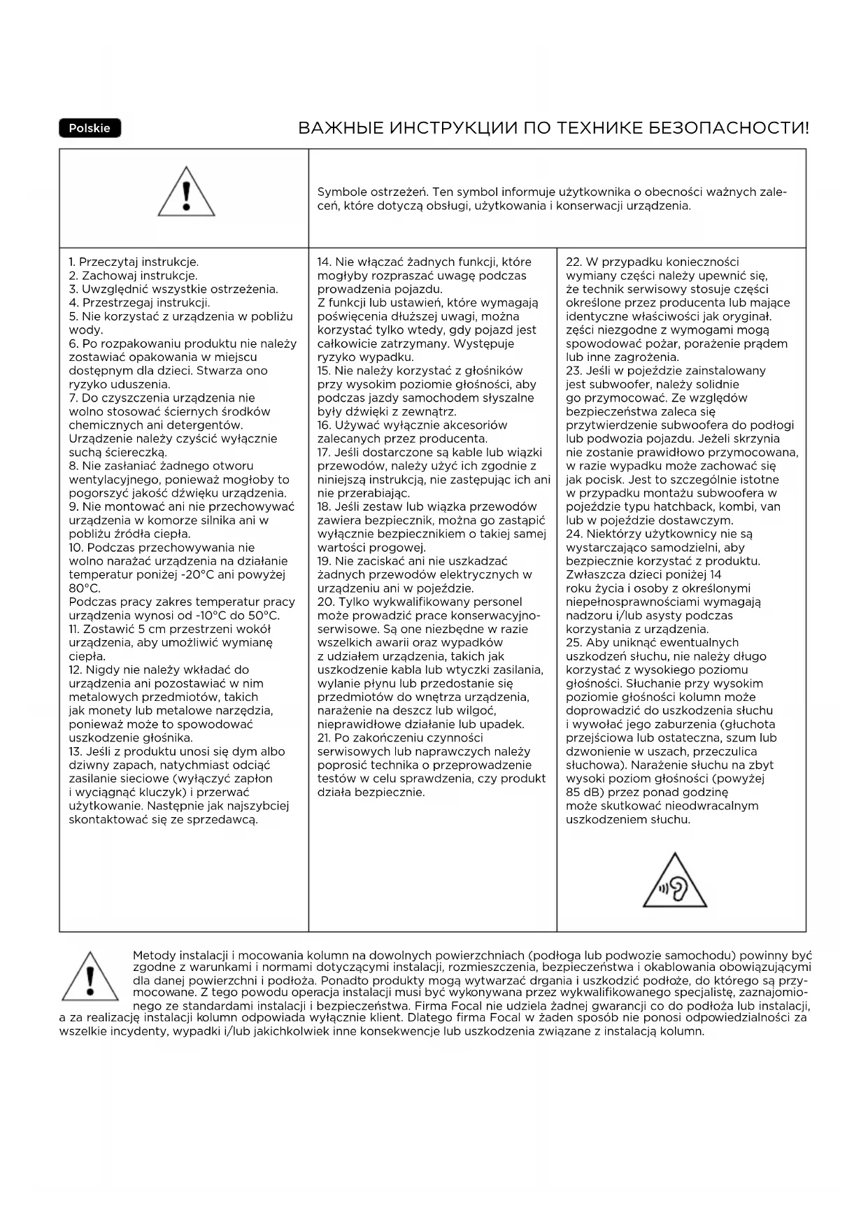 T3Y Instrukcja obsługi Deska rozdzielcza Podczas montażu podkładek do śrub zachować ostrożność, by nie upuścić śrub. Nie wiąże się z tym szczególne ryzyko, ale odnalezienie śrub może być utrudnione. Jeśli potrzebne są śruby wymienne, powinny to być śruby samogwintujące o średnicy 5mm i długości 15mm (M5x15). Miejsce na nogi Nie ruszać przewodów, w przypadku których nie jest to niezbędne. Filtr można trzymać wyłącznie w miejscu na nogi. Podczas ponownego montażu elementów miejsca na nogi pamiętać o poprawnym zamontowaniu osłony, aby zakryć złącze. Konserwacja Konserwacja głośników IW T3Y 200, ICC T3Y 100, IS T3Y 100 i IC T3Y 100 ogranicza się do usuwania kurzu za pomocą suchej ściereczki. W razie zabrudzenia kratki użyć mokrej ściereczki. Nie używać rozpuszczalników, detergentów, alkoholi lub środków żrących, skrobaków lub myjek do czyszczenia powierzchni głośników. Okres docierania Głośniki IW T3Y 200, ICC T3Y 100, IS T3Y 100 i IC T3Y 100 to złożone urządzenia mechaniczne wymagające pewnej ilości czasu, aby uzyskać maksymalną efektywność. Długość okresu docierania zmienia się w zależności od warunków i może przeciągnąć się do kilku tygodni. Aby przyspieszyć ten proces, należy włączyć głośniki na dwadzieścia godzin przy średniej głośności. Po pełnej stabilizacji parametrów działania głośników będą Państwo mogli w pełni cieszyć się jakością dźwięku oferowaną przez głośniki. Warunki gwarancji Poza Francją sprzęt Focal jest objęty gwarancją, której warunki są ustalane lokalnie przez oficjalnego dystrybutora Focal- JMlab w każdym kraju, zgodnie z przepisami obowiązującymi na danym terytorium.ВАЖНЫЕ ИНСТРУКЦИИ ПО ТЕХНИКЕ БЕЗОПАСНОСТИ!