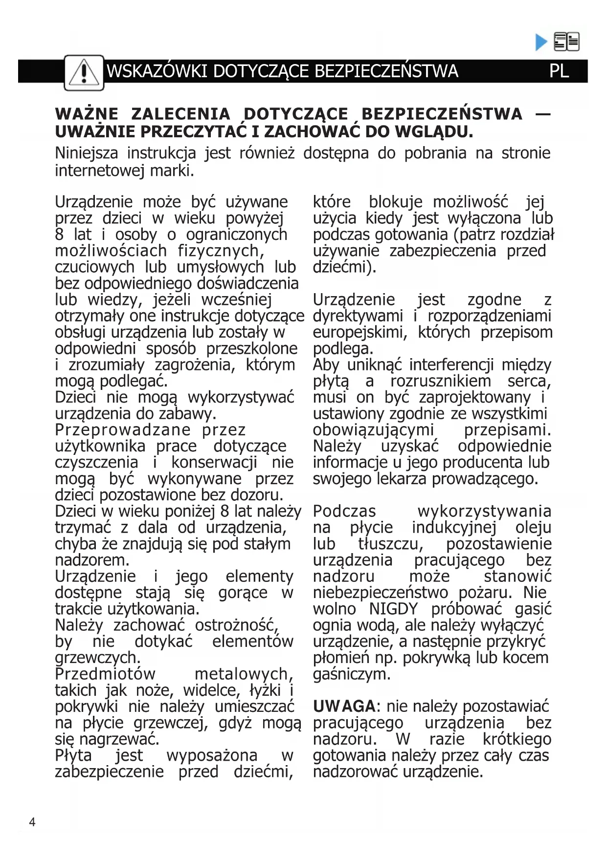 PL4 Urządzenie może być używane przez dzieci w wieku powyżej 8 lat i osoby o ograniczonych możliwościach fizycznych, czuciowych lub umysłowych lub bez odpowiedniego doświadczenia lub wiedzy, jeżeli wcześniej otrzymały one instrukcje dotyczące obsługi urządzenia lub zostały w odpowiedni sposób przeszkolone i zrozumiały zagrożenia, którym mogą podlegać. Dzieci nie mogą wykorzystywać urządzenia do zabawy. Przeprowadzane przez użytkownika prace dotyczące czyszczenia i konserwacji nie mogą być wykonywane przez dzieci pozostawione bez dozoru. Dzieci w wieku poniżej 8 lat należy trzymać z dala od urządzenia, chyba że znajdują się pod stałym nadzorem. Urządzenie i jego elementy dostępne stają się gorące w trakcie użytkowania. Należy zachować ostrożność, by nie dotykać elementów grzewczych. Przedmiotów metalowych, takich jak noże, widelce, łyżki i pokrywki nie należy umieszczać na płycie grzewczej, gdyż mogą się nagrzewać. Płyta jest wyposażona w zabezpieczenie przed dziećmi, które blokuje możliwość jej użycia kiedy jest wyłączona lub podczas gotowania (patrz rozdział używanie zabezpieczenia przed dziećmi). Urządzenie jest zgodne z dyrektywami i rozporządzeniami europejskimi, których przepisom podlega. Aby uniknąć interferencji między płytą a rozrusznikiem serca, musi on być zaprojektowany i ustawiony zgodnie ze wszystkimi obowiązującymi przepisami. Należy uzyskać odpowiednie informacje u jego producenta lub swojego lekarza prowadzącego. Podczas wykorzystywania na płycie indukcyjnej oleju lub tłuszczu, pozostawienie urządzenia pracującego bez nadzoru może stanowić niebezpieczeństwo pożaru. Nie wolno NIGDY próbować gasić ognia wodą, ale należy wyłączyć urządzenie, a następnie przykryć płomień np. pokrywką lub kocem gaśniczym. UWAGA: nie należy pozostawiać pracującego urządzenia bez nadzoru. W razie krótkiego gotowania należy przez cały czas nadzorować urządzenie. WAŻNE ZALECENIA DOTYCZĄCE BEZPIECZEŃSTWA — UWAŻNIE PRZECZYTAĆ I ZACHOWAĆ DO WGLĄDU. Niniejsza instrukcja jest również dostępna do pobrania na stronie internetowej marki.