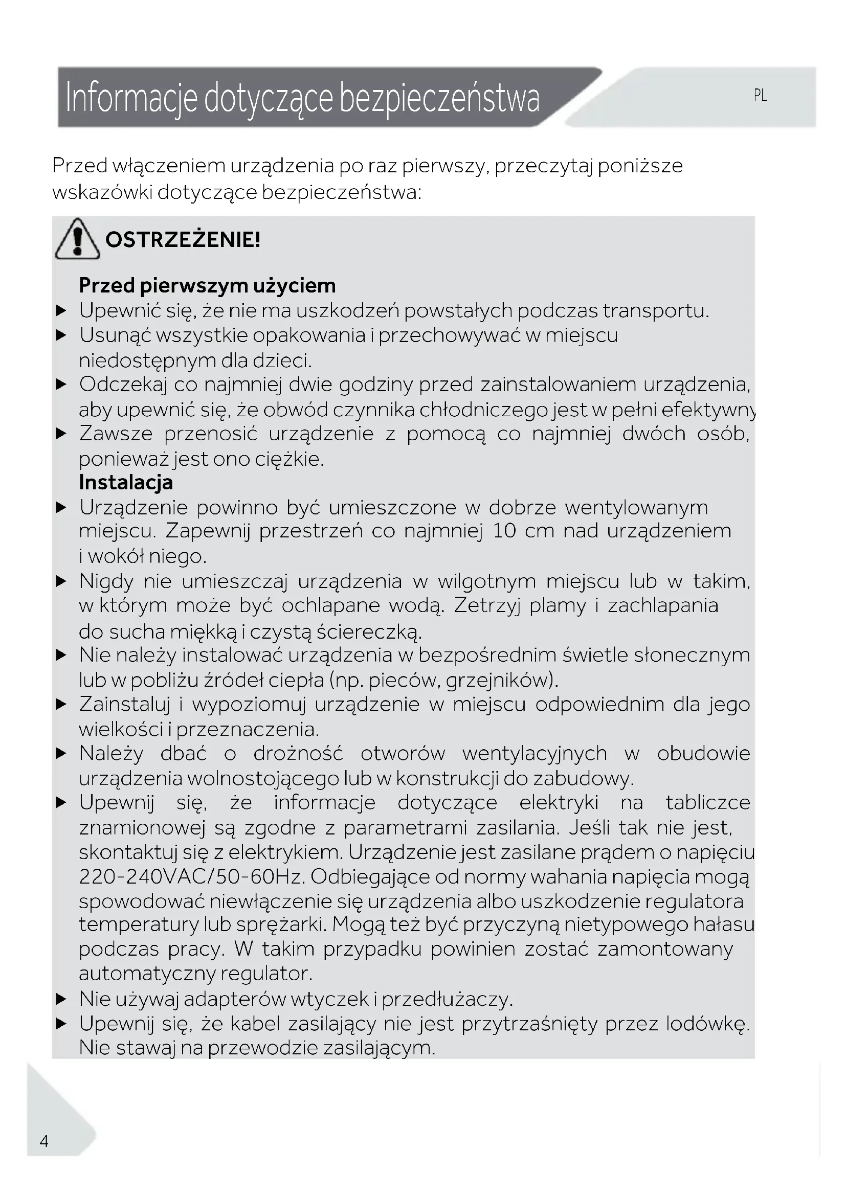 OSTRZEŻENIE! Przed pierwszym użyciem Upewnić się, że nie ma uszkodzeń powstałych podczas transportu. Usunąć wszystkie opakowania i przechowywać w miejscu niedostępnym dla dzieci. Odczekaj co najmniej dwie godziny przed zainstalowaniem urządzenia, aby upewnić się, że obwód czynnika chłodniczego jest w pełni efektywny. Zawsze przenosić urządzenie z pomocą co najmniej dwóch osób, ponieważ jest ono ciężkie. Instalacja Urządzenie powinno być umieszczone w dobrze wentylowanym miejscu. Zapewnij przestrzeń co najmniej 10 cm nad urządzeniem i wokół niego. Nigdy nie umieszczaj urządzenia w wilgotnym miejscu lub w takim, w którym może być ochlapane wodą. Zetrzyj plamy i zachlapania do sucha miękką i czystą ściereczką. Nie należy instalować urządzenia w bezpośrednim świetle słonecznym lub w pobliżu źródeł ciepła (np. pieców, grzejników). Zainstaluj i wypoziomuj urządzenie w miejscu odpowiednim dla jego wielkości i przeznaczenia. Należy dbać o drożność otworów wentylacyjnych w obudowie urządzenia wolnostojącego lub w konstrukcji do zabudowy. Upewnij się, że informacje dotyczące elektryki na tabliczce znamionowej są zgodne z parametrami zasilania. Jeśli tak nie jest, skontaktuj się z elektrykiem. Urządzenie jest zasilane prądem o napięciu 220-240VAC/50-60Hz. Odbiegające od normy wahania napięcia mogą spowodować niewłączenie się urządzenia albo uszkodzenie regulatora temperatury lub sprężarki. Mogą też być przyczyną nietypowego hałasu podczas pracy. W takim przypadku powinien zostać zamontowany automatyczny regulator. Nie używaj adapterów wtyczek i przedłużaczy. Upewnij się, że kabel zasilający nie jest przytrzaśnięty przez lodówkę. Nie stawaj na przewodzie zasilającym.PL Informacje dotyczące bezpieczeństwa