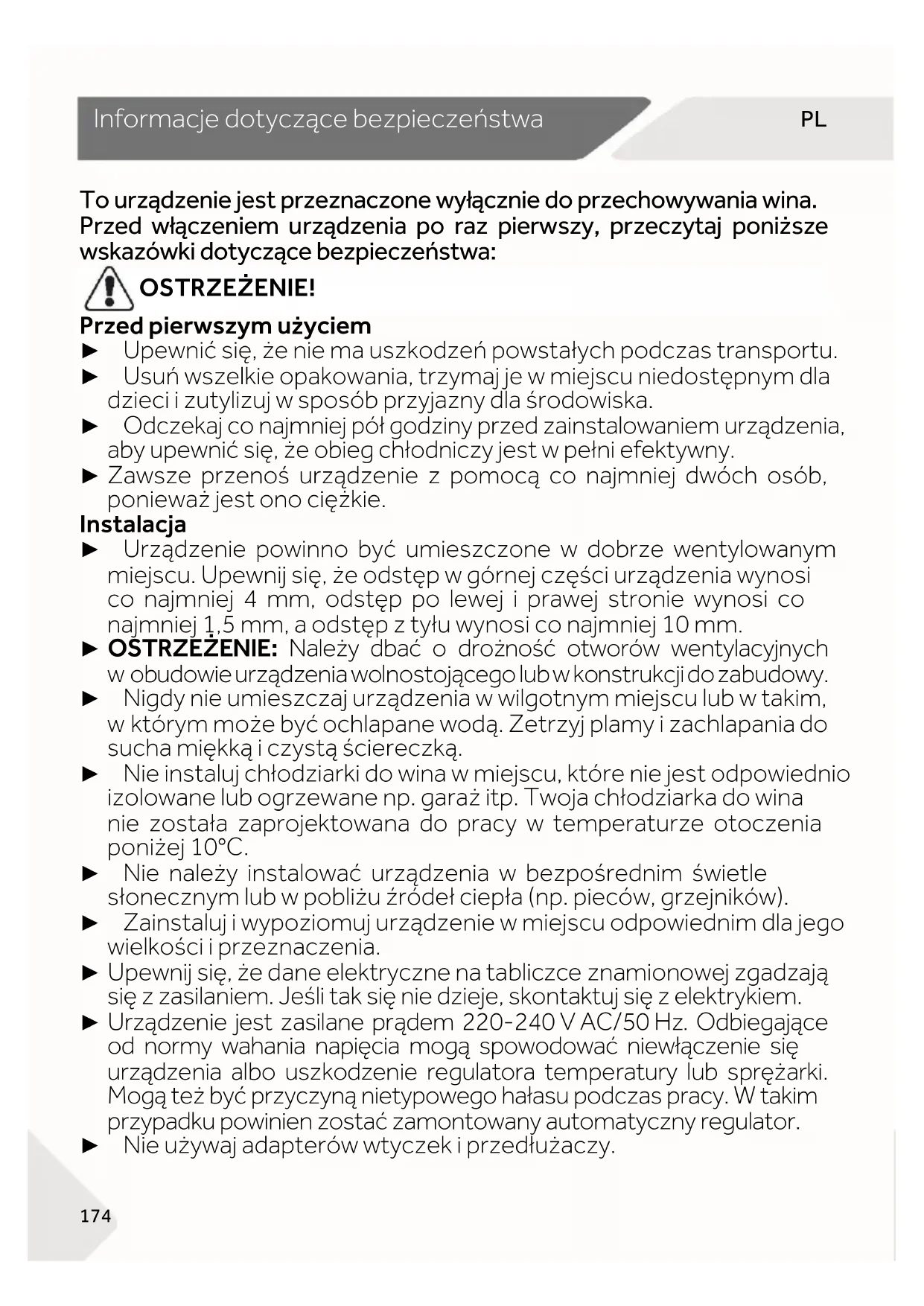 Infor mac je dot yczą ce bezpi ecz eńst wa To urządzenie jest przeznaczone wyłącznie do przechowywania wina. Przed włączeniem urządzenia po raz pierwszy, przeczytaj poniższe wskazówki dotyczące bezpieczeństwa: OSTRZEŻENIE!