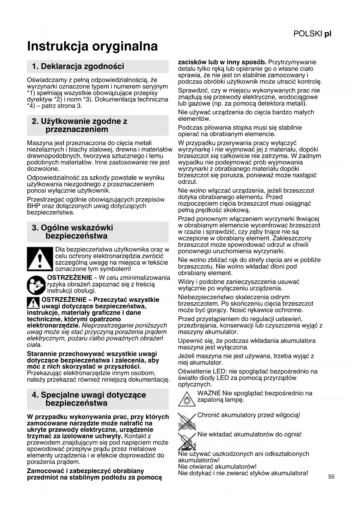 Instrukcja oryginalna Oświadczamy z pełną odpowiedzialnością, że wyrzynarki oznaczone typem i numerem seryjnym *1) spełniają wszystkie obowiązujące przepisy dyrektyw *2) i norm *3). Dokumentacja techniczna *4) – patrz strona 3. Maszyna jest przeznaczona do cięcia metali nieżelaznych i blachy stalowej, drewna i materiałów drewnopodobnych, tworzywa sztucznego i temu podobnych materiałów. Inne zastosowanie nie jest dozwolone. Odpowiedzialność za szkody powstałe w wyniku użytkowania niezgodnego z przeznaczeniem ponosi wyłącznie użytkownik. Przestrzegać ogólnie obowiązujących przepisów BHP oraz dołączonych uwag dotyczących bezpieczeństwa. Dla bezpieczeństwa użytkownika oraz w celu ochrony elektronarzędzia zwrócić szczególną uwagę na miejsca w tekście oznaczone tym symbolem! OSTRZEŻENIE – W celu zminimalizowania ryzyka obrażeń zapoznać się z treścią instrukcji obsługi. OSTRZEŻENIE – Przeczytać wszystkie uwagi dotyczące bezpieczeństwa, instrukcje, materiały graficzne i dane techniczne, którymi opatrzono elektronarzędzie. Nieprzestrzeganie poniższych uwag może się stać przyczyną porażenia prądem elektrycznym, pożaru i/albo poważnych obrażeń ciała. Starannie przechowywać wszystkie uwagi dotyczące bezpieczeństwa i zalecenia, aby móc z nich skorzystać w przyszłości. Przekazując elektronarzędzie innym osobom, należy przekazać również niniejszą dokumentację. W przypadku wykonywania prac, przy których zamocowane narzędzie może natrafić na ukryte przewody elektryczne, urządzenie trzymać za izolowane uchwyty. Kontakt z przewodem znajdującym się pod napięciem może spowodować przepływ prądu przez metalowe elementy urządzenia i w efekcie doprowadzić do porażenia prądem. Zamocować i zabezpieczyć obrabiany przedmiot na stabilnym podłożu za pomocą zacisków lub w inny sposób. Przytrzymywanie detalu tylko ręką lub opieranie go o własne ciało sprawia, że nie jest on stabilnie zamocowany i podczas obróbki użytkownik może utracić kontrolę. Sprawdzić, czy w miejscu wykonywanych prac nie znajdują się przewody elektryczne, wodociągowe lub gazowe (np. za pomocą detektora metali). Nie używać urządzenia do cięcia bardzo małych elementów. Podczas piłowania stopka musi się stabilnie opierać na obrabianym elemencie. W przypadku przerywania pracy wyłączyć wyrzynarkę i nie wyjmować jej z materiału, dopóki brzeszczot się całkowicie nie zatrzyma. W żadnym wypadku nie podejmować prób wyjmowania wyrzynarki z obrabianego materiału dopóki brzeszczot się porusza, ponieważ może nastąpić odrzut. Nie wolno włączać urządzenia, jeżeli brzeszczot dotyka obrabianego elementu. Przed rozpoczęciem cięcia brzeszczot musi osiągnąć pełną prędkość skokową. Przed ponownym włączeniem wyrzynarki tkwiącej w obrabianym elemencie wycentrować brzeszczot w rzazie i sprawdzić, czy zęby tnące nie są wczepione w obrabiany element. Zakleszczony brzeszczot może spowodować odrzut w chwili ponownego uruchomienia wyrzynarki. Nie wolno zbliżać rąk do strefy cięcia ani w pobliże brzeszczotu. Nie wolno wkładać dłoni pod obrabiany element. Wióry i podobne zanieczyszczenia usuwać wyłącznie po wyłączeniu urządzenia. Niebezpieczeństwo skaleczenia ostrym brzeszczotem. Po skończeniu cięcia brzeszczot może być gorący. Nosić rękawice ochronne. Przed przystąpieniem do regulacji ustawień, przezbrajania, konserwacji lub czyszczenia wyjąć z maszyny akumulator. Upewnić się, że podczas wkładania akumulatora maszyna jest wyłączona. Jeżeli maszyna nie jest używana, trzeba wyjąć z niej akumulator. Oświetlenie LED: nie spoglądać bezpośrednio na światło diody LED za pomocą przyrządów optycznych. WAŻNE Nie spoglądać bezpośrednio na zapaloną lampę. Chronić akumulatory przed wilgocią! Nie wkładać akumulatorów do ognia! Nie używać uszkodzonych ani odkształconych akumulatorów! Nie otwierać akumulatorów! Nie dotykać i nie zwierać styków akumulatora!