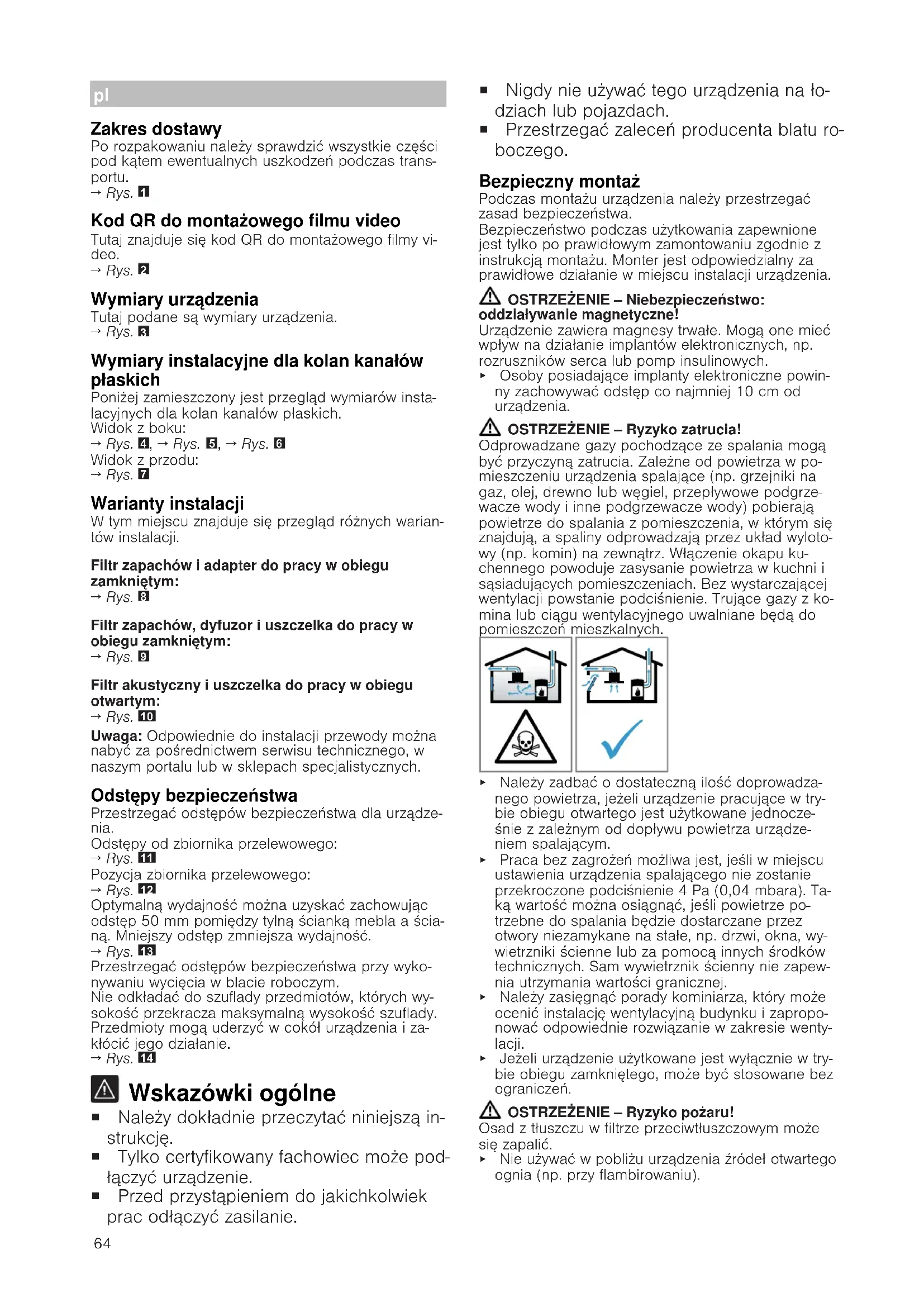 Wskazówki ogólne ¡ Należy dokładnie przeczytać niniejszą in- strukcję. ¡ Tylko certyfikowany fachowiec może pod- łączyć urządzenie. ¡ Przed przystąpieniem do jakichkolwiek prac odłączyć zasilanie. ¡ Nigdy nie używać tego urządzenia na ło- dziach lub pojazdach. ¡ Przestrzegać zaleceń producenta blatu ro- boczego. Bezpieczny montaż Podczas montażu urządzenia należy przestrzegać zasad bezpieczeństwa. Bezpieczeństwo podczas użytkowania zapewnione jest tylko po prawidłowym zamontowaniu zgodnie z instrukcją montażu. Monter jest odpowiedzialny za prawidłowe działanie w miejscu instalacji urządzenia. OSTRZEŻENIE‒Niebezpieczeństwo: oddziaływanie magnetyczne! Urządzenie zawiera magnesy trwałe. Mogą one mieć wpływ na działanie implantów elektronicznych, np. rozruszników serca lub pomp insulinowych. ▶ Osoby posiadające implanty elektroniczne powin- ny zachowywać odstęp co najmniej 10cm od urządzenia. OSTRZEŻENIE‒Ryzyko zatrucia! Odprowadzane gazy pochodzące ze spalania mogą być przyczyną zatrucia. Zależne od powietrza w po- mieszczeniu urządzenia spalające (np. grzejniki na gaz, olej, drewno lub węgiel, przepływowe podgrze- wacze wody i inne podgrzewacze wody) pobierają powietrze do spalania z pomieszczenia, w którym się znajdują, a spaliny odprowadzają przez układ wyloto- wy (np. komin) na zewnątrz. Włączenie okapu ku- chennego powoduje zasysanie powietrza w kuchni i sąsiadujących pomieszczeniach. Bez wystarczającej wentylacji powstanie podciśnienie. Trujące gazy z ko- mina lub ciągu wentylacyjnego uwalniane będą do pomieszczeń mieszkalnych. ▶ Należy zadbać o dostateczną ilość doprowadza- nego powietrza, jeżeli urządzenie pracujące w try- bie obiegu otwartego jest użytkowane jednocze- śnie z zależnym od dopływu powietrza urządze- niem spalającym. ▶ Praca bez zagrożeń możliwa jest, jeśli w miejscu ustawienia urządzenia spalającego nie zostanie przekroczone podciśnienie 4 Pa (0,04 mbara). Ta- ką wartość można osiągnąć, jeśli powietrze po- trzebne do spalania będzie dostarczane przez otwory niezamykane na stałe, np. drzwi, okna, wy- wietrzniki ścienne lub za pomocą innych środków technicznych. Sam wywietrznik ścienny nie zapew- nia utrzymania wartości granicznej. ▶ Należy zasięgnąć porady kominiarza, który może ocenić instalację wentylacyjną budynku i zapropo- nować odpowiednie rozwiązanie w zakresie wenty- lacji. ▶ Jeżeli urządzenie użytkowane jest wyłącznie w try- bie obiegu zamkniętego, może być stosowane bez ograniczeń. OSTRZEŻENIE‒Ryzyko pożaru! Osad z tłuszczu w filtrze przeciwtłuszczowym może się zapalić. ▶ Nie używać w pobliżu urządzenia źródeł otwartego ognia (np. przy flambirowaniu).65 ▶ Urządzenie można zainstalować w pobliżu pieca opalanego paliwem stałym (np. drewnem lub wę- glem) tylko wtedy, gdy występuje zamknięta, za- mocowana na stałe osłona ochronna. Nie może dochodzić do iskrzenia. OSTRZEŻENIE‒Ryzyko odniesienia obrażeń! Wszelkie zmiany i modyfikacje w zakresie układu elektrycznego lub konstrukcji mechanicznej są nie- bezpieczne i mogą być przyczyną nieprawidłowego działania urządzenia. ▶ Nie dokonywać żadnych zmian w zakresie układu elektrycznego lub konstrukcji mechanicznej. Części, które są dostępne podczas montażu, mogą mieć ostre krawędzie i powodować skaleczenia. ▶ Nosić rękawice ochronne. Urządzenie jest ciężkie. ▶ Do przenoszenia urządzenia potrzebne są 2 oso- by. ▶ Używać wyłącznie odpowiednich narzędzi pomoc- niczych. OSTRZEŻENIE‒Ryzyko uduszenia się! Dzieci mogą sobie naciągnąć materiały opakowania na głowę lub zawinąć się w nie i udusić się. ▶ Materiały z opakowania należy trzymać poza za- sięgiem dzieci. ▶ Nie pozwalać dzieciom na zabawę opakowaniem, aszczególnie folią. OSTRZEŻENIE‒Ryzyko zatrucia! Zasysane z powrotem gazy spalinowe mogą prowa- dzić do zatruć. ▶ Nie odprowadzać powietrza wylotowego do pracu- jącego komina dymowego lub komina spalinowe- go. ▶ Nie odprowadzać powietrza wylotowego do szybu, który służy do odpowietrzania pomieszczeń komin- kami. ▶ Jeżeli powietrze wylotowe ma być odprowadzane do komina dymowego lub komina spalinowego, który nie pracuje, trzeba mieć na to zgodę od od- powiedniego mistrza kominiarskiego. Odprowadzane gazy pochodzące ze spalania mogą być przyczyną zatrucia. ▶ Jeżeli okap kuchenny jest zainstalowany z komin- kiem zależnym od powietrza w pomieszczeniu, za- silanie elektryczne okapu kuchennego musi być wyposażone w odpowiedni obwód zabezpieczają- cy. Wskazówki dotyczące przyłącza elektrycznego Aby móc bezpiecznie podłączyć urządzenie do sieci elektrycznej, należy przestrzegać poniższych wskazó- wek. OSTRZEŻENIE‒Ryzyko porażenia prądem! Odłączenie urządzenia od zasilania musi być możli- we w każdej chwili. Urządzenie można podłączyć wy- łącznie do gniazda zainstalowanego zgodnie z prze- pisami. ▶ Jeśli nie jest to możliwe, w stałej instalacji elek- trycznej należy zamontować rozłącznik wielobiegu- nowy zgodnie z warunkami kategorii przepięciowej III i przepisami instalacyjnymi. ▶ Jedynie osoba z uprawnieniami elektryka może wykonać stałą instalację elektryczną. Zalecamy za- instalowanie wyłącznika różnicowo-prądowego (wyłącznik RP) w obwodzie elektrycznym zasilania urządzenia. ¡ Nie zaginać ani nie zaciskać przewodu przyłącze- niowego i trzymać go z dala od ostrych krawędzi. ¡ Ułożyć kabel przyłączeniowy tak, aby nie dotykał gorącej obudowy urządzenia. ¡ Używać wyłącznie przewodu przyłączeniowego do- starczonego wraz z urządzeniem lub przewodu do- starczonego przez serwisanta. ¡ To urządzenie spełnia wymogi zarządzeń WE w sprawie układów przeciwzakłóceniowych. ¡ Urządzenie odpowiada klasie ochrony 1. Dlatego może być użytkowane wyłącznie, jeś
