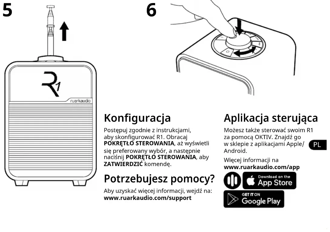 Konguracja Postępuj zgodnie z instrukcjami, aby skongurować R1. Obracaj POKRĘTŁO STEROWANIA, aż wyświetli się preferowany wybór, a następnie naciśnij POKRĘTŁO STEROWANIA, aby ZATWIERDZIĆ komendę. Potrzebujesz pomocy? Aby uzyskać więcej informacji, wejdź na: www.ruarkaudio.com/support Aplikacja sterująca Możesz także sterować swoim R1 za pomocą OKTIV. Znajdź go w sklepie z aplikacjami Apple/ Android. Więcej informacji na www.ruarkaudio.com/appSterownica