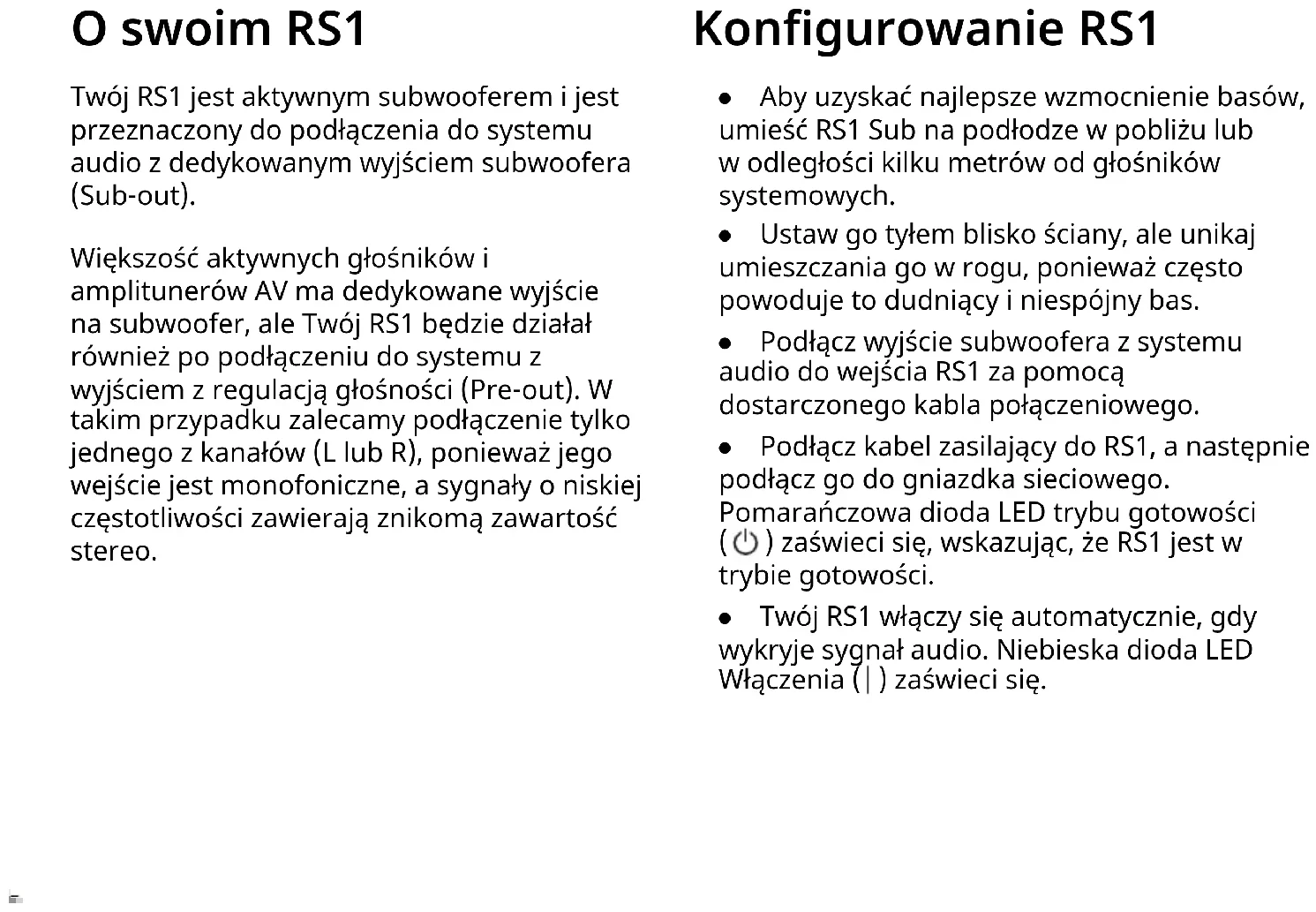 Dostrajanie RS1 ● Akustyka każdego pomieszczenia jest inna, a czas spędzony na dostrajaniu RS1 tak, aby płynnie łączył się z Twoim systemem, jest ważny. ● Przy prawidłowym ustawieniu powinieneś być nieświadomy, że basy pochodzą z twojego RS1 i powinno brzmieć tak, jakby cały bas był wytwarzany przez głośniki twojego systemu. ● Zacznij od ustawienia zwrotnicy i regulatorów poziomu głośności mniej więcej w połowie. ● Słuchaj różnorodnej muzyki, którą dobrze znasz i dostosuj poziom głośności swojego RS1, aby pasował do twojego systemu. ● Eksperymentuj z częstotliwością podziału, poziomem głośności i przełącznikiem fazy, aż będziesz zadowolony z basów. ● Podczas strojenia RS1 ważne jest, aby powrócić do tej samej pozycji odsłuchowej, aby ocenić efekt. ● Ostateczne dostrojenie zależy od Twojego gustu i preferencji, ale jeśli masz świadomość, że źródłem basów jest subwoofer, prawdopodobnie częstotliwość podziału jest ustawiona zbyt wysoko lub głośność subwoofera jest zbyt duża.Automatyczne czuwanie ● Twój RS1 Sub ma funkcję automatycznego czuwania i jest zaprojektowany tak, aby zawsze był podłączony do gniazdka sieciowego. ● Gdy nie ma sygnału audio, Twój RS1 Sub pozostanie w stanie gotowości z niskim poborem mocy i włączy się tylko wtedy, gdy wykryje wejście audio. ● Po około 20 minutach braku dźwięku, Twój RS1 Sub powróci do trybu gotowości z niskim poborem mocy. Ochrona przed przeładowaniem ● Twój RS1 Sub ma zaawansowaną funkcję miękkiego obcinania, która zapobiega zniekształceniom i przeciążeniu termicznemu przy wysokim poziomie odsłuchu. ● W mało prawdopodobnym przypadku przegrzania obie diody LED stanu będą migać, a wyjście audio zostanie odcięte do czasu ustabilizowania się temperatury wewnętrznej. Zwykle trwa to kilkaEN