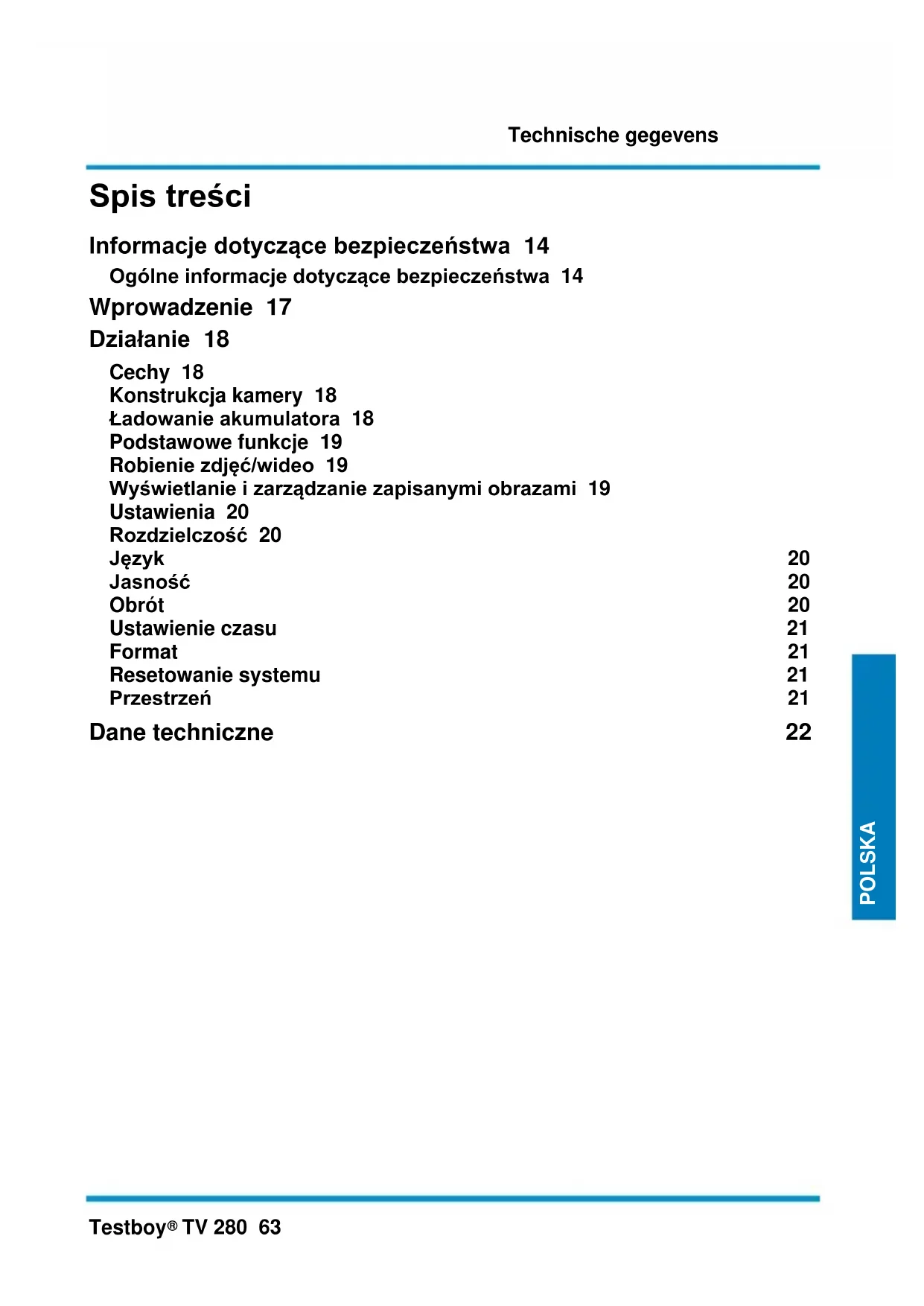 TV 280 63 POLSKA Spis treści Informacje dotyczące bezpieczeństwa 14 Ogólne informacje dotyczące bezpieczeństwa 14 Wprowadzenie 17 Działanie 18 Cechy 18 Konstrukcja kamery 18 Ładowanie akumulatora 18 Podstawowe funkcje 19 Robienie zdjęć/wideo 19 Wyświetlanie i zarządzanie zapisanymi obrazami 19 Ustawienia 20 Rozdzielczość 20 Język 20 Jasność 20 Obrót 20 Ustawienie czasu 21 Format 21 Resetowanie systemu 21 Przestrzeń 21 Dane techniczne 22Informacje dotyczące bezpieczeństwa Testboy