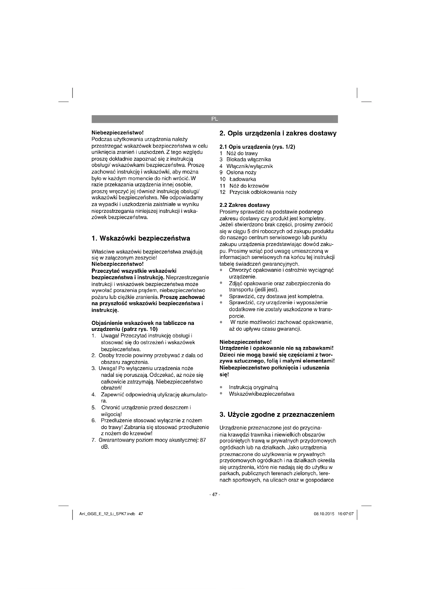 Urządzenie przeznaczone jest do przycina- nia krawędzi trawnika i niewielkich obszarów porośniętych trawą w prywatnych przydomowych ogródkach lub na działkach. Jako urządzenia przeznaczone do użytkowania w prywatnych przydomowych ogródkach i na działkach określa się urządzenia, które nie nadają się do użytku w parkach, publicznych terenach zielonych, tere- nach sportowych, na ulicach oraz w gospodarce Anl_GGS_E_12_Li_SPK7.indb 47Anl_GGS_E_12_Li_SPK7.indb 47 08.10.2015 16:07:0708.10.2015 16:07:07PL