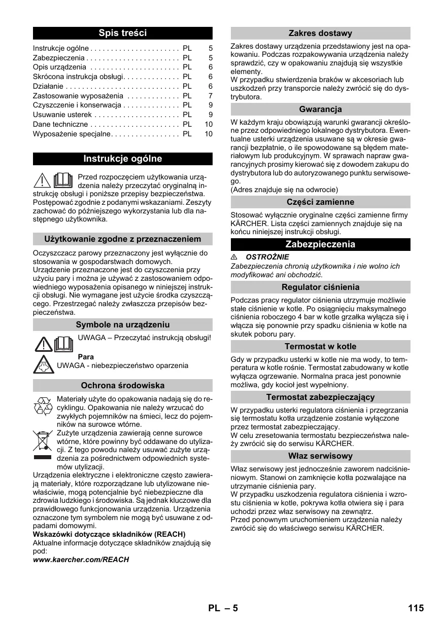 Instrukcje ogólne Przed rozpoczęciem użytkowania urządzenia należy przeczytać oryginalną instrukcję obsługi i poniższe przepisy bezpieczeństwa. Postępować zgodnie z podanymi wskazaniami. Zeszyty zachować do późniejszego wykorzystania lub dla następnego użytkownika. Użytkowanie zgodne z przeznaczeniem Oczyszczacz parowy przeznaczony jest wyłącznie do stosowania w gospodarstwach domowych. Urządzenie przeznaczone jest do czyszczenia przy użyciu pary i można je używać z zastosowaniem odpowiedniego wyposażenia opisanego w niniejszej instrukcji obsługi. Nie wymagane jest użycie środka czyszczącego. Przestrzegać należy zwłaszcza przepisów bezpieczeństwa. Symbole na urządzeniu UWAGA – Przeczytać instrukcją obsługi! Para UWAGA - niebezpieczeństwo oparzenia Zakres dostawy urządzenia przedstawiony jest na opakowaniu. Podczas rozpakowywania urządzenia należy sprawdzić, czy w opakowaniu znajdują się wszystkie elementy. W przypadku stwierdzenia braków w akcesoriach lub uszkodzeń przy transporcie należy zwrócić się do dystrybutora. Gwarancja W każdym kraju obowiązują warunki gwarancji określone przez odpowiedniego lokalnego dystrybutora. Ewentualne usterki urządzenia usuwane są w okresie gwarancji bezpłatnie, o ile spowodowane są błędem materiałowym lub produkcyjnym. W sprawach napraw gwarancyjnych prosimy kierować się z dowodem zakupu do dystrybutora lub do autoryzowanego punktu serwisowego. (Adres znajduje się na odwrocie) Części zamienne Stosować wyłącznie oryginalne części zamienne firmy KÄRCHER. Lista części zamiennych znajduje się na końcu niniejszej instrukcji obsługi. Zabezpieczenia 몇 OSTROŻNIE Zabezpieczenia chronią użytkownika i nie wolno ich modyfikować ani obchodzić. Regulator ciśnienia Podczas pracy regulator ciśnienia utrzymuje możliwie stałe ciśnienie w kotle. Po osiągnięciu maksymalnego ciśnienia roboczego 4 bar w kotle grzałka wyłącza się i włącza się ponownie przy spadku ciśnienia w kotle na skutek poboru pary. Termostat w kotle Gdy w przypadku usterki w kotle nie ma wody, to temperatura w kotle rośnie. Termostat zabudowany w kotle wyłącza ogrzewanie. Normalna praca jest ponownie możliwa, gdy kocioł jest wypełniony. Ochrona środowiska Materiały użyte do opakowania nadają się do recyklingu. Opakowania nie należy wrzucać do zwykłych pojemników na śmieci, lecz do pojemników na surowce wtórne. Zużyte urządzenia zawierają cenne surowce wtórne, które powinny być oddawane do utylizacji. Z tego powodu należy usuwać zużyte urządzenia za pośrednictwem odpowiednich systemów utylizacji. Urządzenia elektryczne i elektroniczne często zawierają materiały, które rozporządzane lub utylizowane niewłaściwie, mogą potencjalnie być niebezpieczne dla zdrowia ludzkiego i środowiska. Są jednak kluczowe dla prawidłowego funkcjonowania urządzenia. Urządzenia oznaczone tym symbolem nie mogą być usuwane z odpadami domowymi. Wskazówki dotyczące składników (REACH) Aktualne informacje dotyczące składników znajdują się pod: www.kaercher.com/REACH Termostat zabezpieczający W przypadku usterki regulatora ciśnienia i przegrzania się termostatu kotła urządzenie zostanie wyłączone przez termostat zabezpieczający. W celu zresetowania termostatu bezpieczeństwa należy zwrócić się do serwisu KÄRCHER. Właz serwisowy Właz serwisowy jest jednocześnie zaworem nadciśnieniowym. Stanowi on zamknięcie kotła pozwalające na utrzymanie ciśnienia pary. W przypadku uszkodzenia regulatora ciśnienia i wzrostu ciśnienia w kotle, pokrywa kotła otwiera się i para uchodzi przez właz serwisowy na zewnątrz. Przed ponownym uruchomieniem urządzenia należy zwrócić się do właściwego serwisu KÄRCHER. PL – 5