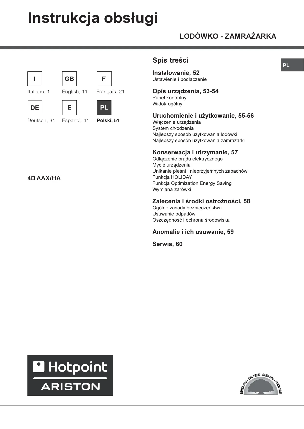 4D AAB/HA, 4D AAB/HA - Lodówka z zamrażarką HOTPOINT - Bezpłatna instrukcja obsługi