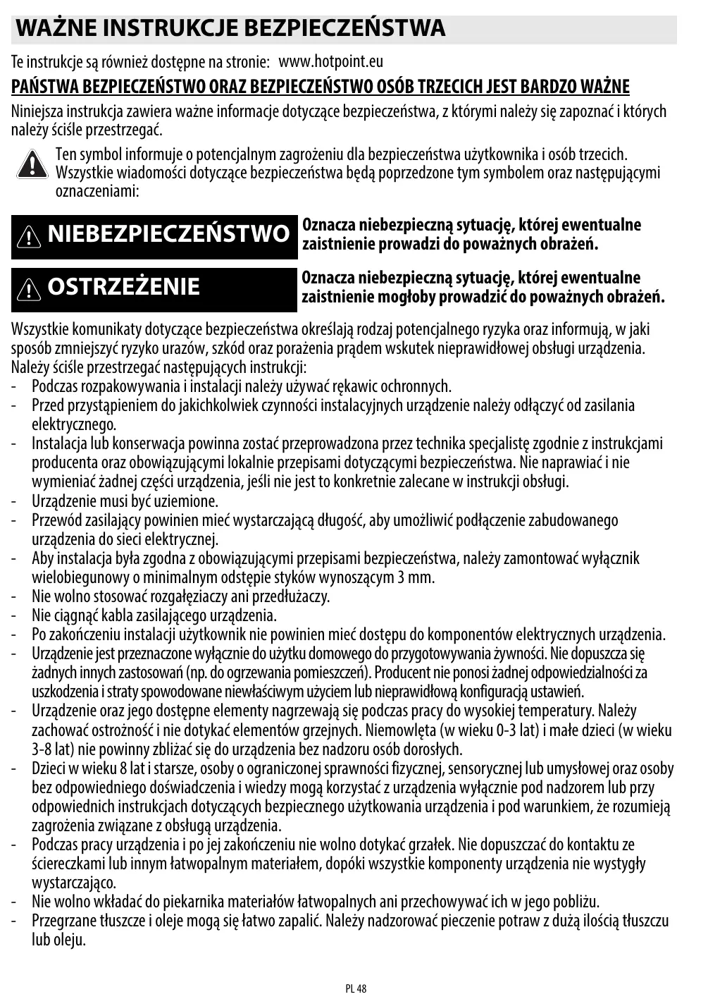 Te instrukcje są również dostępne na stronie: www.hotpoint.eu PAŃSTWA BEZPIECZEŃSTWO ORAZ BEZPIECZEŃSTWO OSÓB TRZECICH JEST BARDZO WAŻNE Niniejsza instrukcja zawiera ważne informacje dotyczące bezpieczeństwa, z którymi należy się zapoznać i których należy ściśle przestrzegać. Ten symbol informuje o potencjalnym zagrożeniu dla bezpieczeństwa użytkownika i osób trzecich. Wszystkie wiadomości dotyczące bezpieczeństwa będą poprzedzone tym symbolem oraz następującymi oznaczeniami: NIEBEZPIECZEŃSTWO Oznacza niebezpieczną sytuację, której ewentualne zaistnienie prowadzi do poważnych obrażeń. OSTRZEŻENIE Oznacza niebezpieczną sytuację, której ewentualne zaistnienie mogłoby prowadzić do poważnych obrażeń. Wszystkie komunikaty dotyczące bezpieczeństwa określają rodzaj potencjalnego ryzyka oraz informują, w jaki sposób zmniejszyć ryzyko urazów, szkód oraz porażenia prądem wskutek nieprawidłowej obsługi urządzenia. Należy ściśle przestrzegać następujących instrukcji: - Podczas rozpakowywania i instalacji należy używać rękawic ochronnych. - Przed przystąpieniem do jakichkolwiek czynności instalacyjnych urządzenie należy odłączyć od zasilania elektrycznego. - Instalacja lub konserwacja powinna zostać przeprowadzona przez technika specjalistę zgodnie z instrukcjami producenta oraz obowiązującymi lokalnie przepisami dotyczącymi bezpieczeństwa. Nie naprawiać i nie wymieniać żadnej części urządzenia, jeśli nie jest to konkretnie zalecane w instrukcji obsługi. - Urządzenie musi być uziemione. - Przewód zasilający powinien mieć wystarczającą długość, aby umożliwić podłączenie zabudowanego urządzenia do sieci elektrycznej. - Aby instalacja była zgodna z obowiązującymi przepisami bezpieczeństwa, należy zamontować wyłącznik wielobiegunowy o minimalnym odstępie styków wynoszącym 3 mm. - Nie wolno stosować rozgałęziaczy ani przedłużaczy. - Nie ciągnąć kabla zasilającego urządzenia. - Po zakończeniu instalacji użytkownik nie powinien mieć dostępu do komponentów elektrycznych urządzenia. - Urządzenie jest przeznaczone wyłącznie do użytku domowego do przygotowywania żywności. Nie dopuszcza się żadnych innych zastosowań (np. do ogrzewania pomieszczeń). Producent nie ponosi żadnej odpowiedzialności za uszkodzenia i straty spowodowane niewłaściwym użyciem lub nieprawidłową konfiguracją ustawień. - Urządzenie oraz jego dostępne elementy nagrzewają się podczas pracy do wysokiej temperatury. Należy zachować ostrożność i nie dotykać elementów grzejnych. Niemowlęta (w wieku 0-3 lat) i małe dzieci (w wieku 3-8 lat) nie powinny zbliżać się do urządzenia bez nadzoru osób dorosłych. - Dzieci w wieku 8 lat i starsze, osoby o ograniczonej sprawności fizycznej, sensorycznej lub umysłowej oraz osoby bez odpowiedniego doświadczenia i wiedzy mogą korzystać z urządzenia wyłącznie pod nadzorem lub przy odpowiednich instrukcjach dotyczących bezpiecznego użytkowania urządzenia i pod warunkiem, że rozumieją zagrożenia związane z obsługą urządzenia. - Podczas pracy urządzenia i po jej zakończeniu nie wolno dotykać grzałek. Nie dopuszczać do kontaktu ze ściereczkami lub innym łatwopalnym materiałem, dopóki wszystkie komponenty urządzenia nie wystygły wystarczająco. - Nie wolno wkładać do piekarnika materiałów łatwopalnych ani przechowywać ich w jego pobliżu. - Przegrzane tłuszcze i oleje mogą się łatwo zapalić. Należy nadzorować pieczenie potraw z dużą ilością tłuszczu lub oleju. PL 48 - Urządzenie może być obsługiwane przez dzieci powyżej 8 roku życia oraz osoby o ograniczonych zdolnościach fizycznych, sensorycznych lub umysłowych, a także nieposiadające wiedzy lub doświadczenia, jeśli będą one nadzorowane lub zostaną poinstruowane w zakresie bezpiecznego korzystania z tego urządzenia i będą świadome związanych z tym zagrożeń. Dzieci nie mogą bawić się urządzeniem. Urządzenie nie powinno być czyszczone ani konserwowane przez dzieci bez nadzoru. - Nie kłaść na polu grzejnym przedmiotów metalowych, np. przyrządów kuchennych (noży, widelców, łyżek,…), pokrywek ani innych podobnych, ponieważ mogą się one rozgrzać do wysokiej temperatury. - We wnęce pod urządzeniem należy zainstalować panel oddzielający, który nie został dostarczony w komplecie. - Jeśli na powierzchni pojawią się pęknięcia, należy wyłączyć urządzenie, aby uniknąć ryzyka porażenia prądem elektrycznym (dotyczy tylko urządzeń ze szklaną powierzchnią). - Urządzenia nie można włączać przy pomocy zewnętrznego timera ani oddzielnego systemu zdalnego sterowania. - Pozostawienie urządzenia bez nadzoru podczas przyrządzania potraw z użyciem oleju i tłuszczu może spowodować zagrożenie oraz może prowadzić do pożaru. Pożaru NIGDY nie wolno gasić wodą! Należy wyłączyć urządzenie i przykryć ogień np. pokrywką lub kocem gaśniczym. Ryzyko pożaru: nie przechowywać żadnych rzeczy na powierzchniach gotowania. - Nie stosować urządzeń czyszczących parą! - Na powierzchni płyty nie wolno kłaść sztućców ani pokrywek do garnków, gdyż mogą się one rozgrzać do wysokiej temperatury. - Po zakończeniu używania płyty należy wyłączyć pole grzejne za pomocą pokrętła a nie polegać na układzie wykrywania obecności naczynia (dotyczy tylko urządzeń z funkcją indukcji).