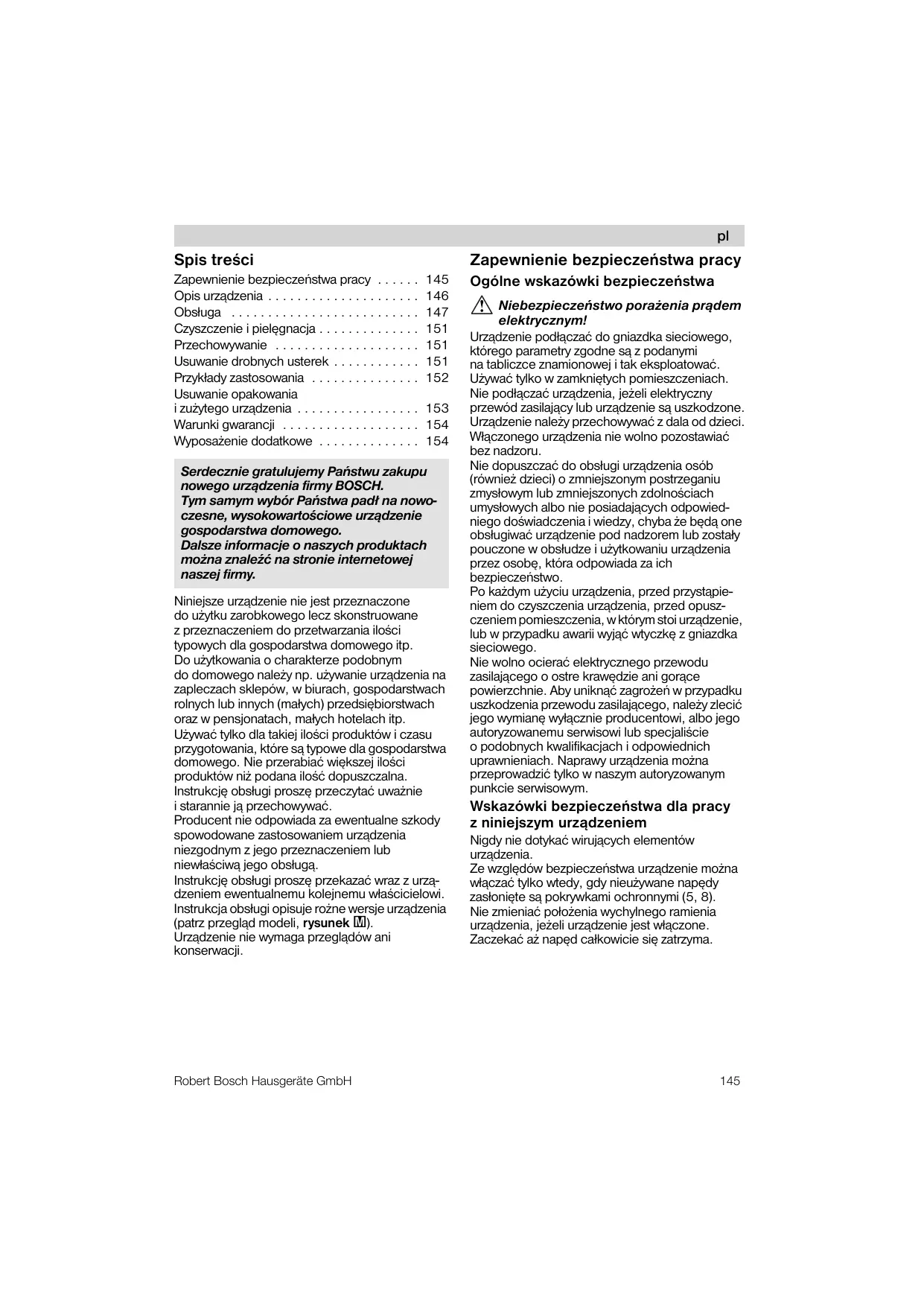 Serdecznie gratulujemy Pañstwu zakupu nowego urz¹dzenia firmy BOSCH. Tym samym wybór Pañstwa padł na nowoczesne, wysokowartoœciowe urz¹dzenie gospodarstwa domowego. Dalsze informacje o naszych produktach mo¿na znaleŸć na stronie internetowej naszej firmy. Niniejsze urz¹dzenie nie jest przeznaczone do u¿ytku zarobkowego lecz skonstruowane z przeznaczeniem do przetwarzania iloœci typowych dla gospodarstwa domowego itp. Do u¿ytkowania o charakterze podobnym do domowego nale¿y np. u¿ywanie urz¹dzenia na zapleczach sklepów, w biurach, gospodarstwach rolnych lub innych (małych) przedsiêbiorstwach oraz w pensjonatach, małych hotelach itp. U¿ywać tylko dla takiej iloœci produktów i czasu przygotowania, które s¹ typowe dla gospodarstwa domowego. Nie przerabiać wiêkszej iloœci produktów ni¿ podana iloœć dopuszczalna. Instrukcjê obsługi proszê przeczytać uwa¿nie i starannie j¹ przechowywać. Producent nie odpowiada za ewentualne szkody spowodowane zastosowaniem urz¹dzenia niezgodnym z jego przeznaczeniem lub niewłaœciw¹ jego obsług¹. Instrukcjê obsługi proszê przekazać wraz z urz¹dzeniem ewentualnemu kolejnemu właœcicielowi. Instrukcja obsługi opisuje ro¿ne wersje urz¹dzenia (patrz przegl¹d modeli, rysunek ). Urz¹dzenie nie wymaga przegl¹dów ani konserwacji. oçÄÉêí=_çëÅÜ=e~ìëÖÉê®íÉ=dãÄe Ogólne wskazówki bezpieczeñstwa Niebezpieczeñstwo pora¿enia pr¹dem elektrycznym! Urz¹dzenie podł¹czać do gniazdka sieciowego, którego parametry zgodne s¹ z podanymi na tabliczce znamionowej i tak eksploatować. U¿ywać tylko w zamkniêtych pomieszczeniach. Nie podł¹czać urz¹dzenia, je¿eli elektryczny przewód zasilaj¹cy lub urz¹dzenie s¹ uszkodzone. Urz¹dzenie nale¿y przechowywać z dala od dzieci. Wł¹czonego urz¹dzenia nie wolno pozostawiać bez nadzoru. Nie dopuszczać do obsługi urz¹dzenia osób (równie¿ dzieci) o zmniejszonym postrzeganiu zmysłowym lub zmniejszonych zdolnoœciach umysłowych albo nie posiadaj¹cych odpowiedniego doœwiadczenia i wiedzy, chyba ¿e bêd¹ one obsługiwać urz¹dzenie pod nadzorem lub zostały pouczone w obsłudze i u¿ytkowaniu urz¹dzenia przez osobê, która odpowiada za ich bezpieczeñstwo. Po ka¿dym u¿yciu urz¹dzenia, przed przyst¹pieniem do czyszczenia urz¹dzenia, przed opuszczeniem pomieszczenia, w którym stoi urz¹dzenie, lub w przypadku awarii wyj¹ć wtyczkê z gniazdka sieciowego. Nie wolno ocierać elektrycznego przewodu zasilaj¹cego o ostre krawêdzie ani gor¹ce powierzchnie. Aby unikn¹ć zagro¿eñ w przypadku uszkodzenia przewodu zasilaj¹cego, nale¿y zlecić jego wymianê wył¹cznie producentowi, albo jego autoryzowanemu serwisowi lub specjaliœcie o podobnych kwalifikacjach i odpowiednich uprawnieniach. Naprawy urz¹dzenia mo¿na przeprowadzić tylko w naszym autoryzowanym punkcie serwisowym. Wskazówki bezpieczeñstwa dla pracy z niniejszym urz¹dzeniem Nigdy nie dotykać wiruj¹cych elementów urz¹dzenia. Ze wzglêdów bezpieczeñstwa urz¹dzenie mo¿na wł¹czać tylko wtedy, gdy nieu¿ywane napêdy zasłoniête s¹ pokrywkami ochronnymi (5, 8). Nie zmieniać poło¿enia wychylnego ramienia urz¹dzenia, je¿eli urz¹dzenie jest wł¹czone. Zaczekać a¿ napêd całkowicie siê zatrzyma. NQR