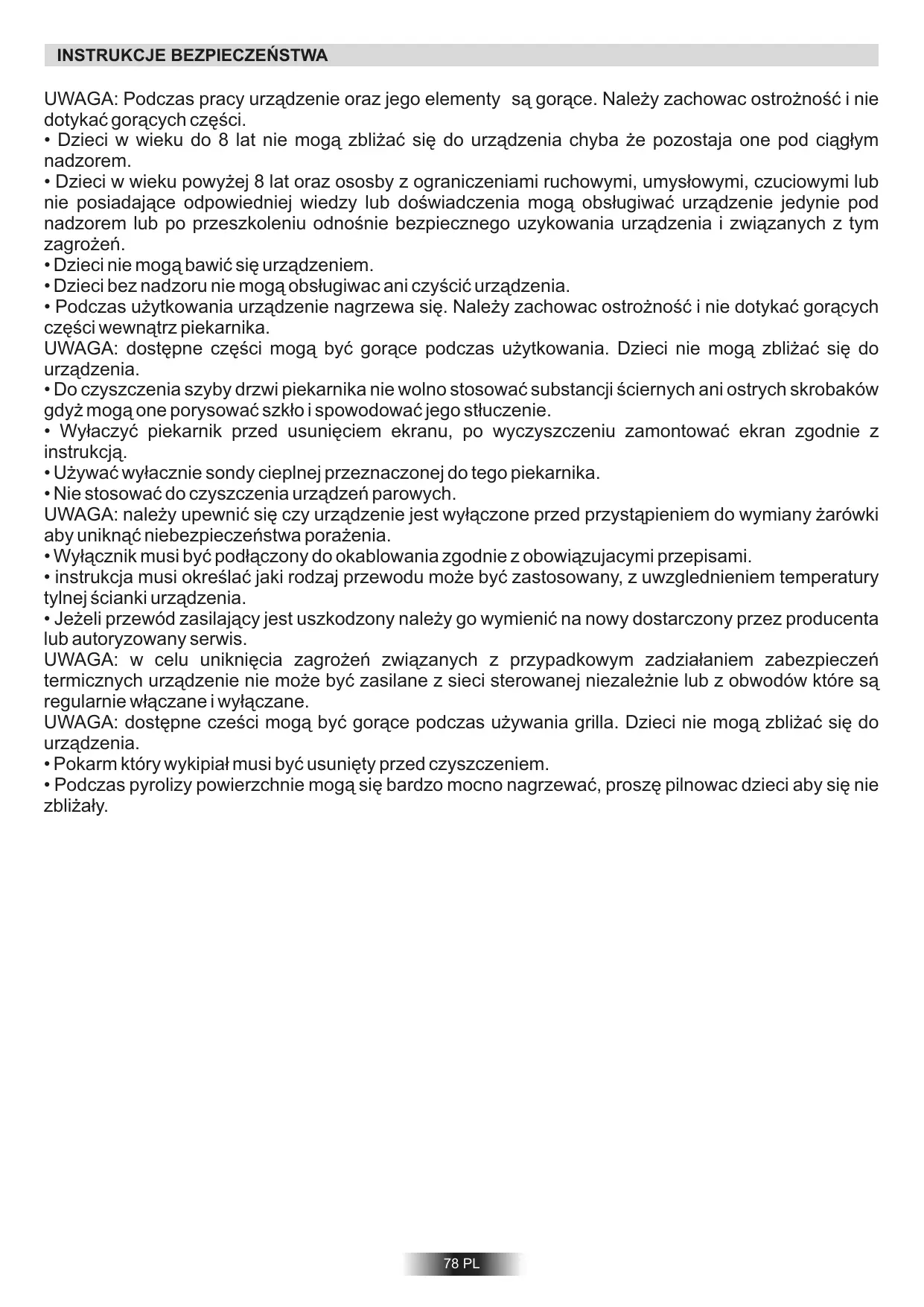 - Podczas pyrolizy powierzchnie mogą się bardzo mocno nagrzewać, proszę pilnowac dzieci aby się nie zbliżały. 78 PL