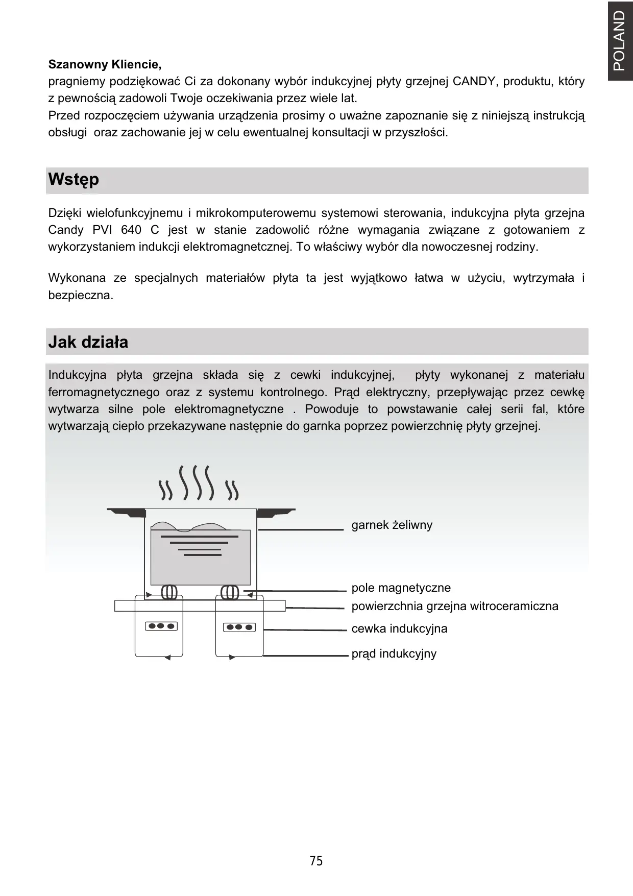 POLAND Szanowny Kliencie, pragniemy podziĊkowaü Ci za dokonany wybór indukcyjnej páyty grzejnej CANDY, produktu, który z pewnoĞcią zadowoli Twoje oczekiwania przez wiele lat. Przed rozpoczĊciem uĪywania urządzenia prosimy o uwaĪne zapoznanie siĊ z niniejszą instrukcją obsáugi oraz zachowanie jej w celu ewentualnej konsultacji w przyszáoĞci. BezpieczeĔstwo Instalacja Niniejsza páyta grzejna przeznaczona jest do uĪytku domowego. Staramy siĊ stale doskonaliü nasze produkty i dlatego zastrzegamy sobie prawo dokonywania zmian w przypadku ewentualnych postĊpów w technice. MontaĪ urządzenia