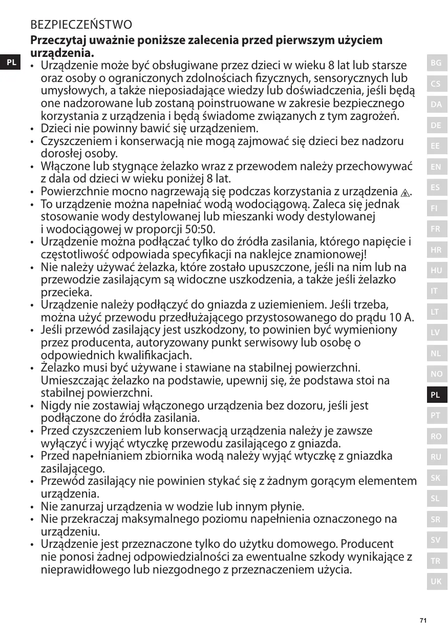 • Cet appareil peut être utilisé par des enfants âgés de 8 ans et plus ainsi que par des personnes dont les facultés physiques, sensorielles ou mentales sont réduites, ou qui manquent d’expérience et de connaissances, à condition qu’elles soient sous la surveillance d’une personne responsable ou aient reçu des instructions concernant l’utilisation correcte de l’appareil et comprennent les dangers inhérents. • Ne laissez pas les enfants jouer avec l’appareil. • Les enfants ne doivent pas effectuer le nettoyage ni la maintenance de l’appareil sans supervision. • Le fer et son cordon doivent être conservés hors de portée des enfants âgés de moins de 8 ans lorsque l’appareil est en cours de fonctionnement ou de refroidissement. • Les surfaces peuvent devenir chaudes pendant l’utilisation . • Ce produit peut être utilisé avec de l’eau du robinet. Il est recommandé d’utiliser de l’eau distillée, ou un mélange composé de 50 % d’eau distillée et de 50 % d’eau du robinet. • L’appareil doit être branché sur un réseau électrique correspondant à la tension et à la fréquence d’alimentation indiquées sur la plaque signalétique. • Le fer ne doit pas être utilisé s’il est tombé, si le fer ou le cordon d’alimentation portent des marques visibles de déterioration ou si le fer présente une fuite. • L’appareil doit être raccordé à la terre. Si nécessaire, il est possible d’utiliser une rallonge compatible 10 A. • Si l’appareil ou le cordon est endommagé, il doit être remplacé par le fabricant, l’un de ses réparateurs ou toute autre personne dûment qualifiée, afin d’éviter tout danger. • Le fer doit être utilisé et posé sur une surface stable. Lorsque le fer est placé sur son support, veillez à ce que la surface sur laquelle est placé le support soit stable. • Ne jamais laisser l’appareil sans surveillance lorsqu’il est raccordé à l’alimentation électrique. • Lorsqu’il n’est plus utilisé, éteindre et débrancher l’appareil avant de le nettoyer ou de procéder à son entretien. • Débrancher la fiche de la prise avant de remplir le réservoir d’eau. • Le cordon d’alimentation ne doit jamais entrer en contact avec les parties chaudes de l’appareil. • Ne pas plonger l’appareil dans l’eau ni dans aucun autre liquide. • Ne pas dépasser le niveau maximum de remplissage indiqué sur l’appareil. • Cet appareil est exclusivement destiné à un usage domestique. Le fabricant décline toute responsabilité en cas de dommages résultant d’une utilisation incorrecte de l’appareil.