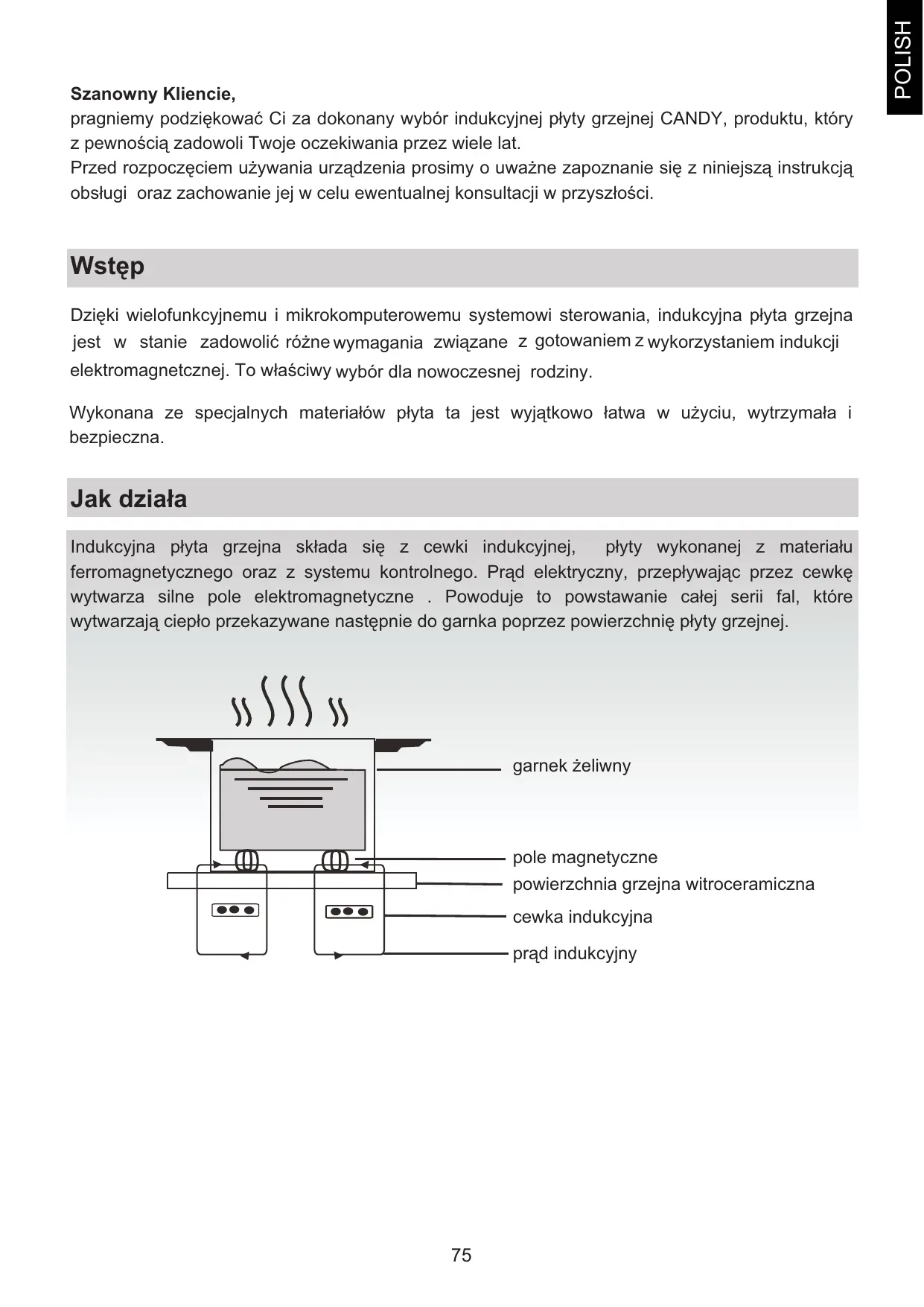 POLISH Szanowny Kliencie, pragniemy podziĊkowaü Ci za dokonany wybór indukcyjnej páyty grzejnej CANDY, produktu, który z pewnoĞcią zadowoli Twoje oczekiwania przez wiele lat. Przed rozpoczĊciem uĪywania urządzenia prosimy o uwaĪne zapoznanie siĊ z niniejszą instrukcją obsáugi oraz zachowanie jej w celu ewentualnej konsultacji w przyszáoĞci. BezpieczeĔstwo Instalacja Niniejsza páyta grzejna przeznaczona jest do uĪytku domowego. Staramy siĊ stale doskonaliü nasze produkty i dlatego zastrzegamy sobie prawo dokonywania zmian w przypadku ewentualnych postĊpów w technice. MontaĪ urządzenia